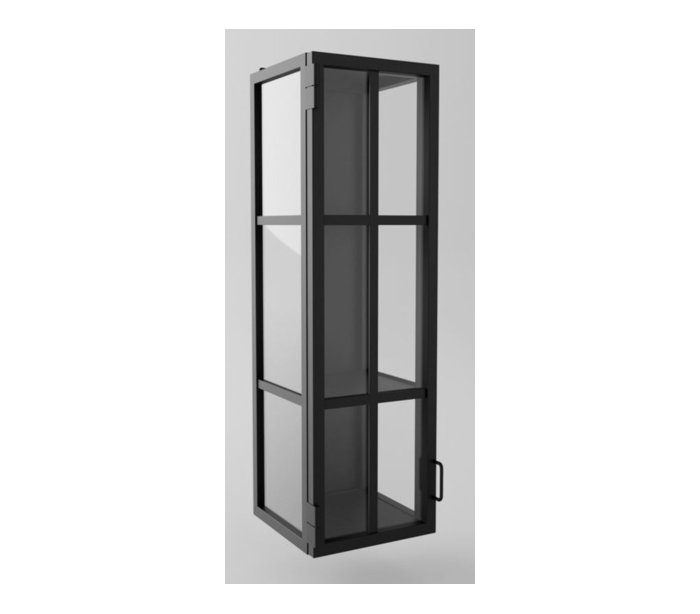 Væghængt vitrineskab udført i et industrielt design i sortlakeret stål og med lamineret sikkerhedsglas. Vitrineskabet måler 100 x 30 cm i højde og bredde.