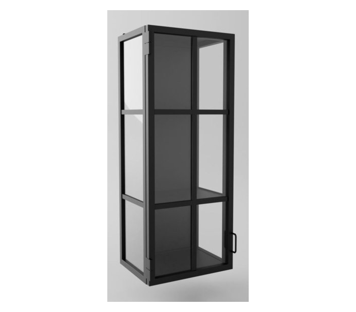 Væghængt vitrineskab udført i et industrielt design i sortlakeret stål og med lamineret sikkerhedsglas. Vitrineskabet måler 100 x 40 cm i højde og bredde.