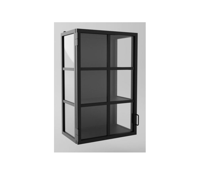 Væghængt vitrineskab udført i et industrielt design i sortlakeret stål og med lamineret sikkerhedsglas. Vitrineskabet måler 80 x 50 cm i højde og bredde.