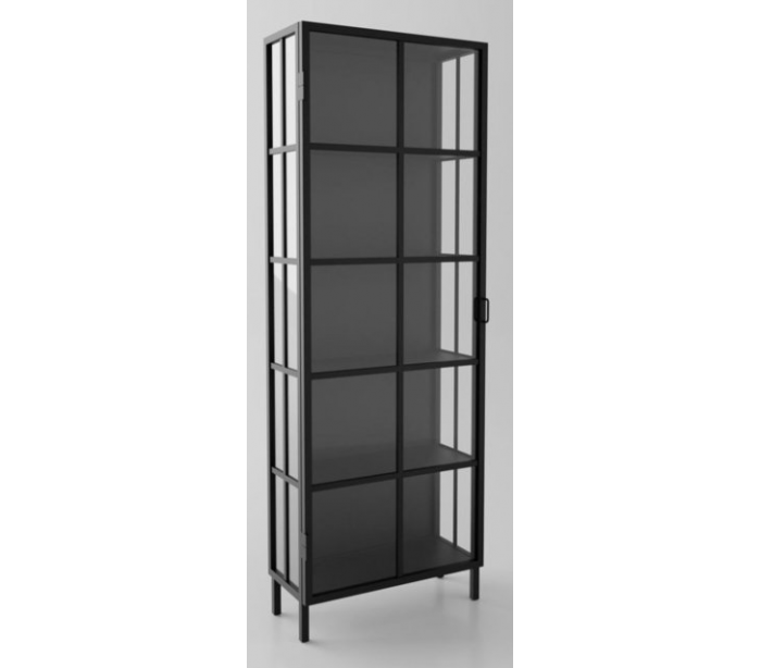 Vitrineskab udført i et industrielt design i sortlakeret stål og med lamineret sikkerhedsglas. Vitrineskabet måler 198 x 70 cm i højde og bredde.
