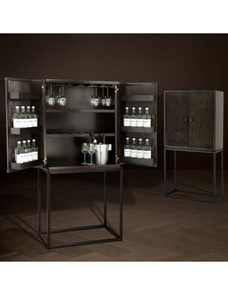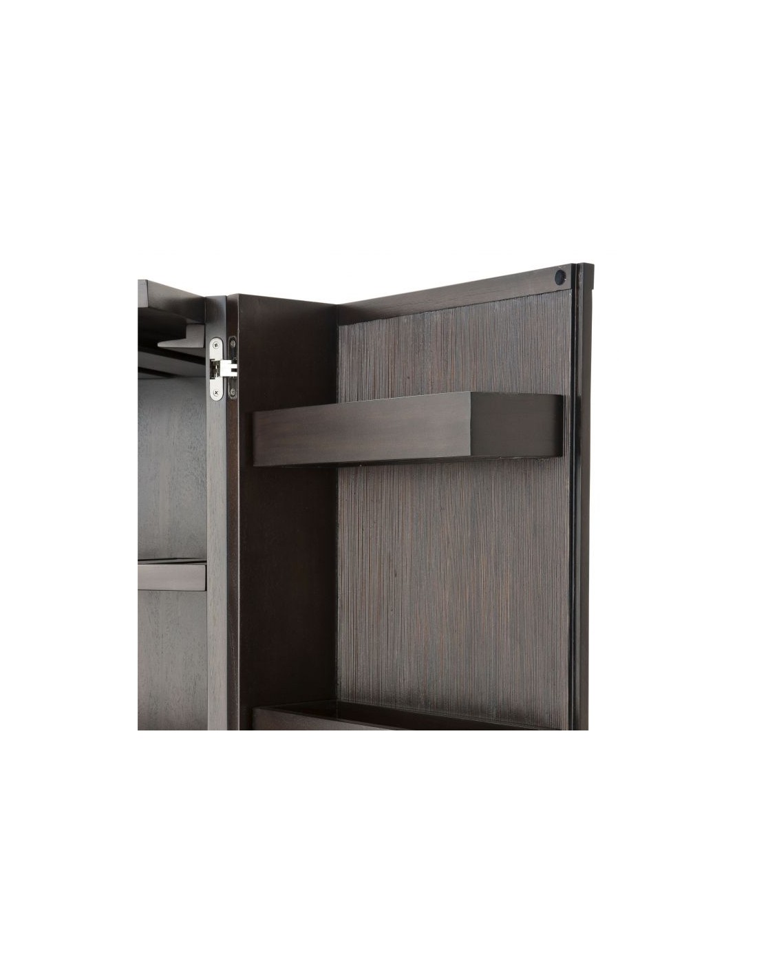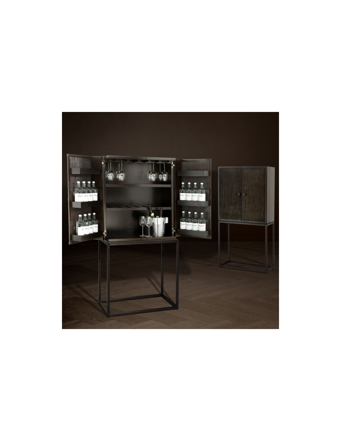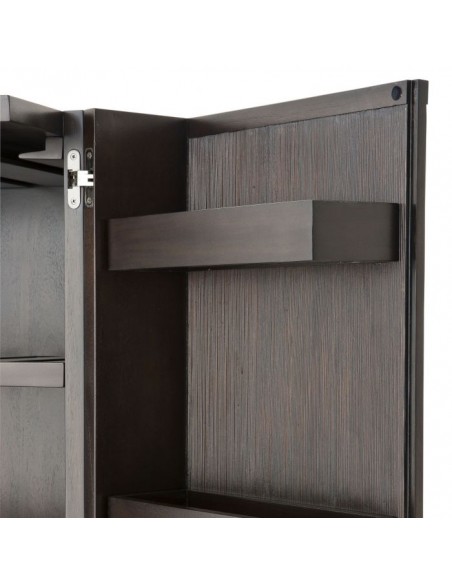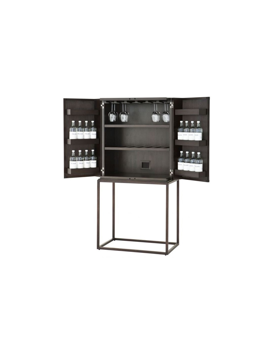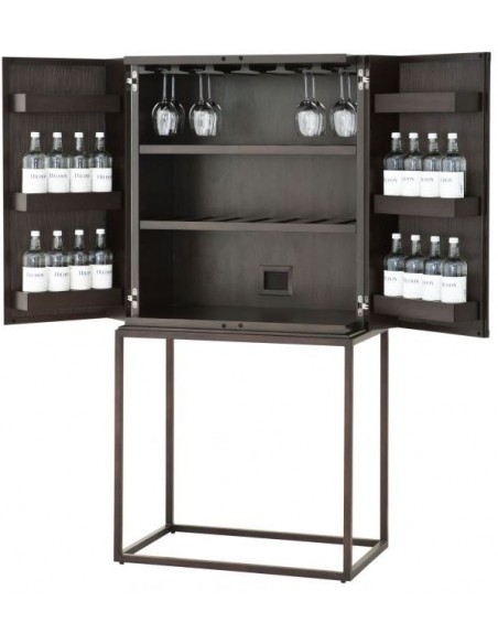Eichholtz DeLaRenta vinskab eller vinkabinet, udført i et moderne design af kaffefarvet mahognitræ, mahognifinér og bronzelakeret stål. Vinskabet måler 168 cm i højden og 81 x 50,5 cm i bredde og dybde. Vinskabet indeholder plads til vinflasker samt ophæng af glas.