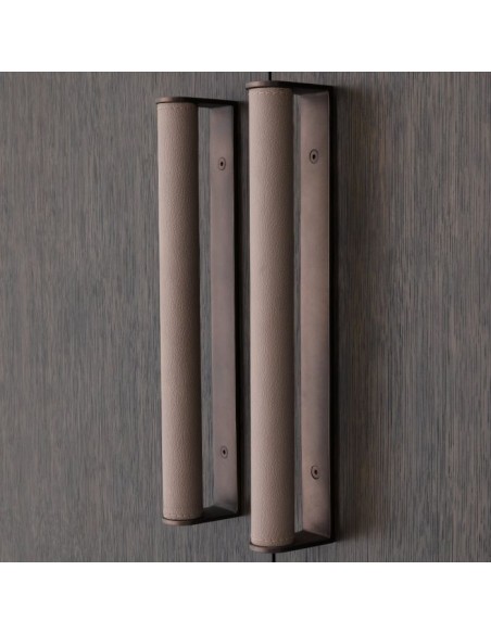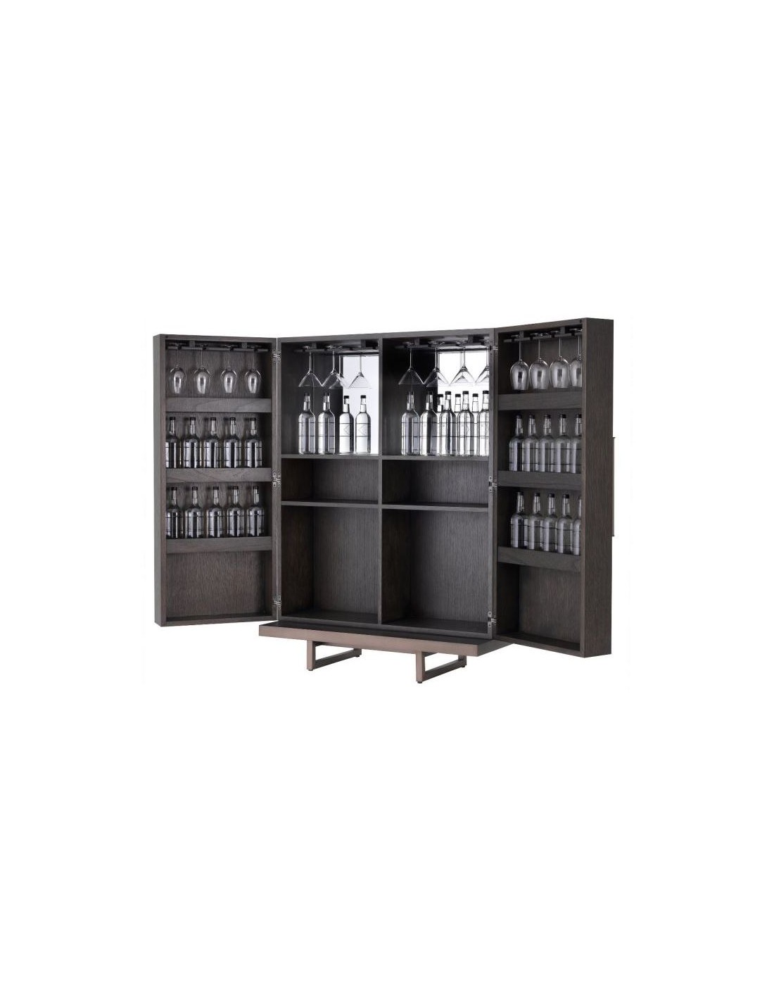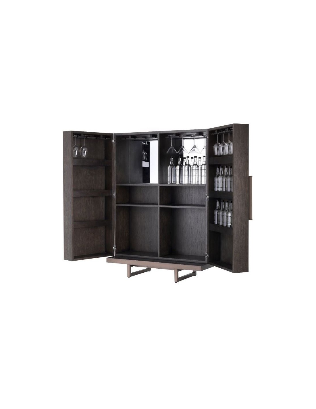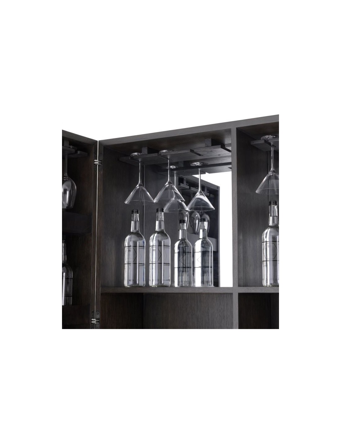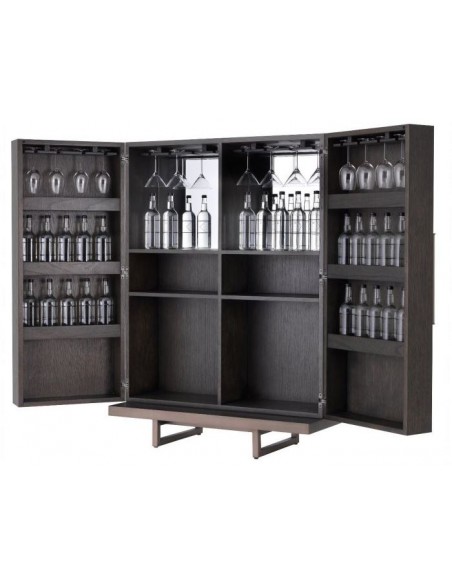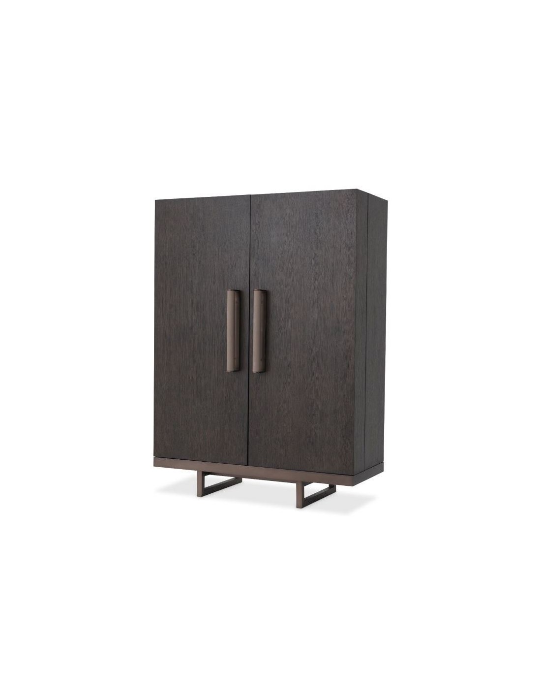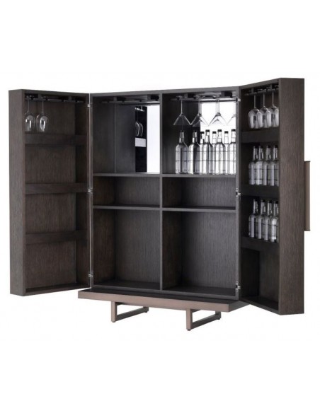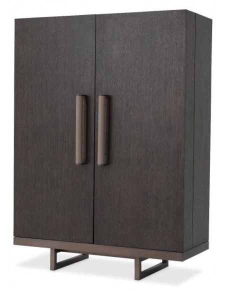 Eichholtz Harrison vinskab eller vinkabinet, udført i et moderne design af mokkafarvet mahognitræ og egetræsfinér og med stel i bronzelakeret stål. Håndtagene er i grå læderlook. Vinskabet måler 151,5 cm i højden og 110 x 52 cm i bredde og dybde. Vinskabet indeholder plads til vinflasker samt ophæng af glas.