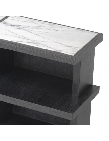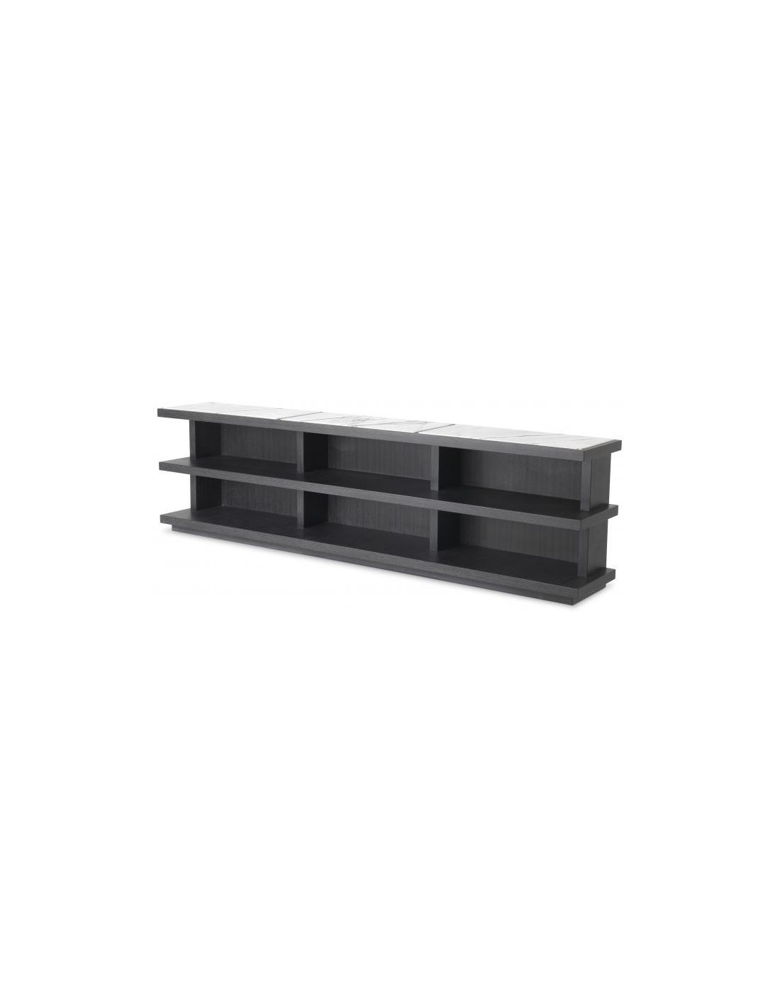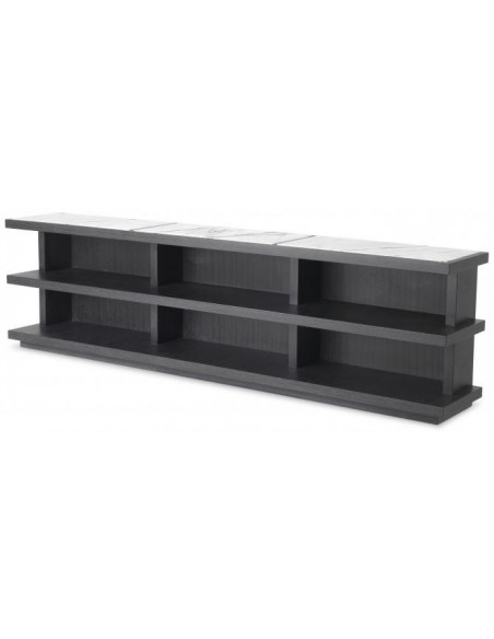 Eichholtz Miguel M sideboard eller reol, udført i et moderne design af kulgrå egetræsfinér og gråhvid marmor. Sideboardet måler 60,5 cm i højden og 220 x 35 cm i bredde og dybde. Sideboardet indeholder 6 hylderum, og passer perfekt bag en fritstående sofa.