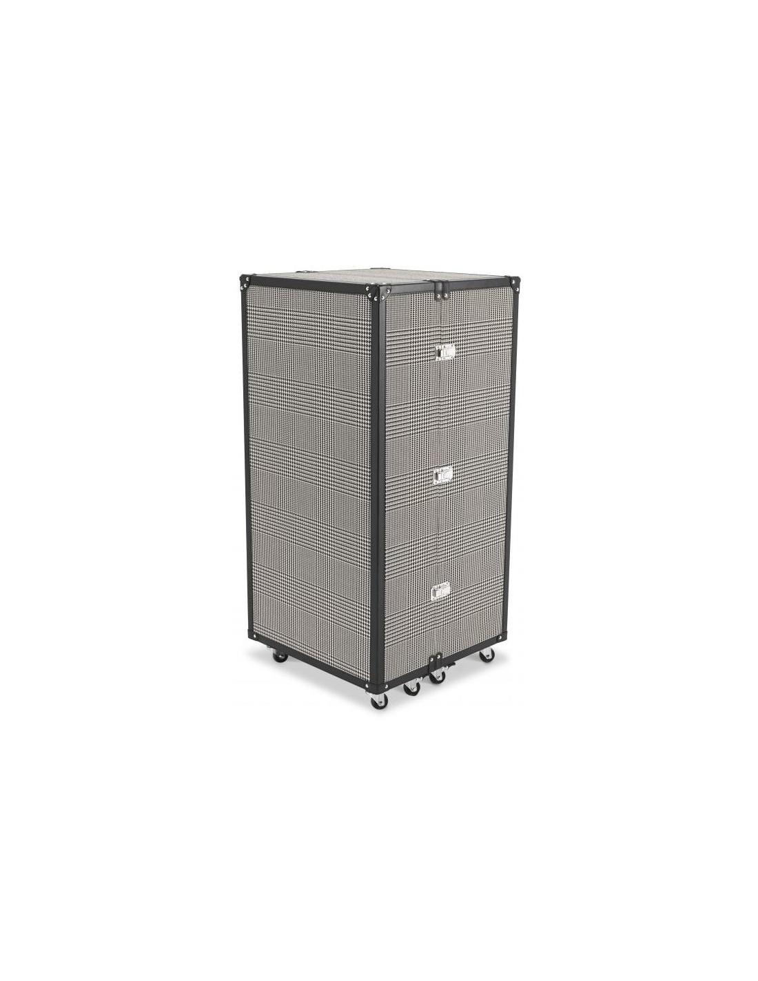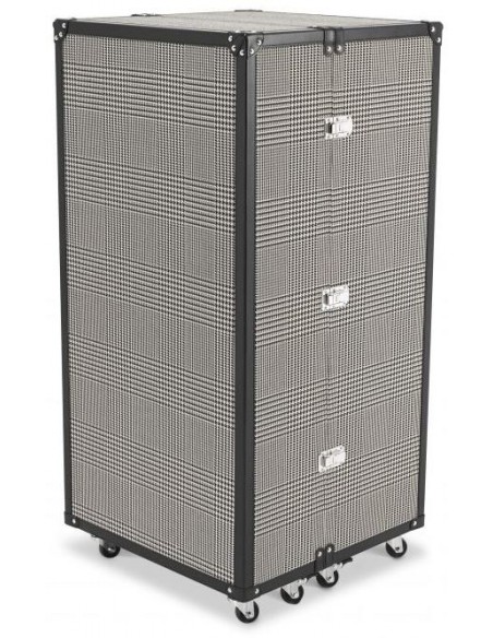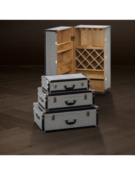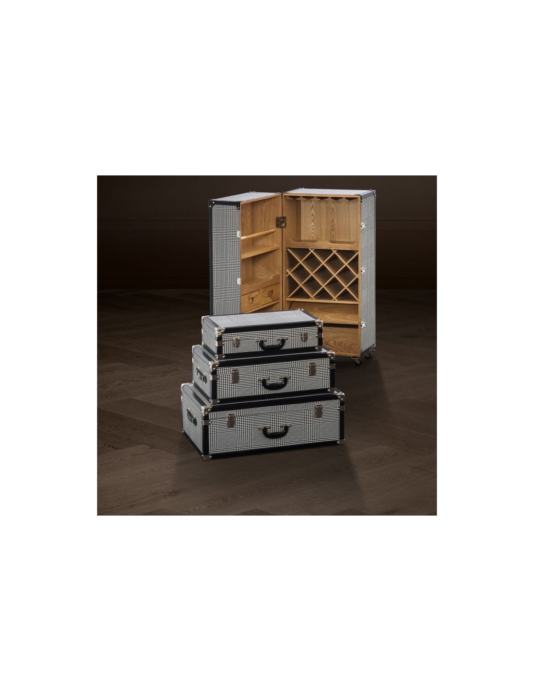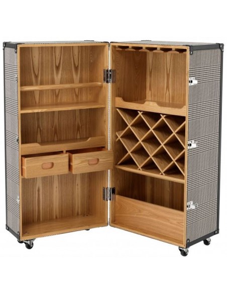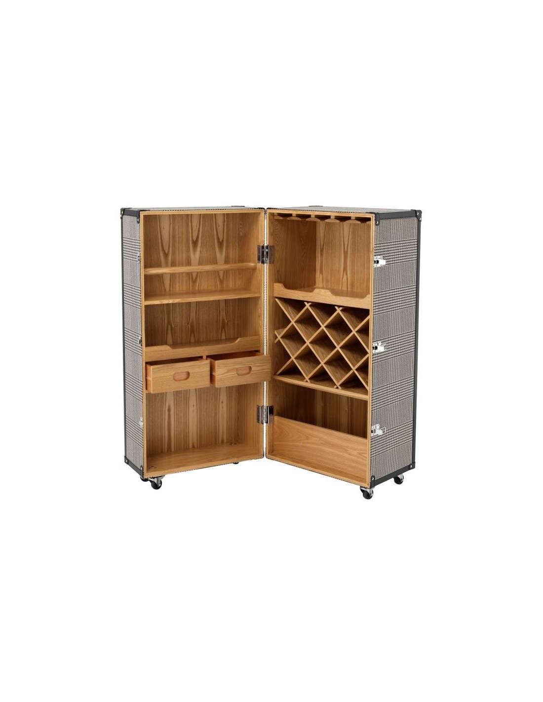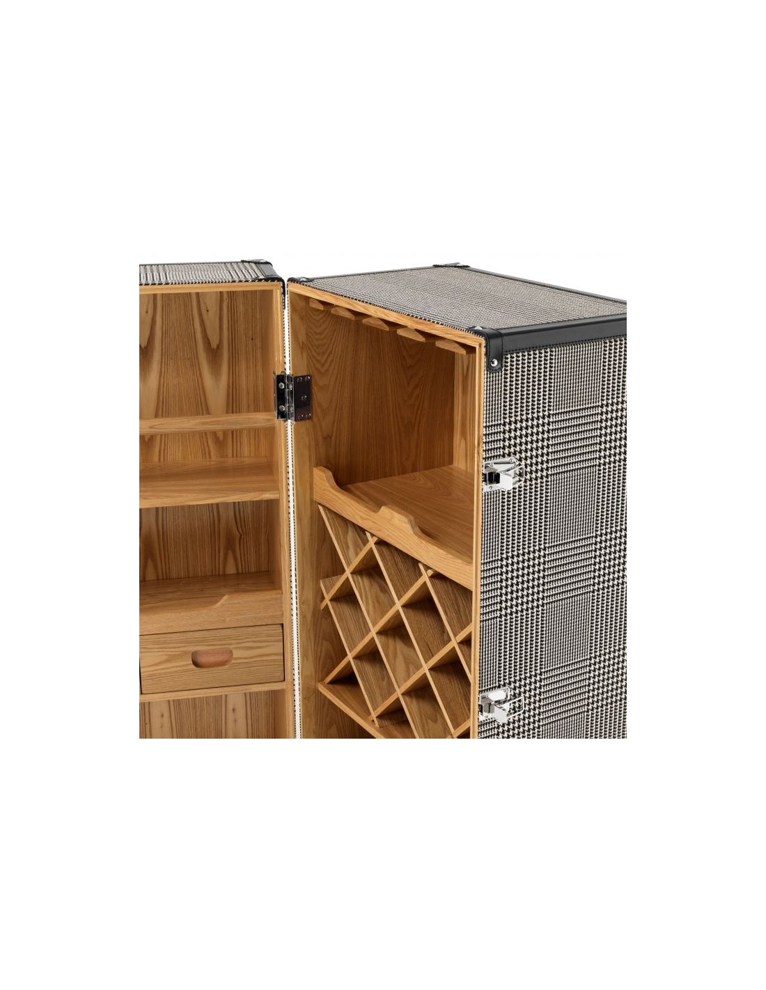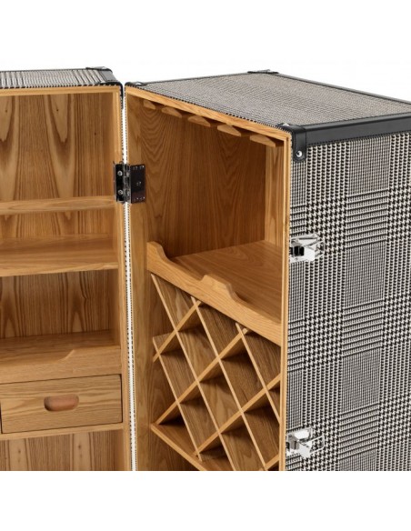 Eichholtz Martini Bianco transportabelt vinskab eller vinkabinet, udført i et moderne design af sort og hvid tekstil og med inderside i ask finér. Vinskabet måler 122 cm i højden og 59 x 59 cm i bredde og dybde. Vinskabet indeholder plads til vinflasker samt ophæng af glas.