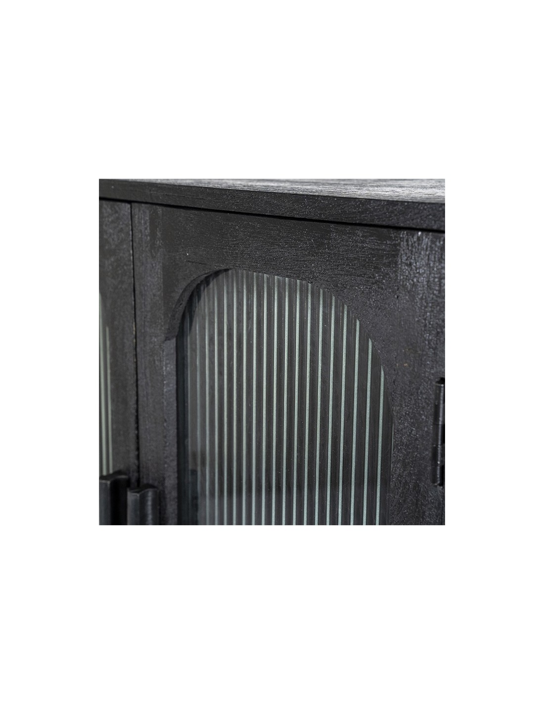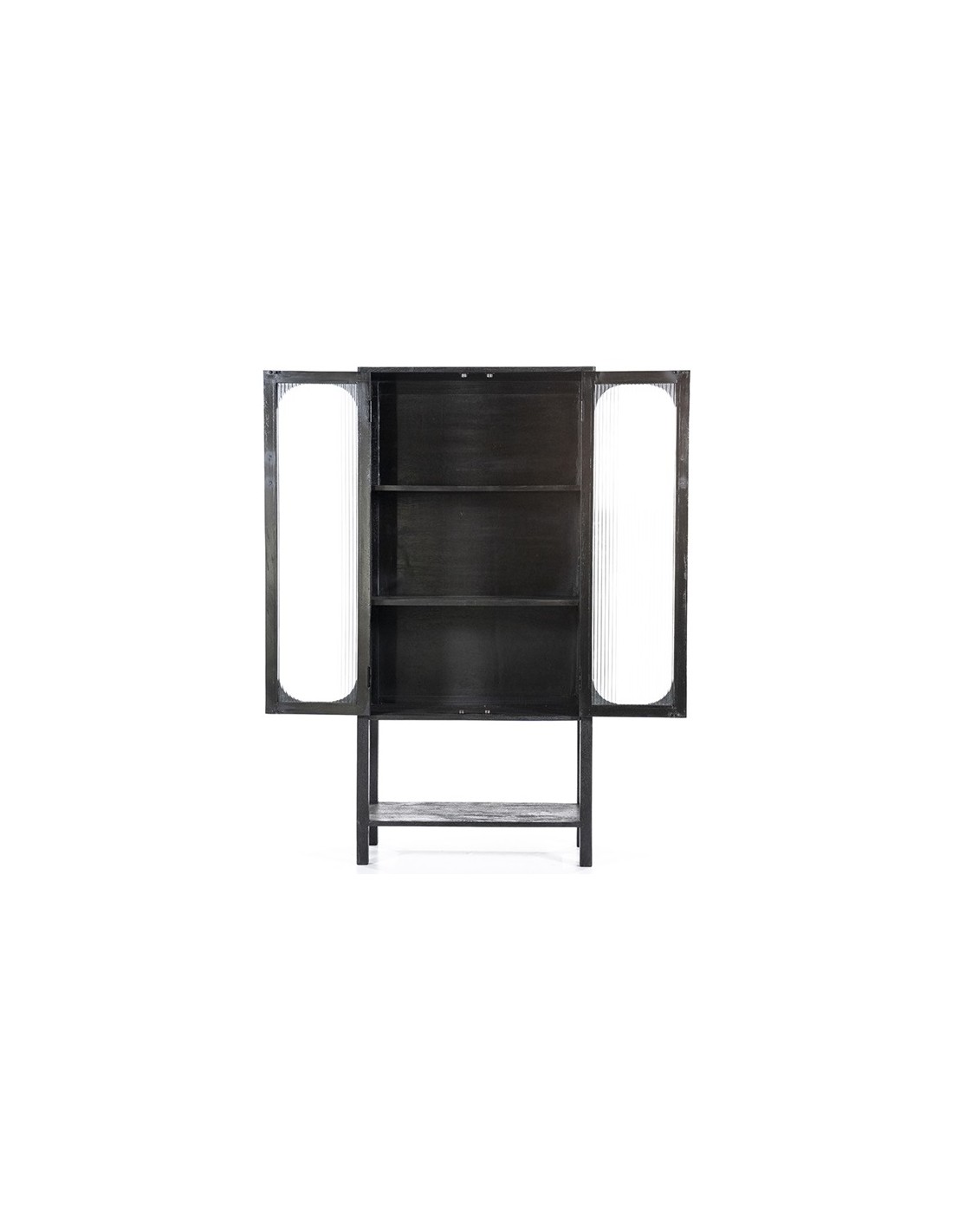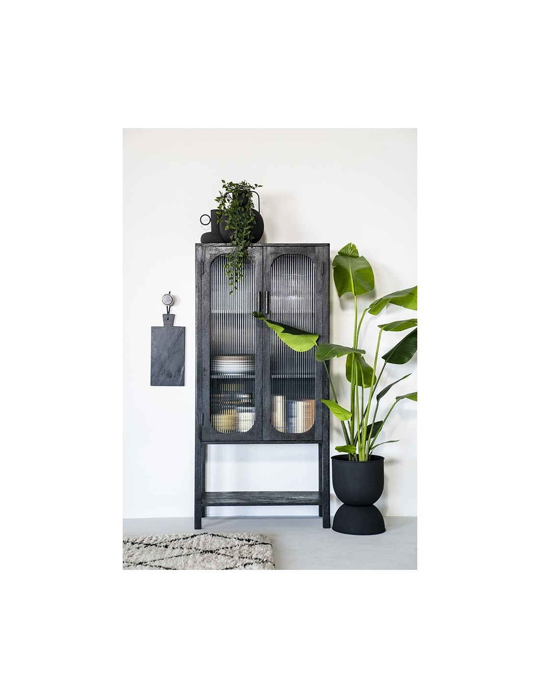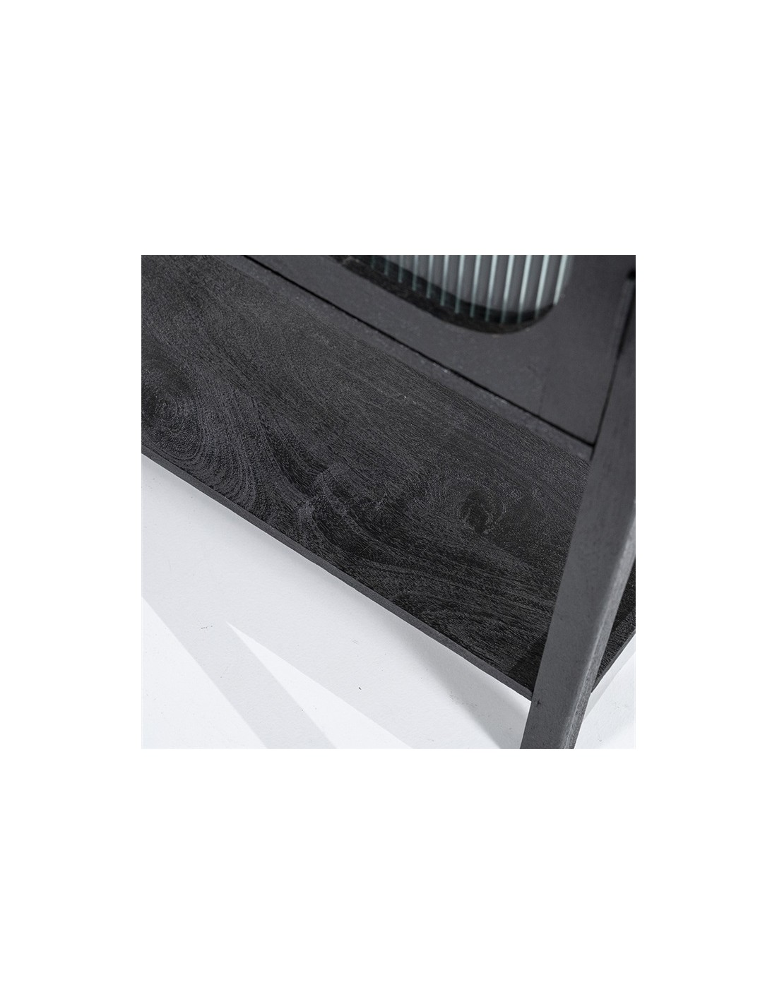Eden vitrineskab udført i et design af sandblæst sortlakeret mangotræ og bambus, med ruder i klart rillet glas. Vitrineskabet måler 160 cm i højden og 75 cm i bredden. Skabet indeholder 2 hylder (ikke justérbare).