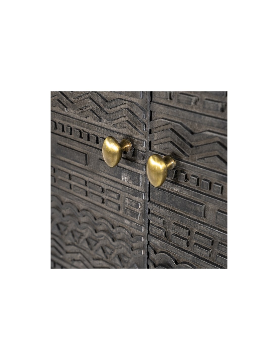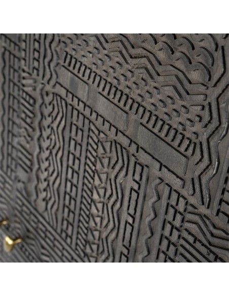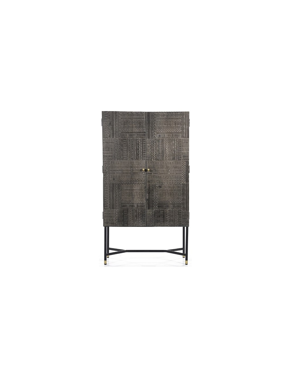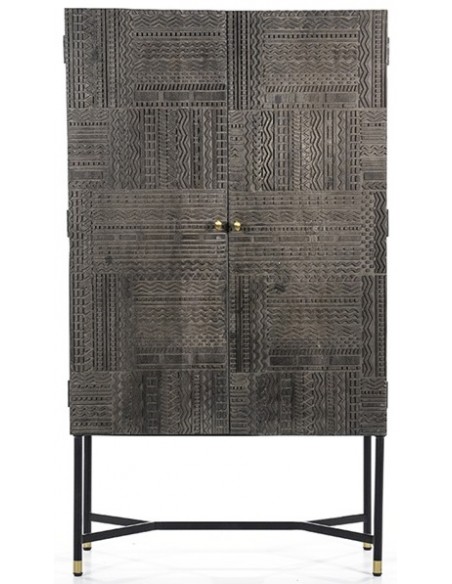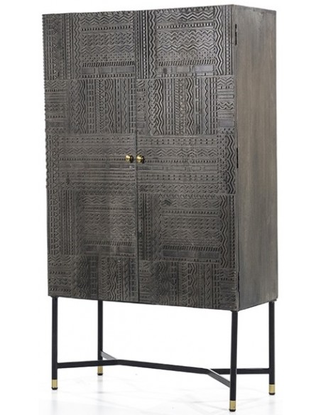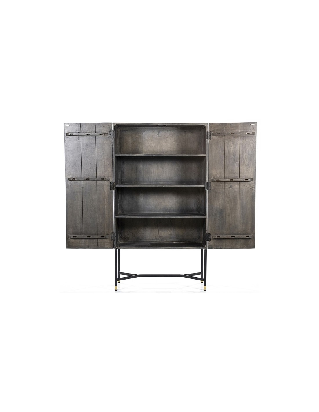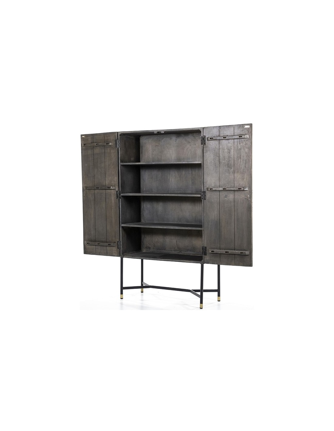 Vitrineskab udført i et rustikt design af sortlakeret metal og mørkegrå lakeret mangotræ. Vitrineskabet måler 160 cm i højden og 90 x 40 cm i bredde og dybde. Vitrineskabet indeholder 4 hylderum.