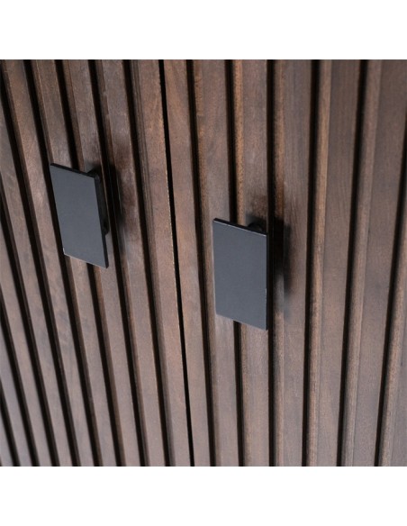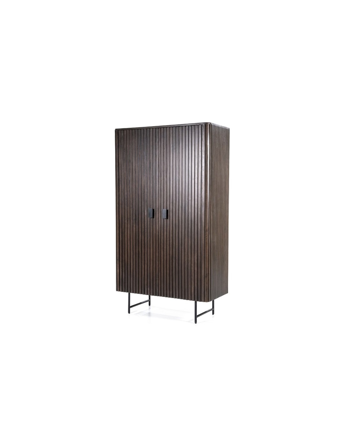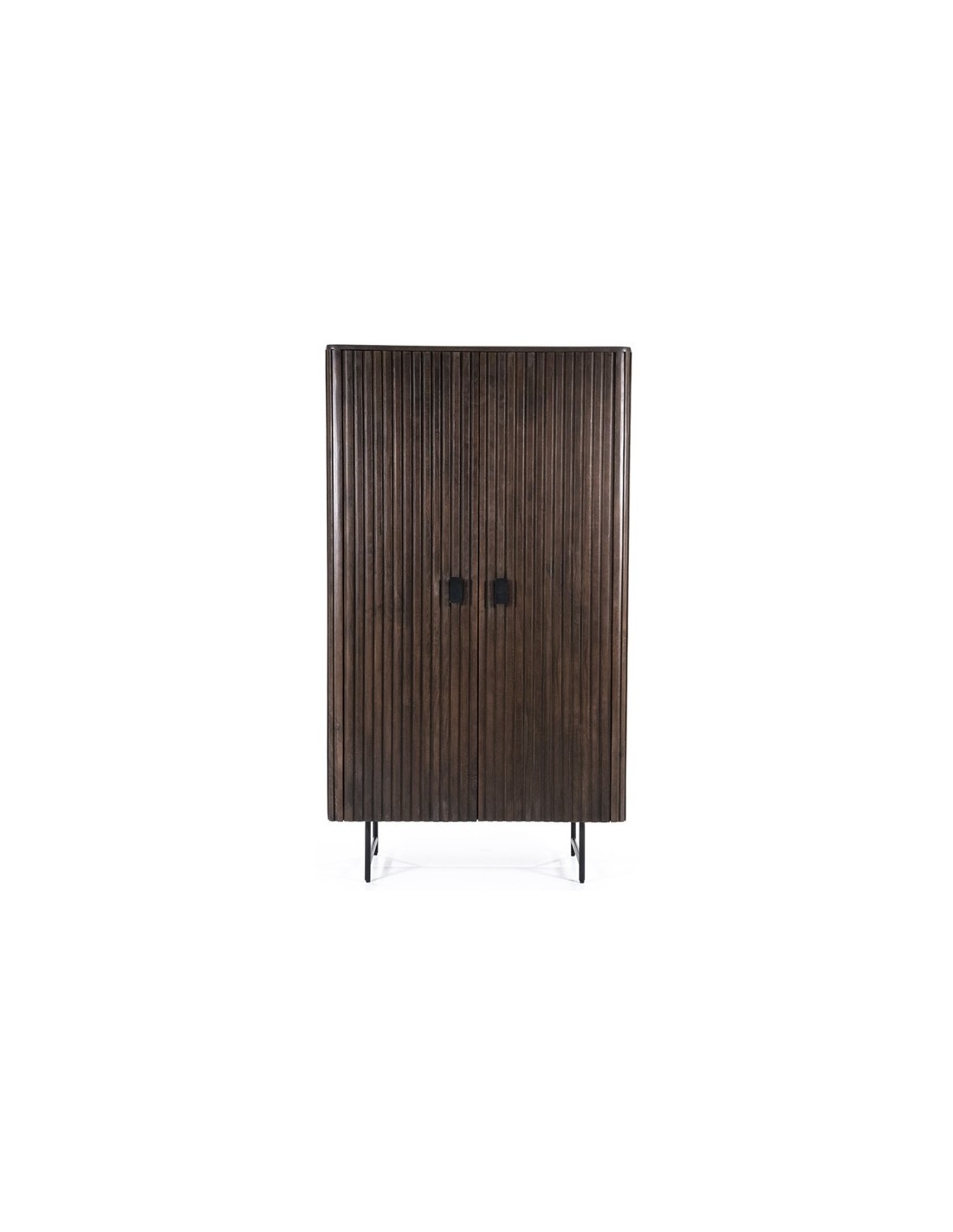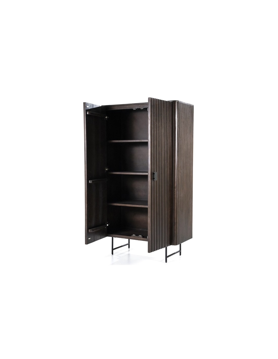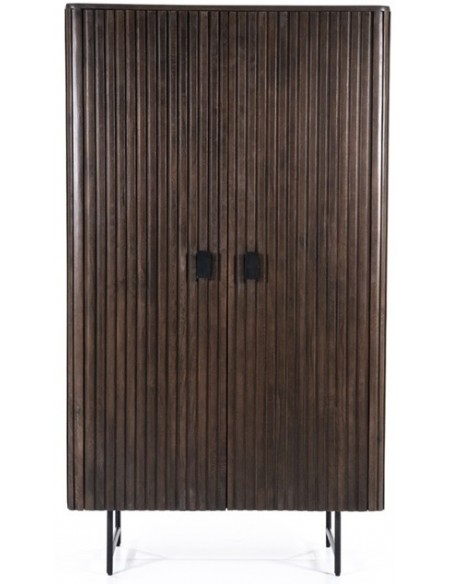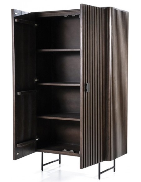 Vitrineskab udført i et rustikt design af sortlakeret metal og mørkebrun lakeret mangotræ. Vitrineskabet måler 170 cm i højden og 96 x 45 cm i bredde og dybde. Vitrineskabet indeholder 4 hylderum.