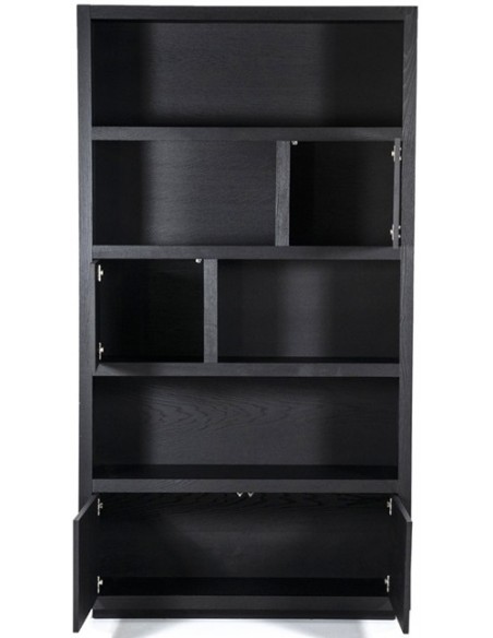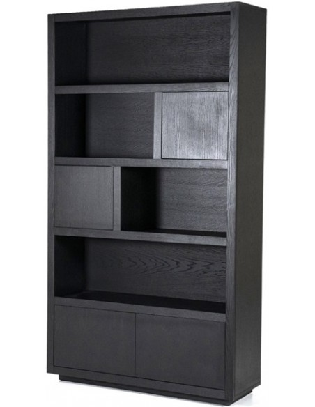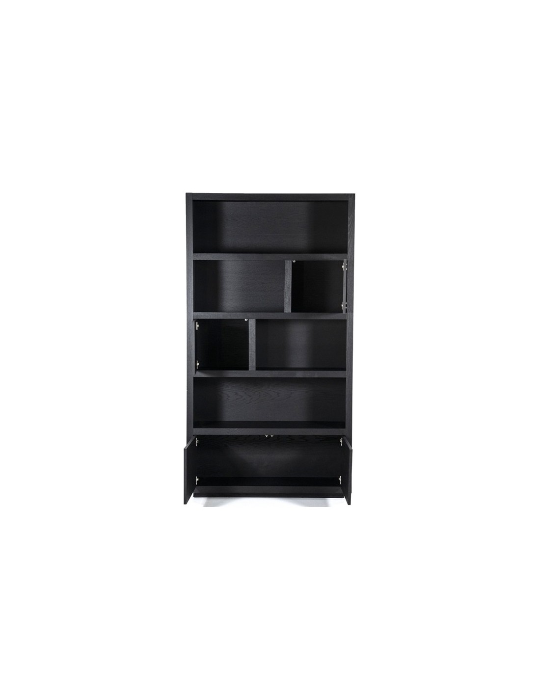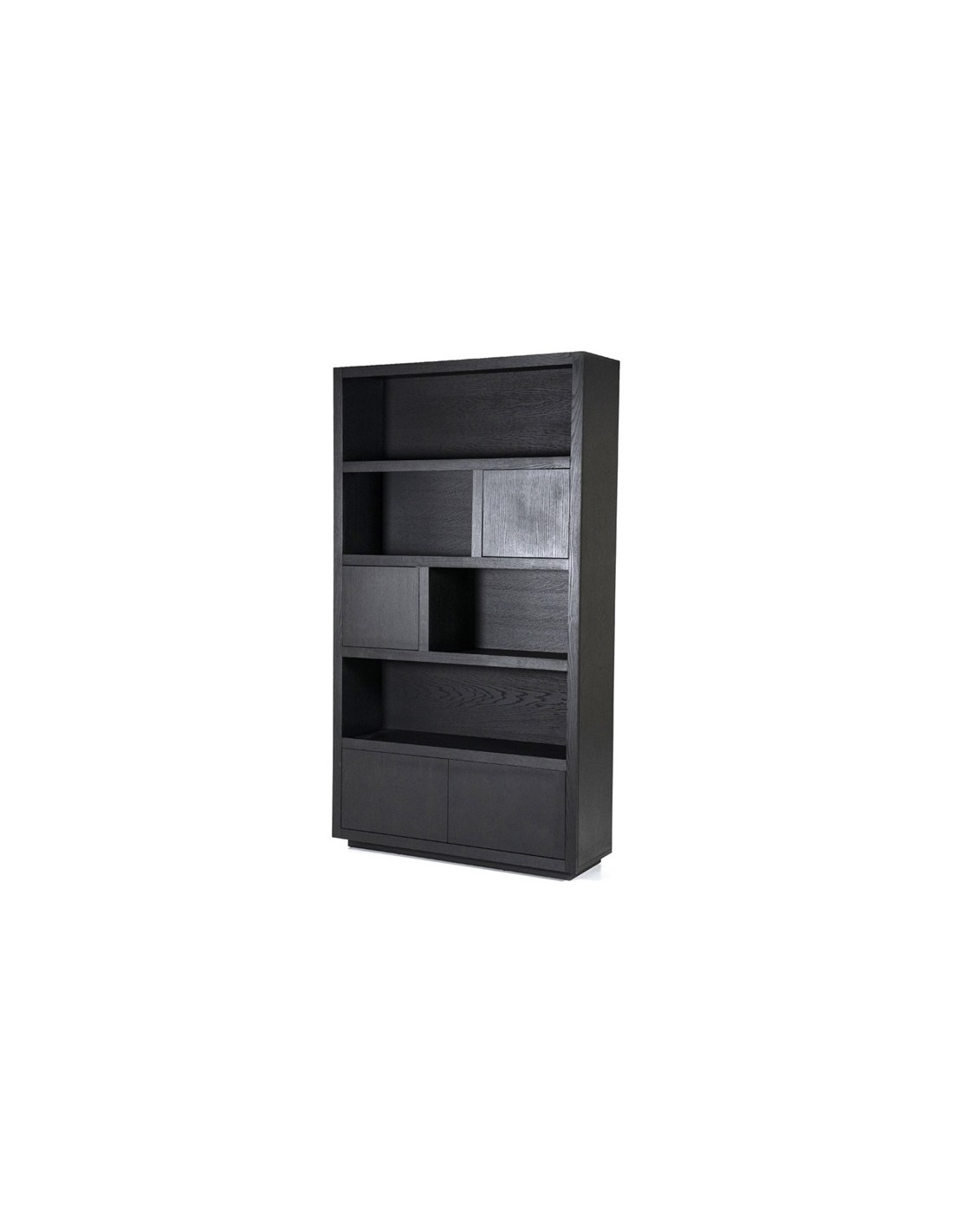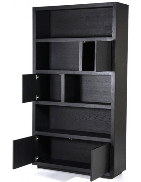 Vitrineskab udført i et design af sortlakeret egetræ. Vitrineskabet måler 220 cm i højden og 120 x 42 cm i bredde og dybde. Skabet indeholder 4 åbne hylderum samt 4 skabe, hvert med 1 opbevaringsrum.