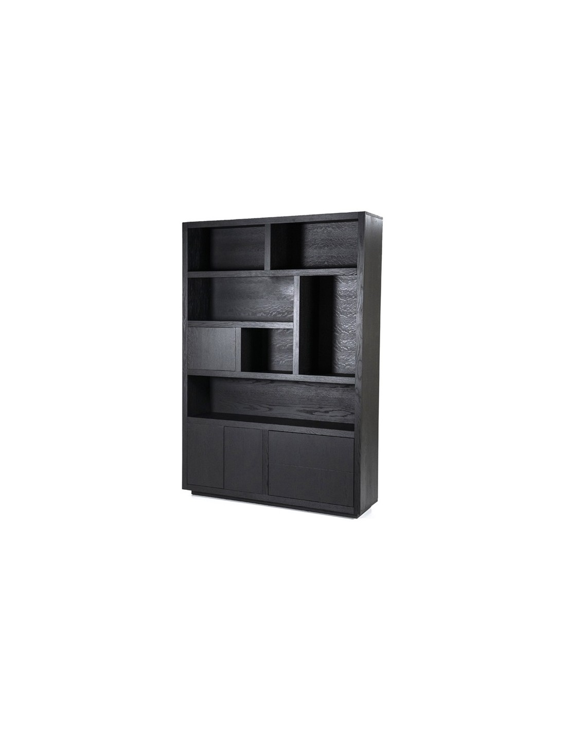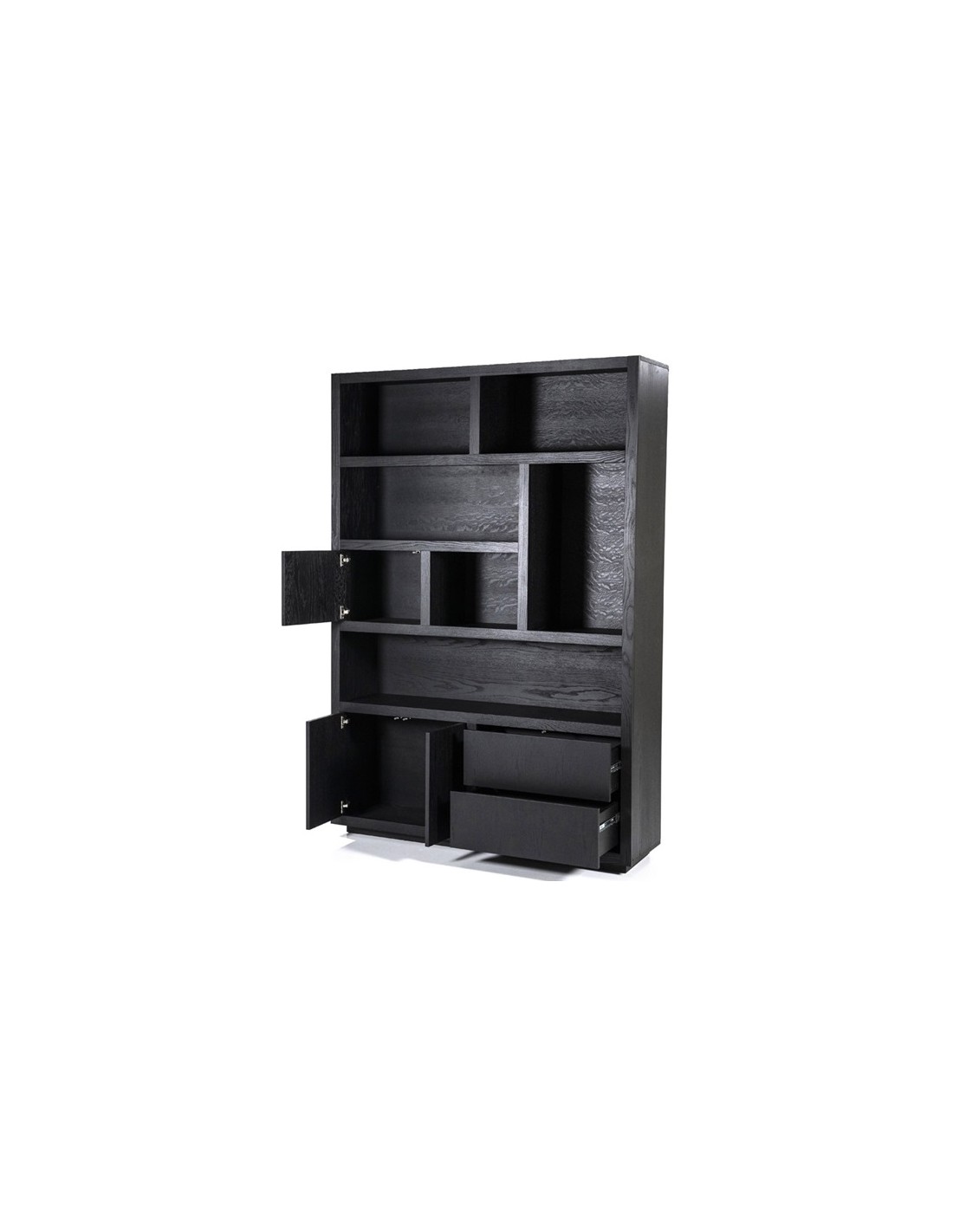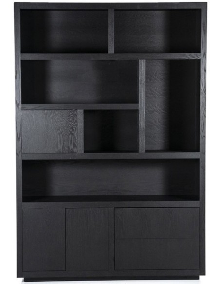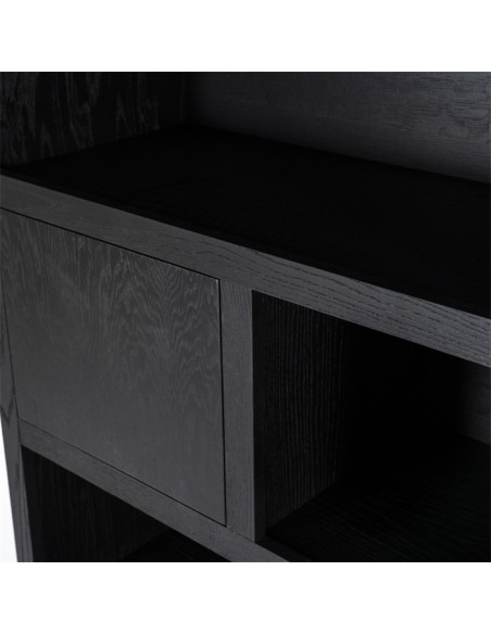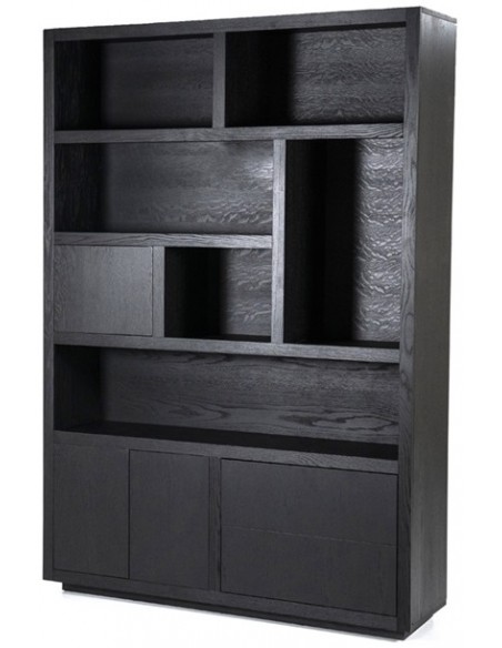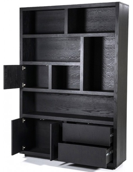 Vitrineskab udført i et design af sortlakeret egetræ. Vitrineskabet måler 220 cm i højden og 150 x 42 cm i bredde og dybde. Skabet indeholder 6 åbne hylderum, 2 skuffer samt 3 skabe.