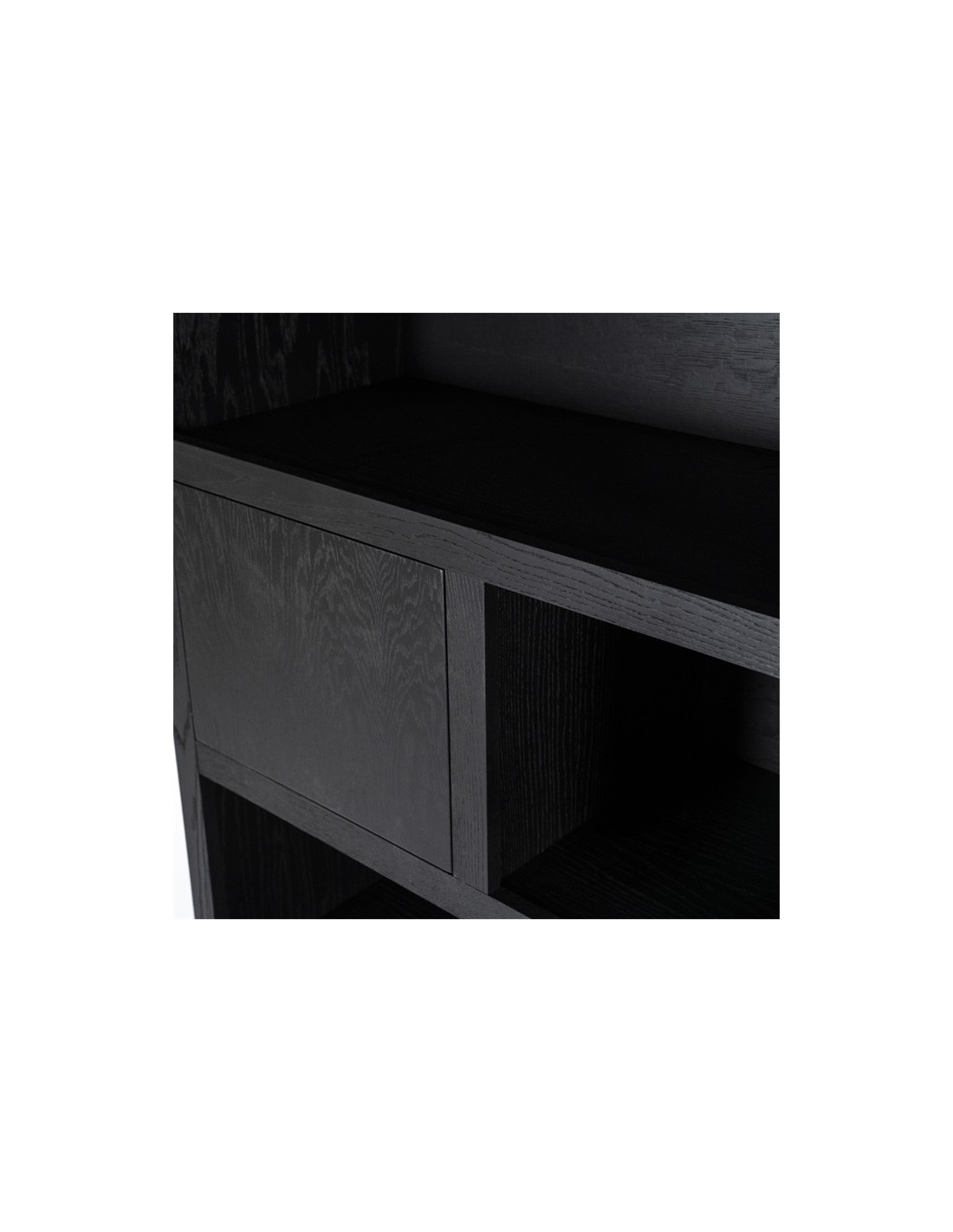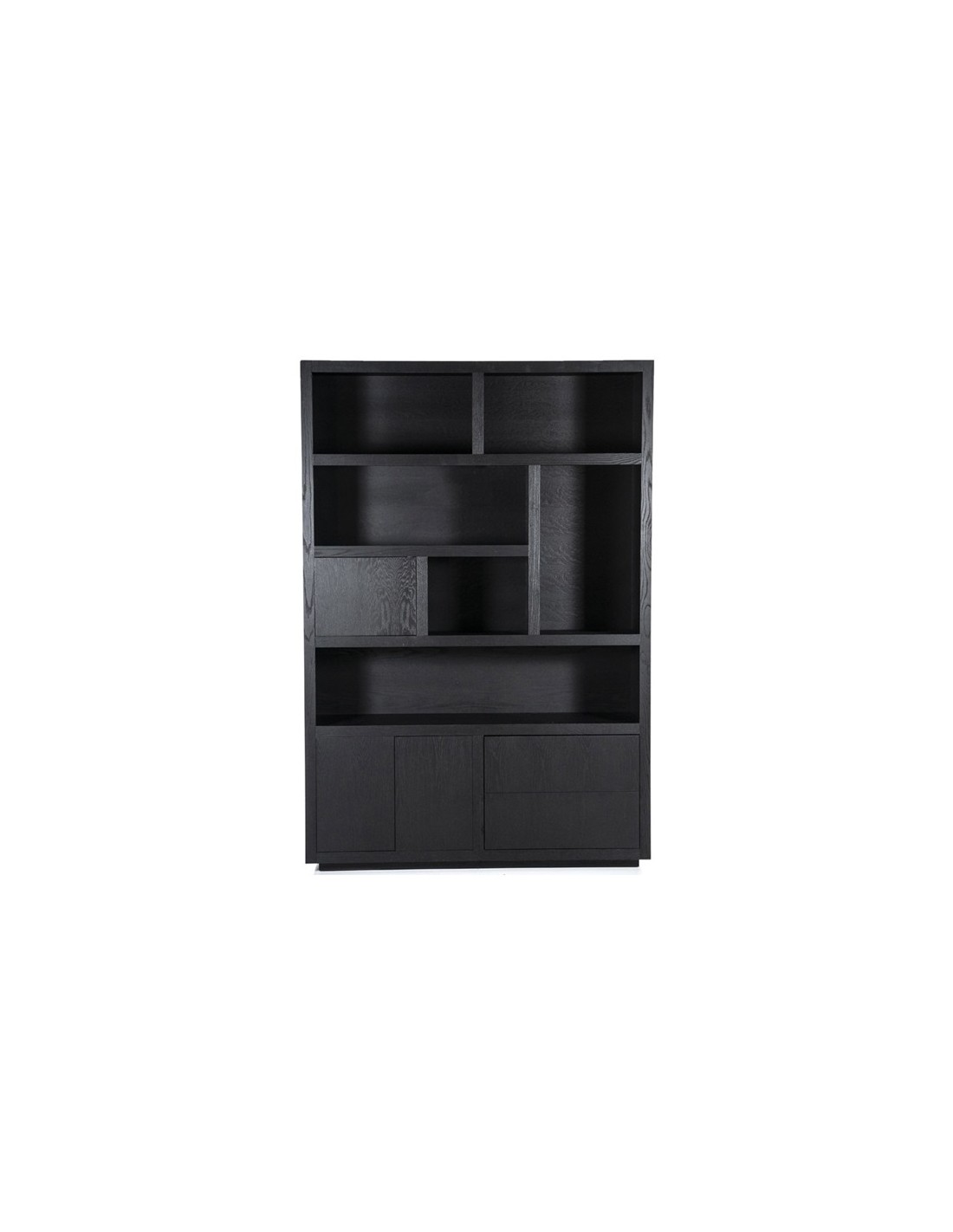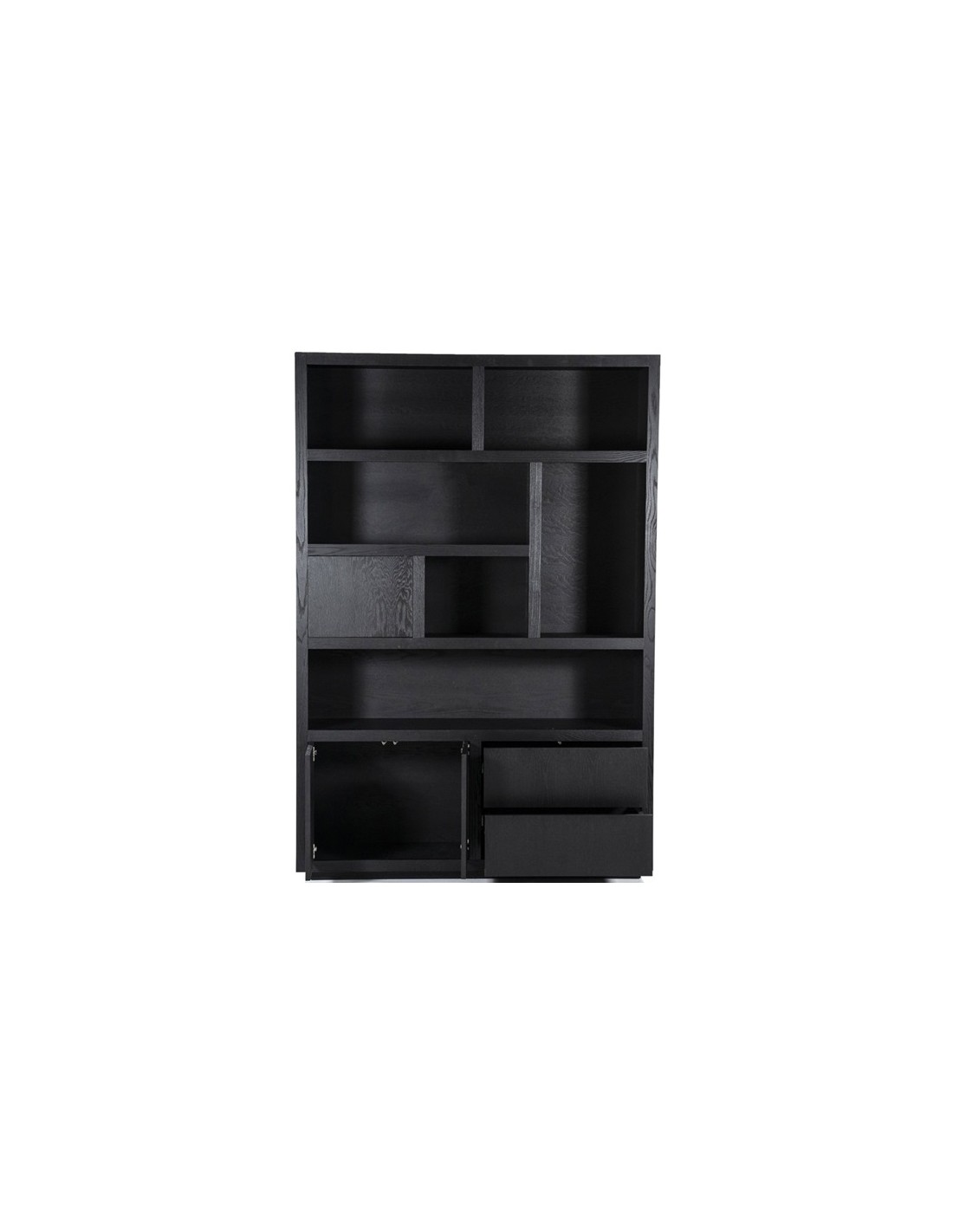 Vitrineskab udført i et design af sortlakeret egetræ. Vitrineskabet måler 220 cm i højden og 150 x 42 cm i bredde og dybde. Skabet indeholder 6 åbne hylderum, 2 skuffer samt 3 skabe.