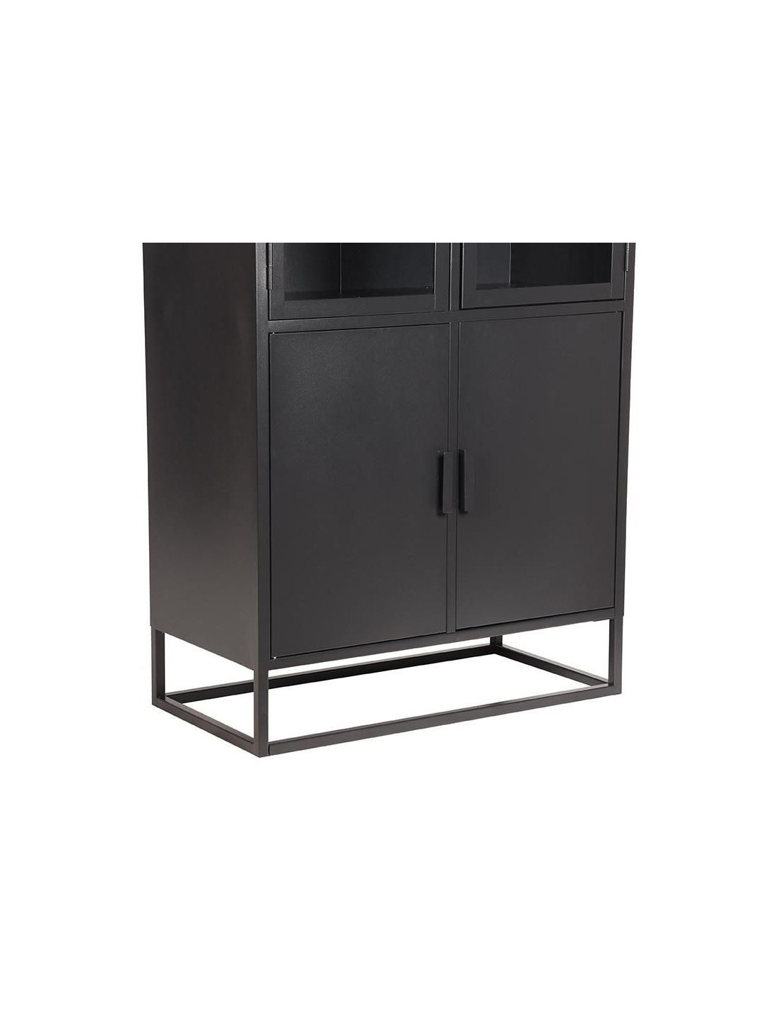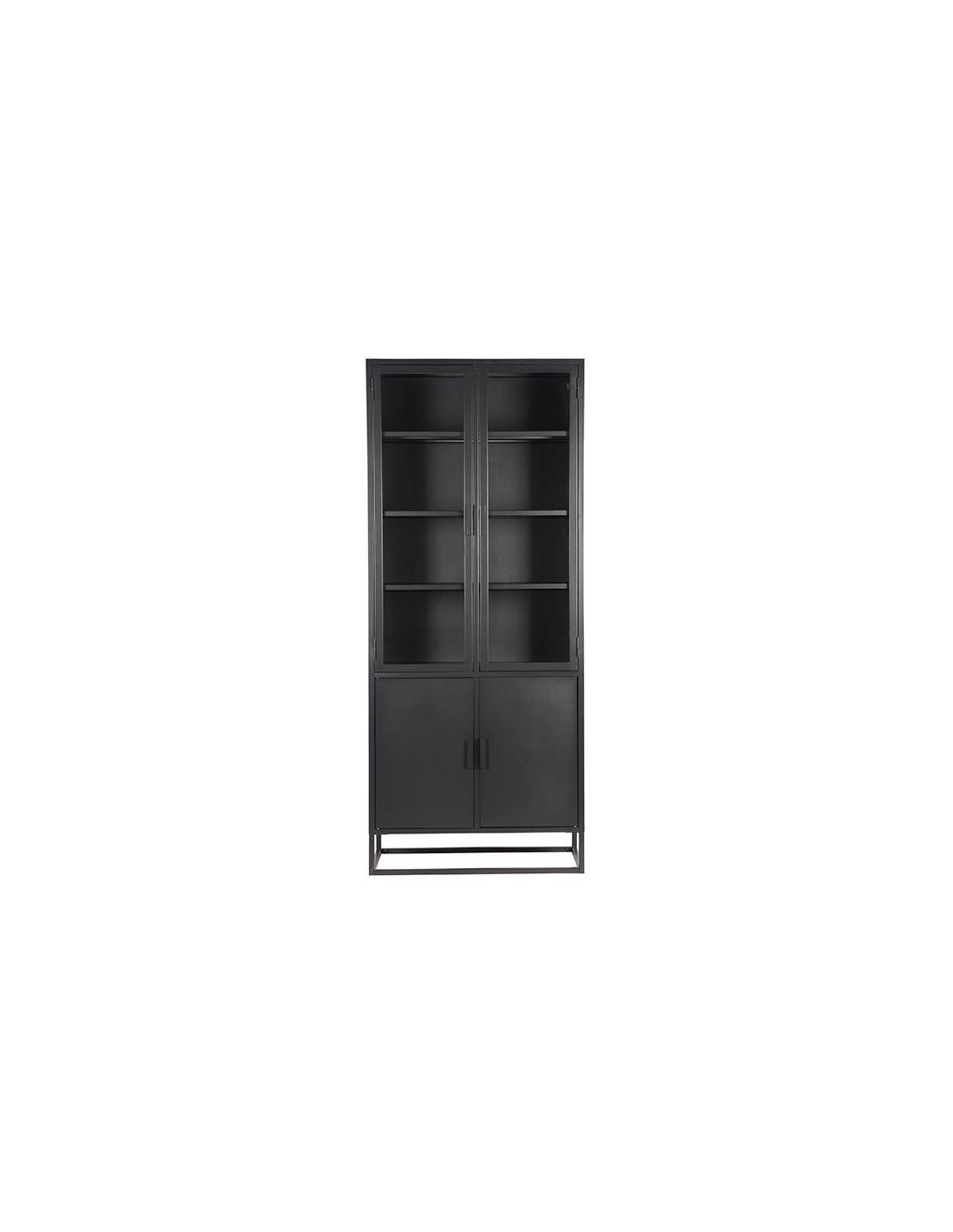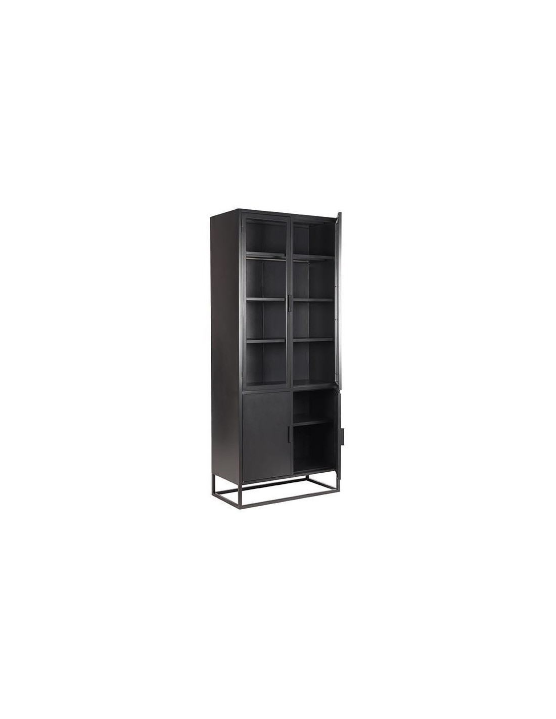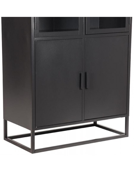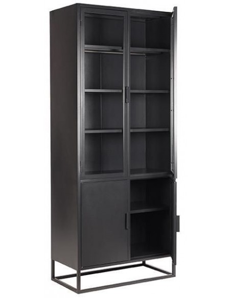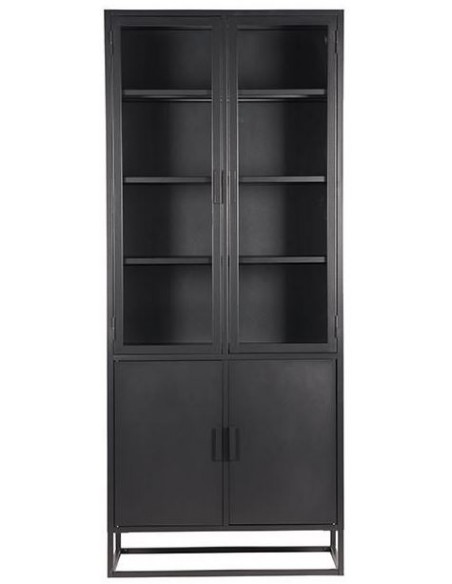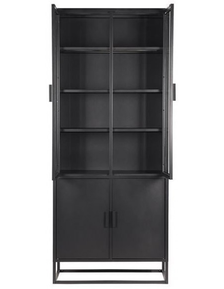 Vitrineskab udført i et industrielt design, fremstillet i industrielt sortlakeret metal og klart glas. I skabet forefindes 3 + 1 hylder. Skabet måler 190 cm i højden og 80 x 40 cm i bredde og dybde.