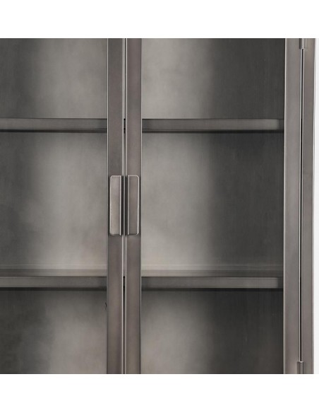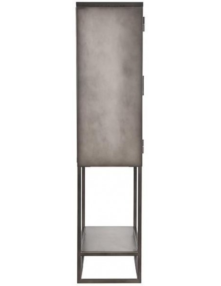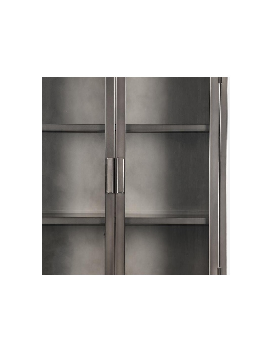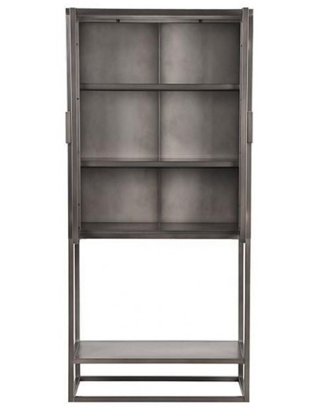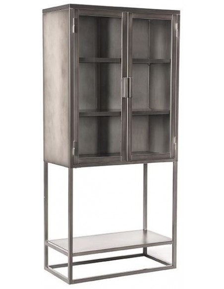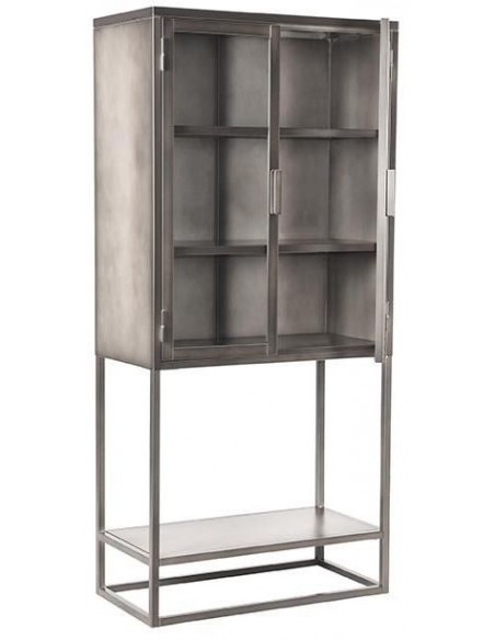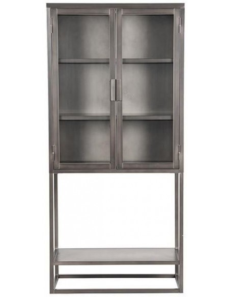 Vitrineskab udført i et industrielt design, fremstillet i vintage metalgrå lakeret metal og klart glas. I skabet forefindes 2 hylder, hertil 1 åbent hylderum. Skabet måler 150 cm i højden og 70 x 35 cm i bredde og dybde.