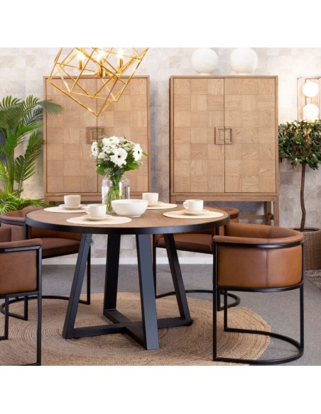 Vitrineskab udført i et rustikt design i patineret egetræ og antik guldfarvet metal. Vitrineskabet er med 2 skabslåger med i alt 3 hylderum bag. Møblet måler 181 cm i højden og 96,5 cm i bredden.