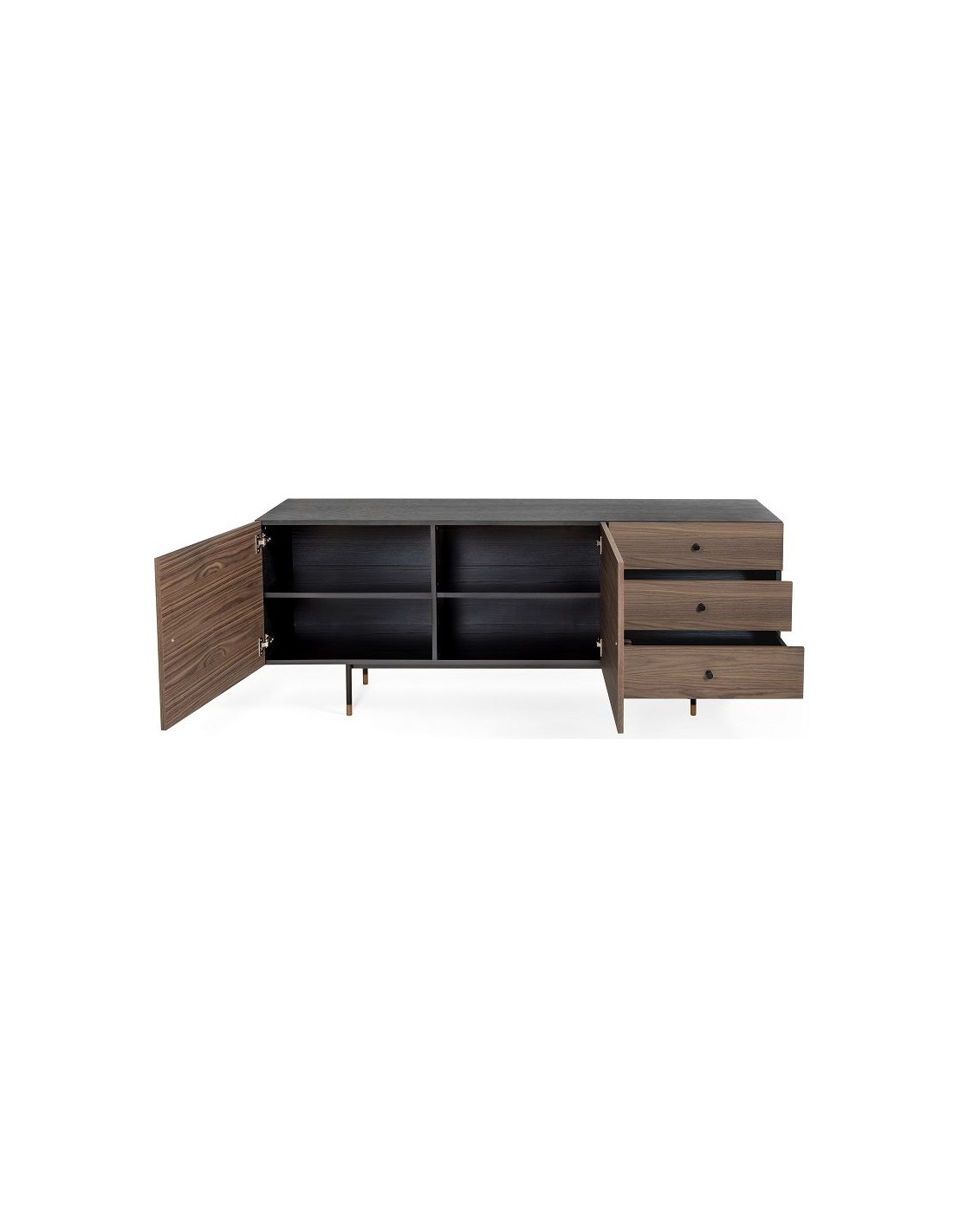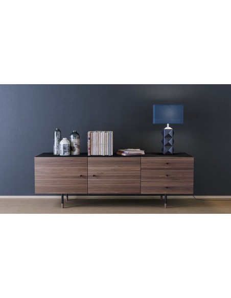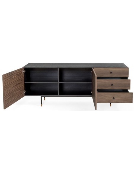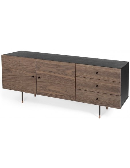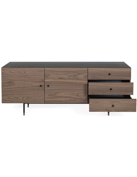 Jugend sideboard udført i et moderne design med 2 låger som gemmer på i alt 4 hylderum. Hertil 3 skuffer. Sideboardet er fremstillet i metal og valnøddetræsfinér.