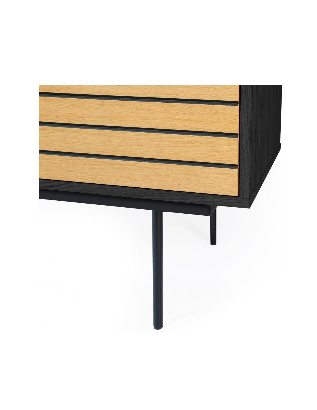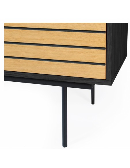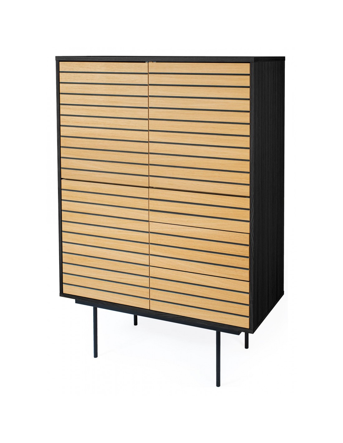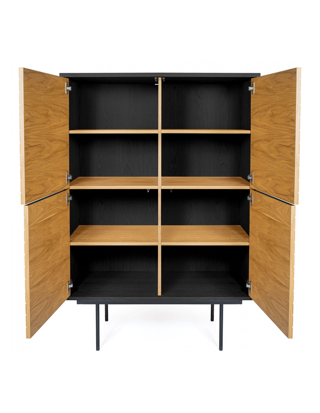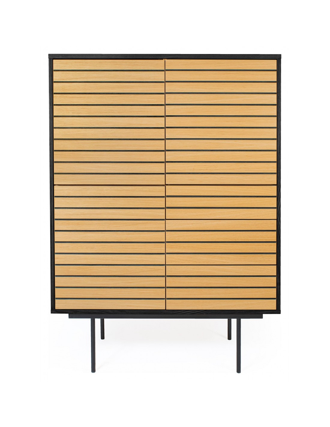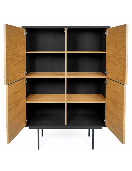 Stripe vitrineskab udført i et moderne design med 4 låger som gemmer på i alt 8 hylderum. Vitrineskabet er fremstillet i MDF og egetræsfinér med ben i stål. Benhøjden er 28 cm.