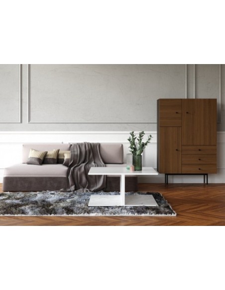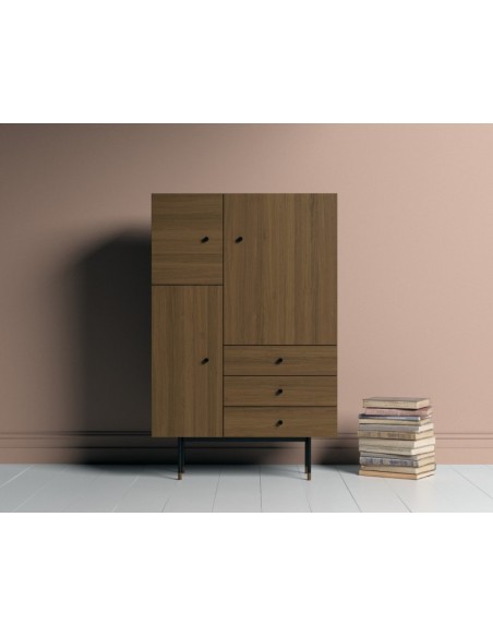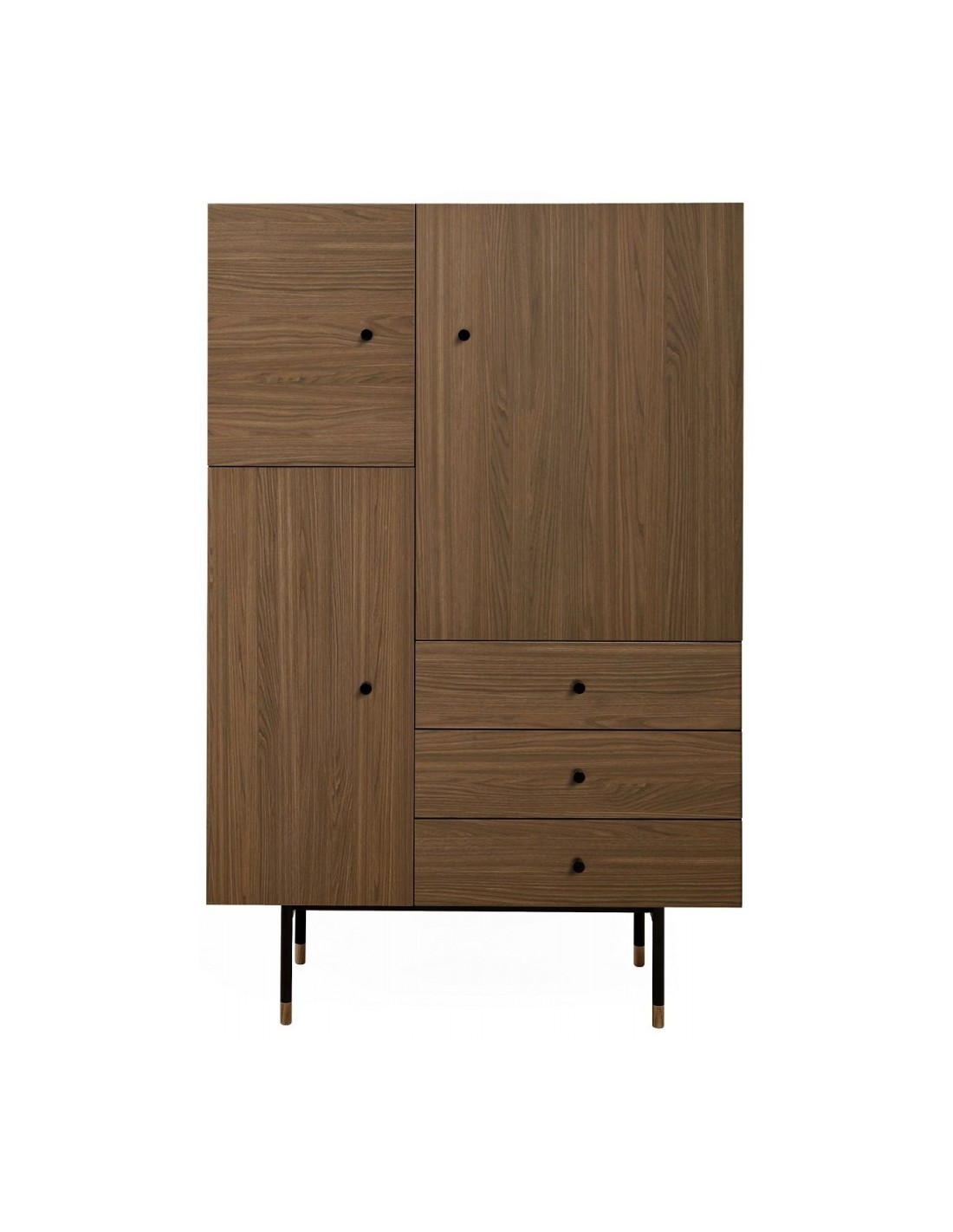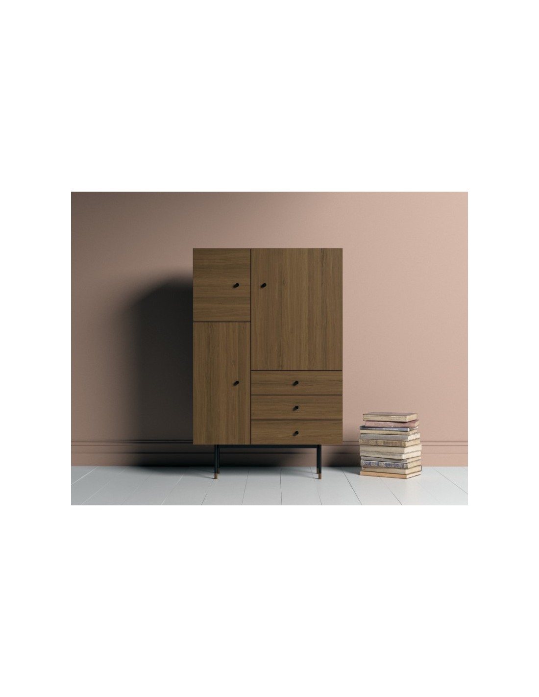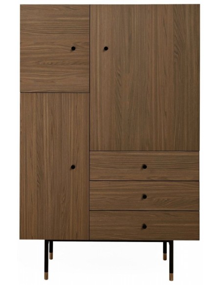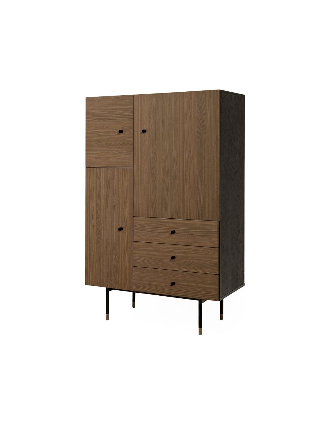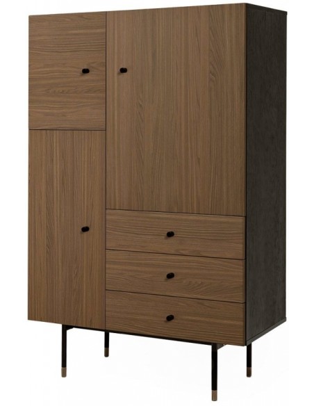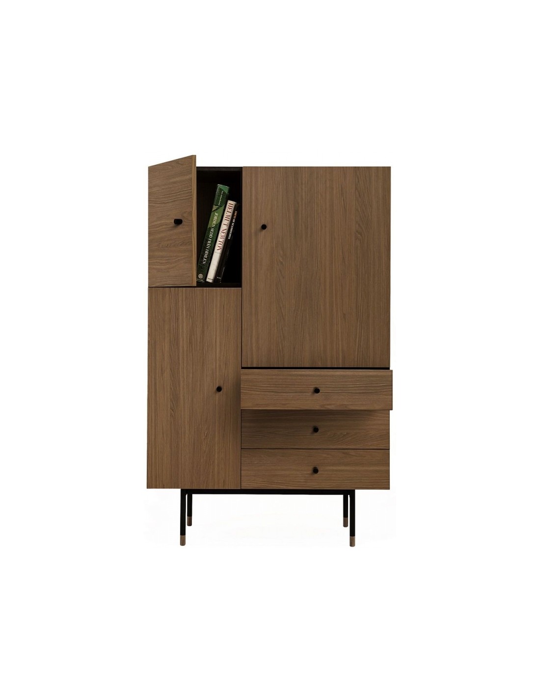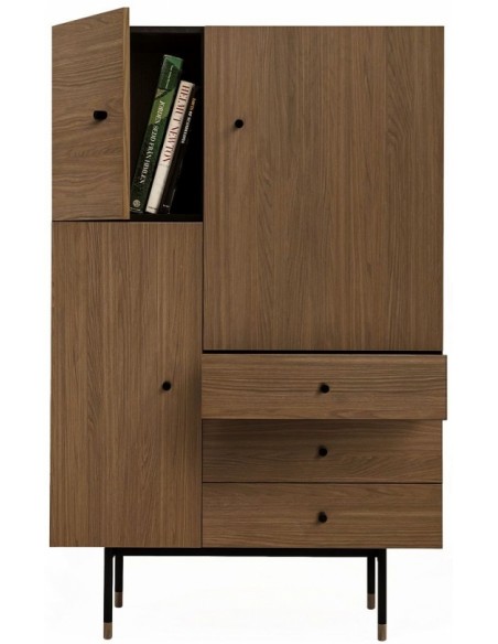 Jugend vitrineskab udført i et moderne design med 3 skuffer samt 3 skabe med højdejustérbar hylde bag og softclose låger. Vitrineskabet er fremstillet i metal og valnøddetræsfinér med ben i stål.