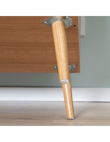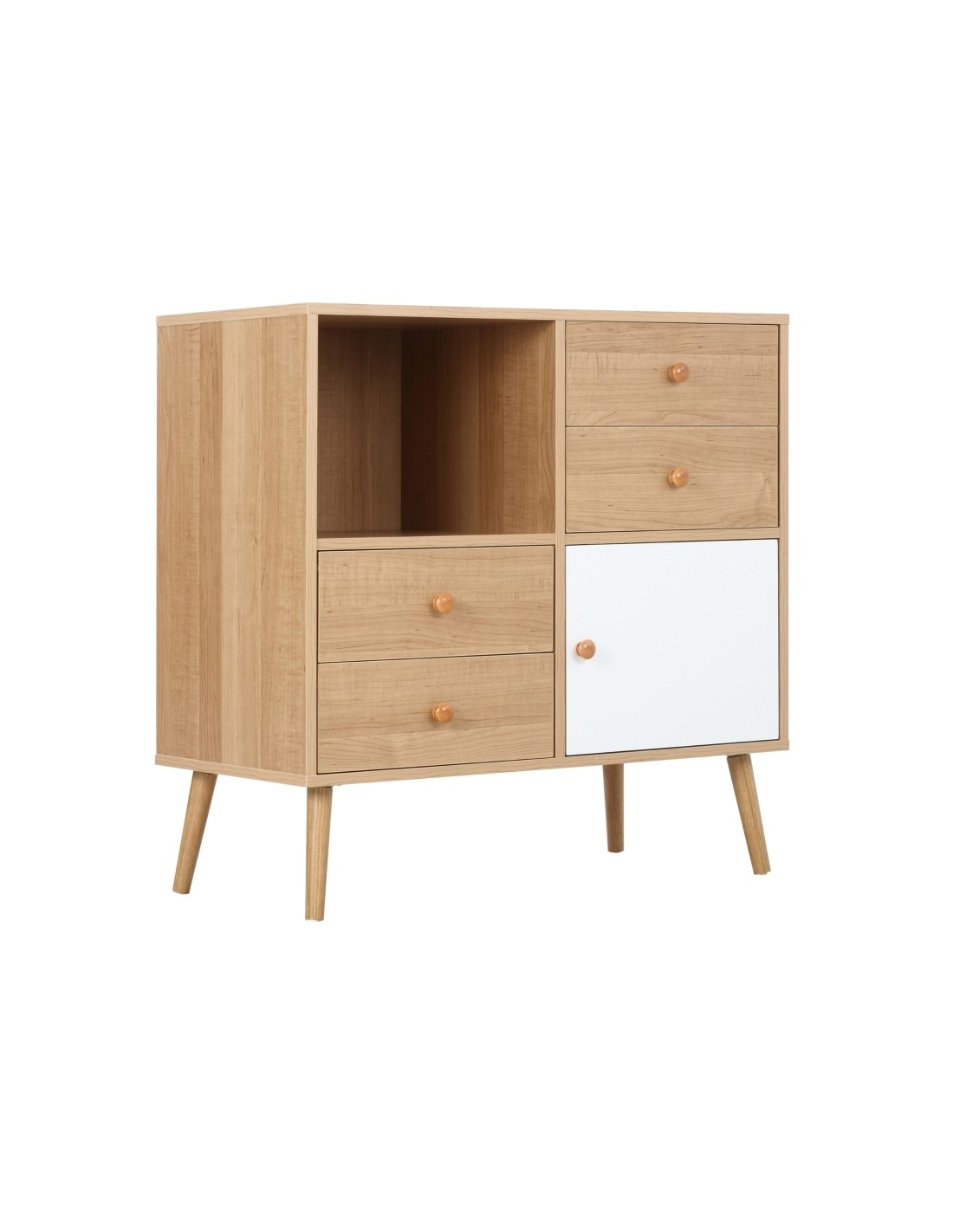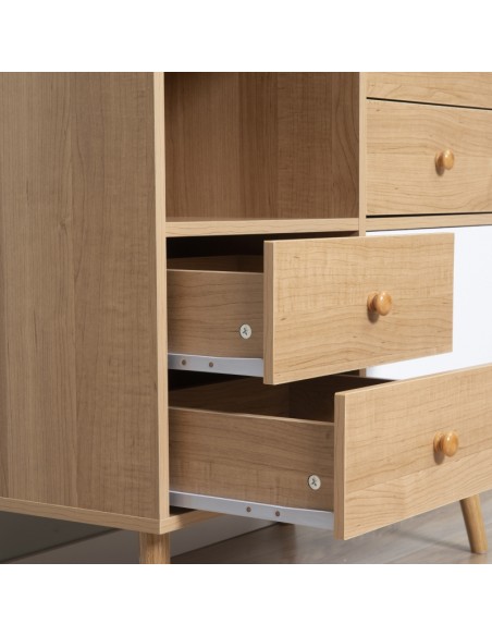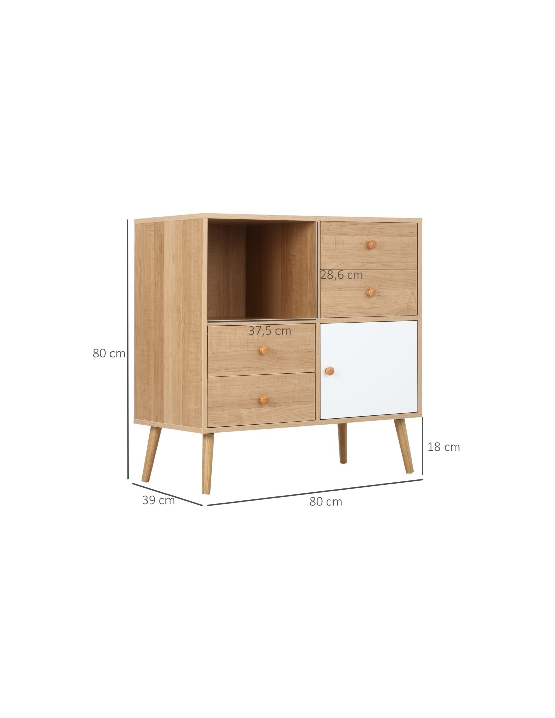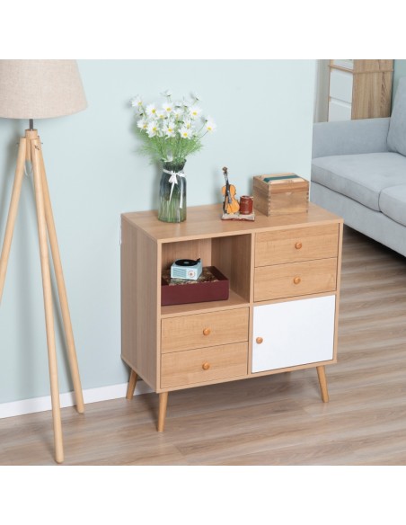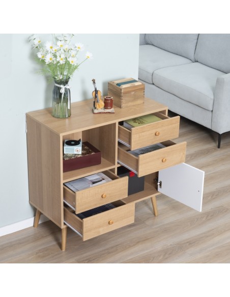 Sideboard udført i et design af møbelplade og træ. Sideboardet måler 80 x 39 cm i bredde og dybde og 80 cm i højden og indeholder 4 skuffer og 2 skabe.
