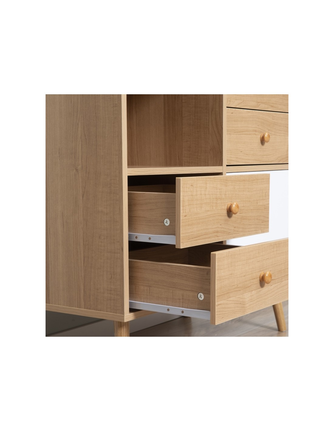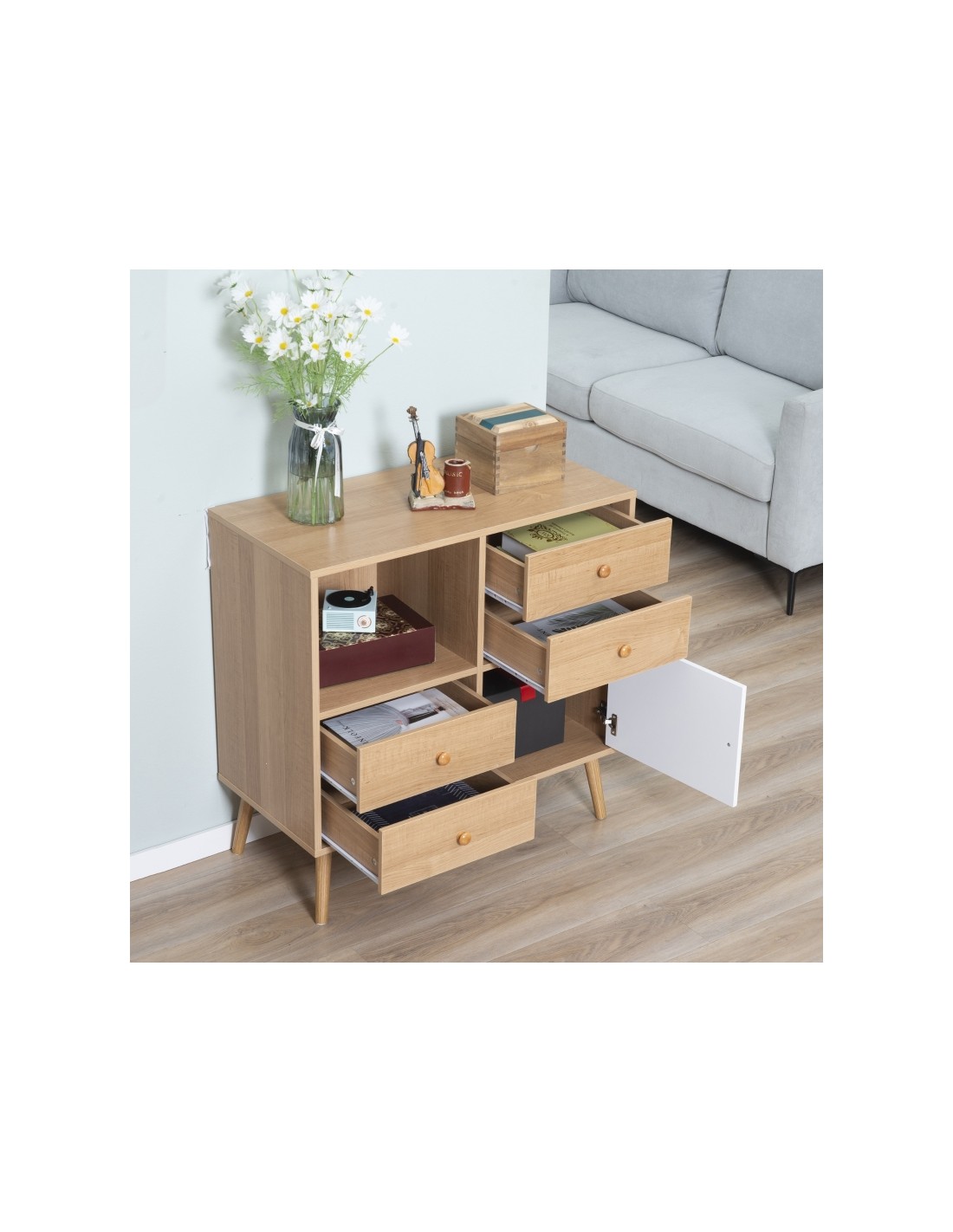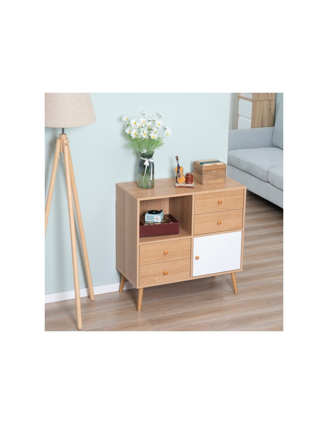 Sideboard udført i et design af møbelplade og træ. Sideboardet måler 80 x 39 cm i bredde og dybde og 80 cm i højden og indeholder 4 skuffer og 2 skabe.