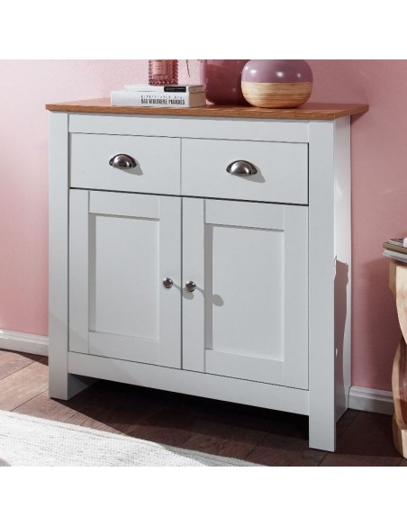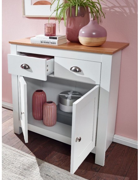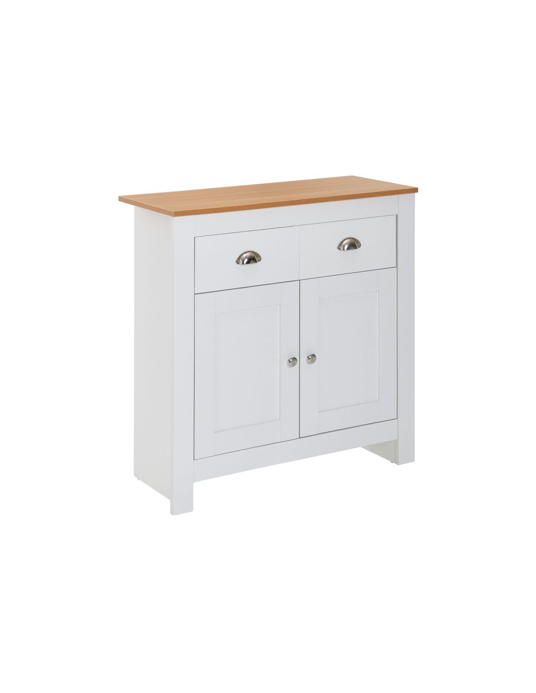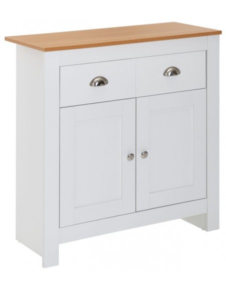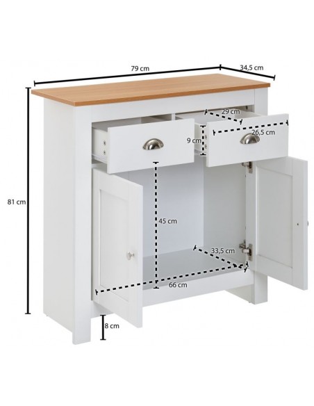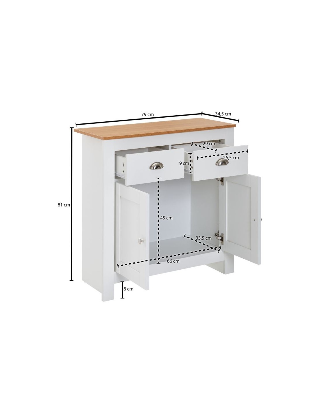 Skænk fremstillet i et design af hvid og naturfarvet møbelplade. Skænken måler 81 cm i højden og 79 x 34,5 cm i bredde og dybde.