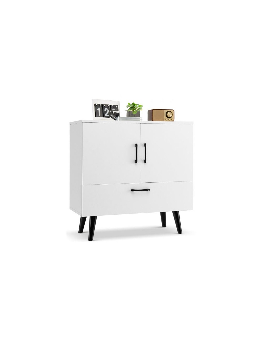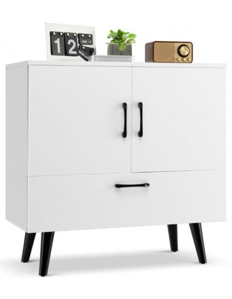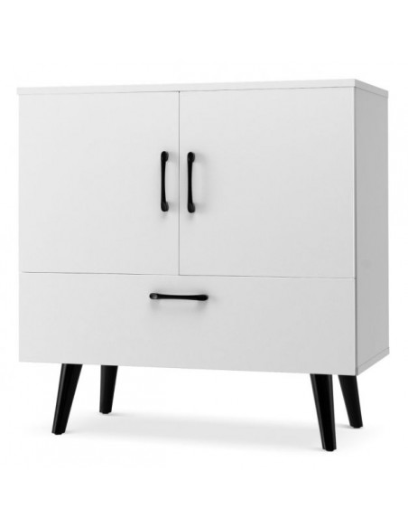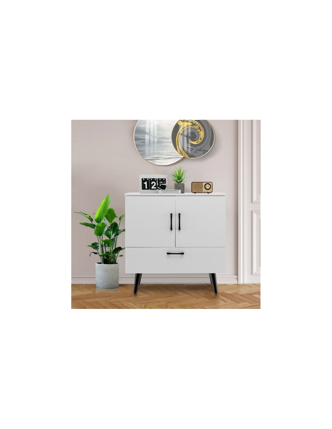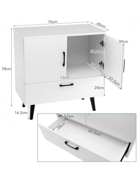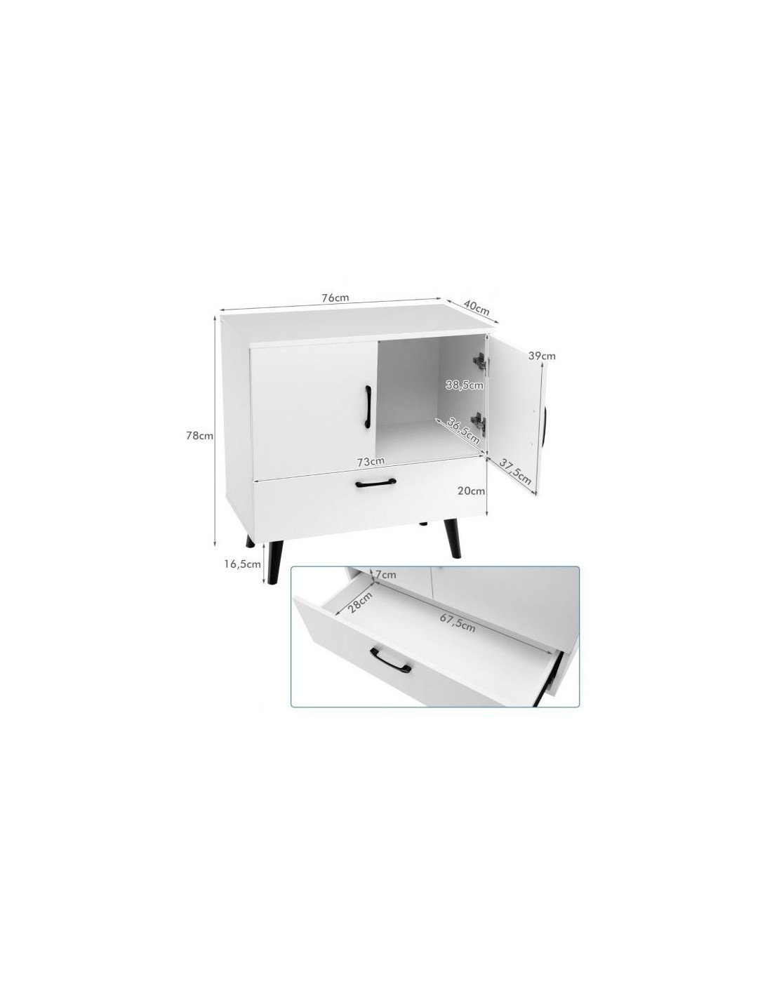 Sideboard med skuffe, udført i et design af sortlakeret træ og hvid mdf. Sideboardet måler 78 cm i højden og 76 x 40 cm i bredde og dybde.