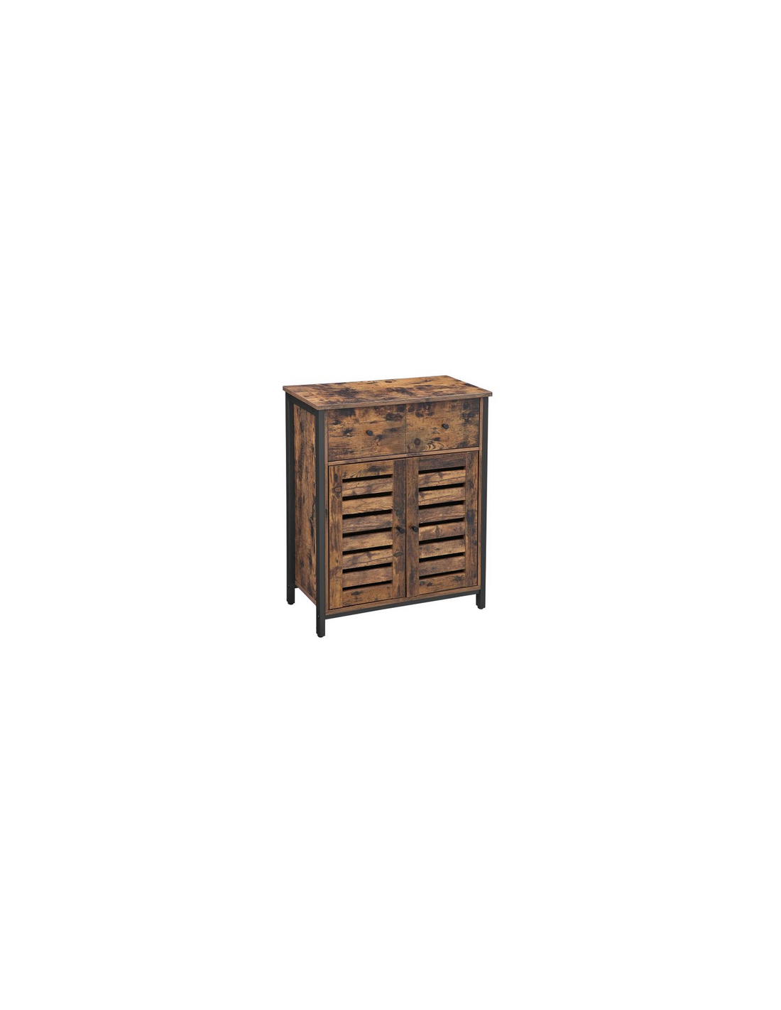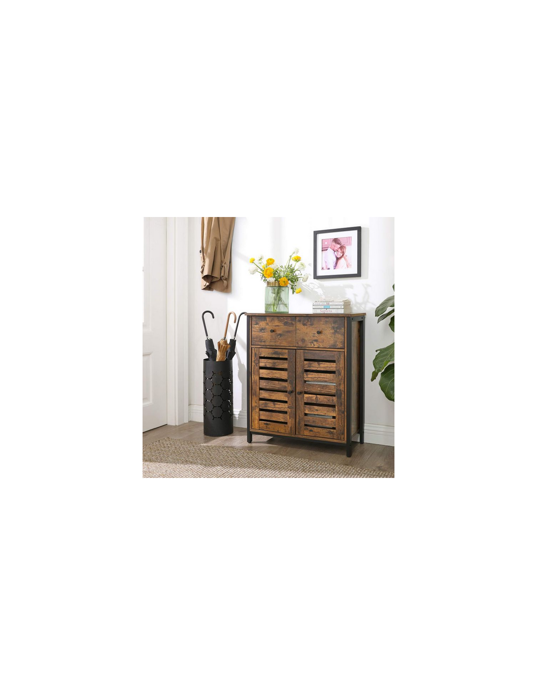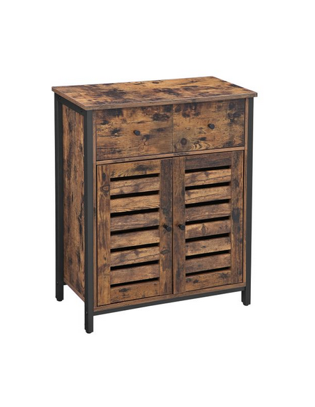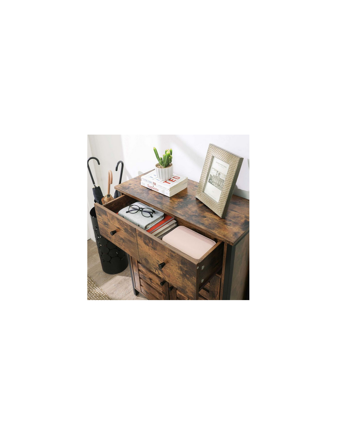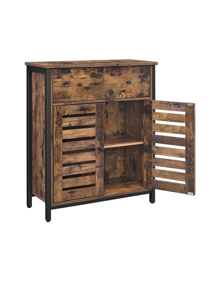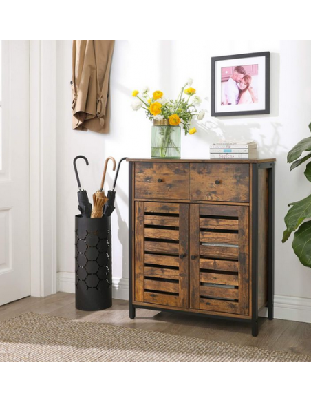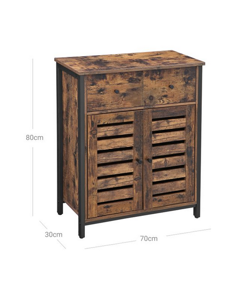 Sideboard udført i et design af sortlakeret metal og brun møbelplade. Sideboardet måler 80 cm i højden og 70 x 30 cm i bredde og dybde.