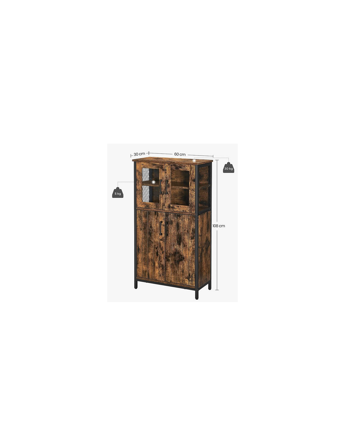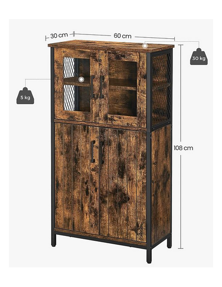 Vitrineskab udført i et design af sortlakeret metal og brun møbelplade. Skabet måler 108 cm i højden og 60 x 30 cm i bredde og dybde.