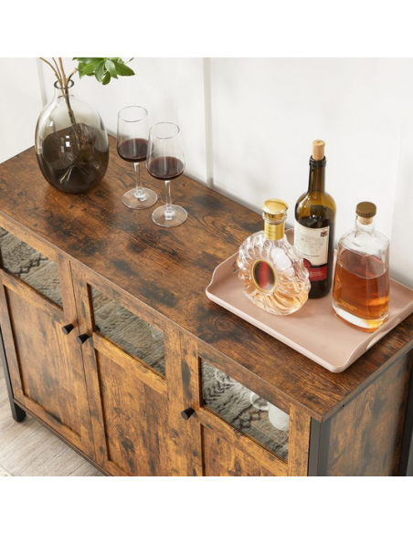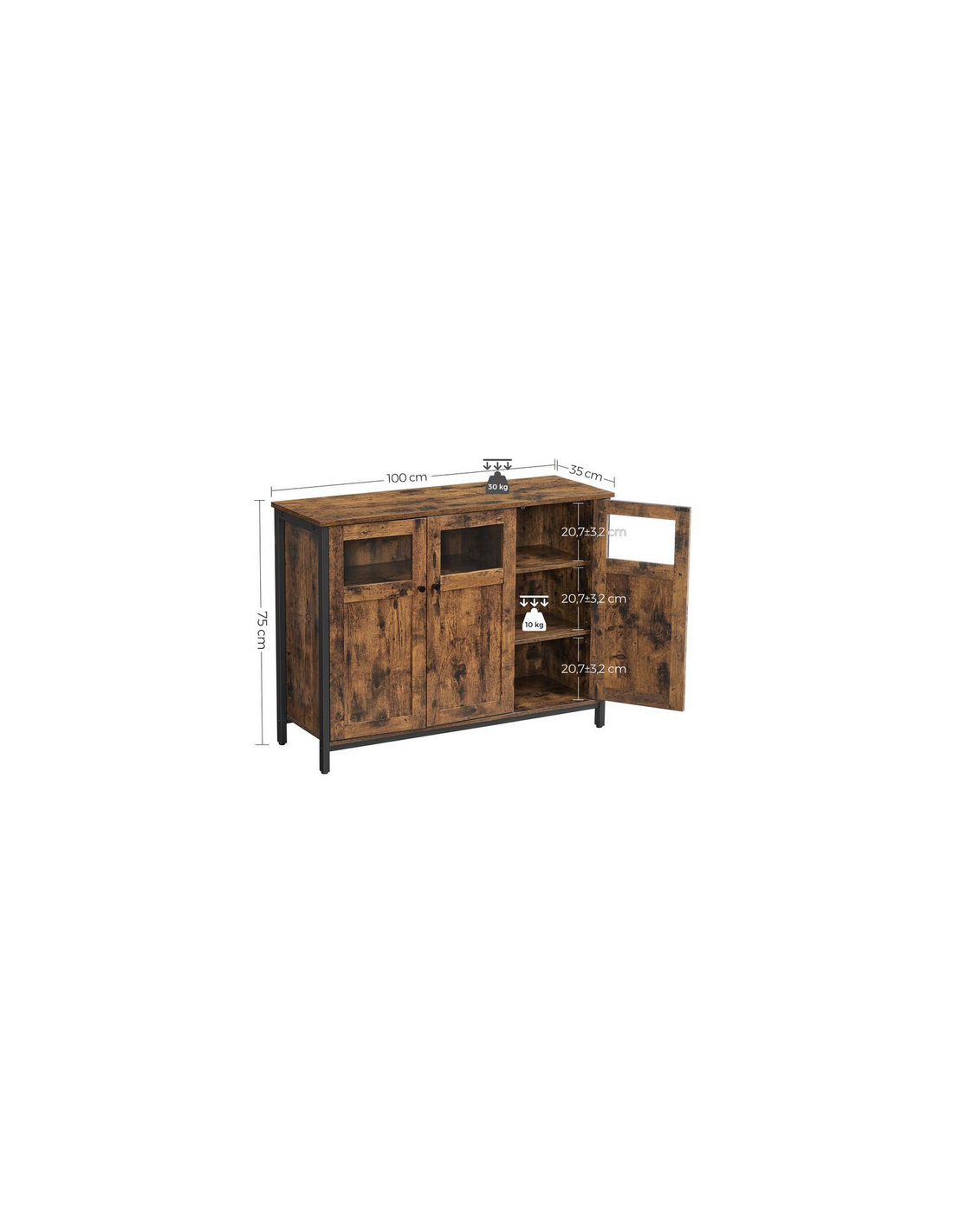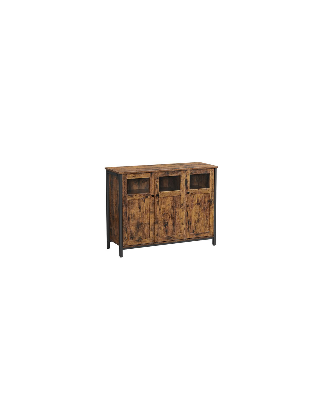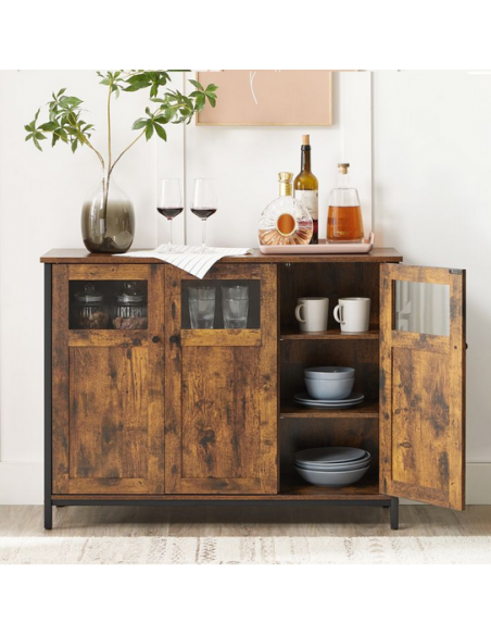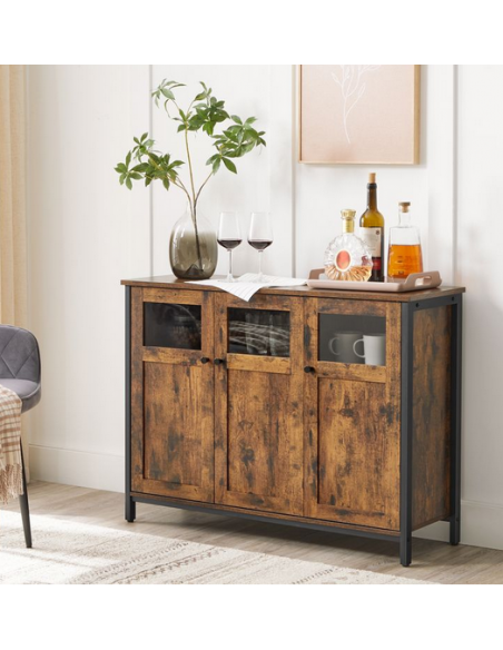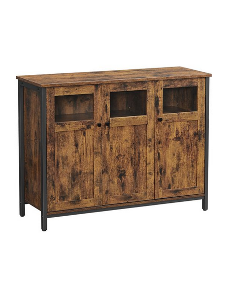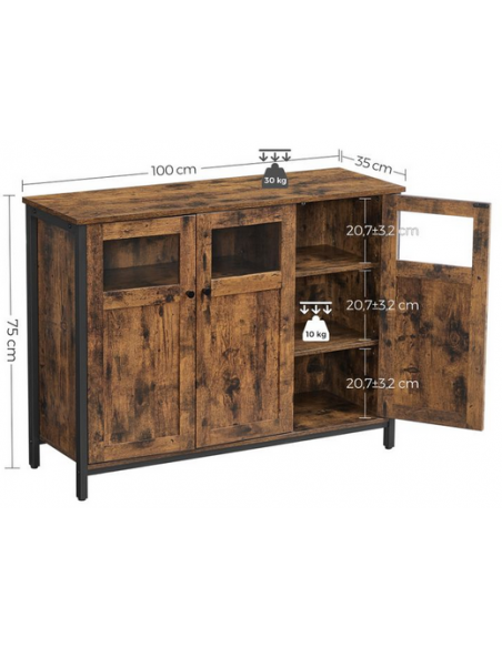 Sideboard udført i et design af sortlakeret metal og brun møbelplade. Sideboardet måler 75 cm i højden og 100 x 35 cm i bredde og dybde.