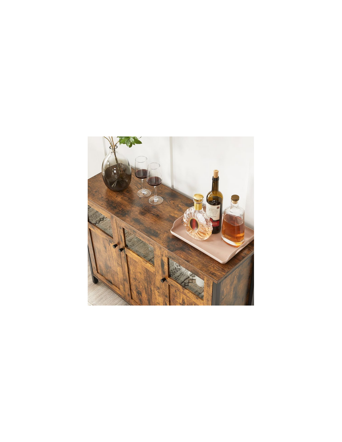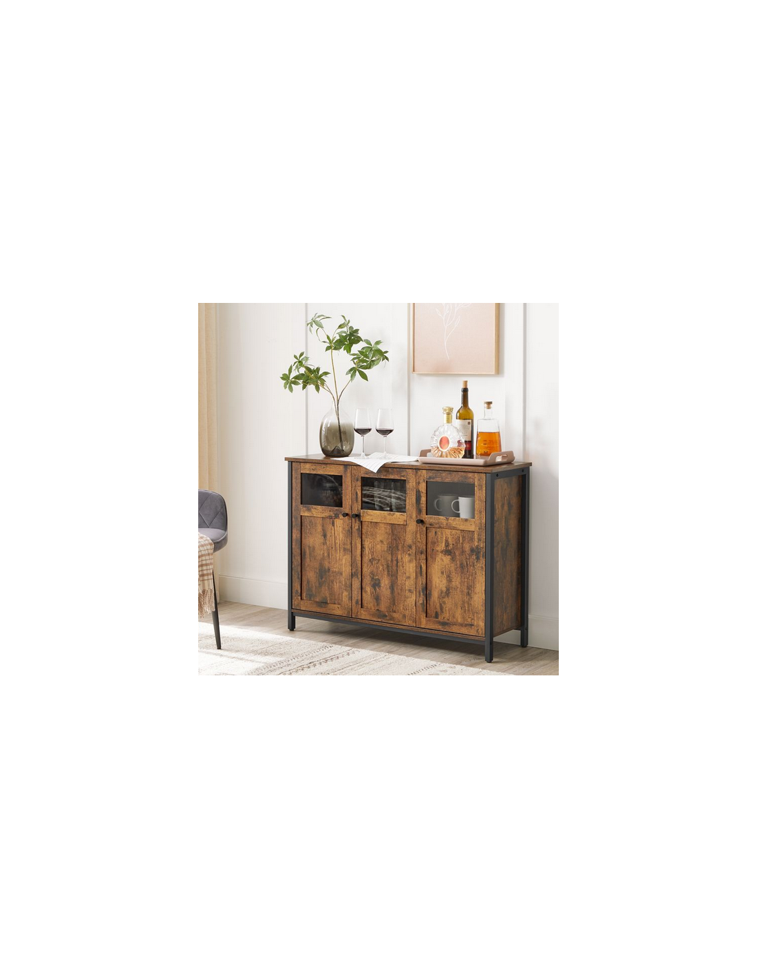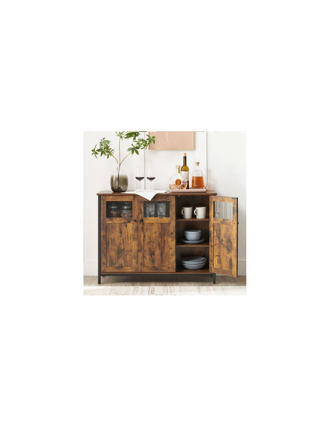 Sideboard udført i et design af sortlakeret metal og brun møbelplade. Sideboardet måler 75 cm i højden og 100 x 35 cm i bredde og dybde.