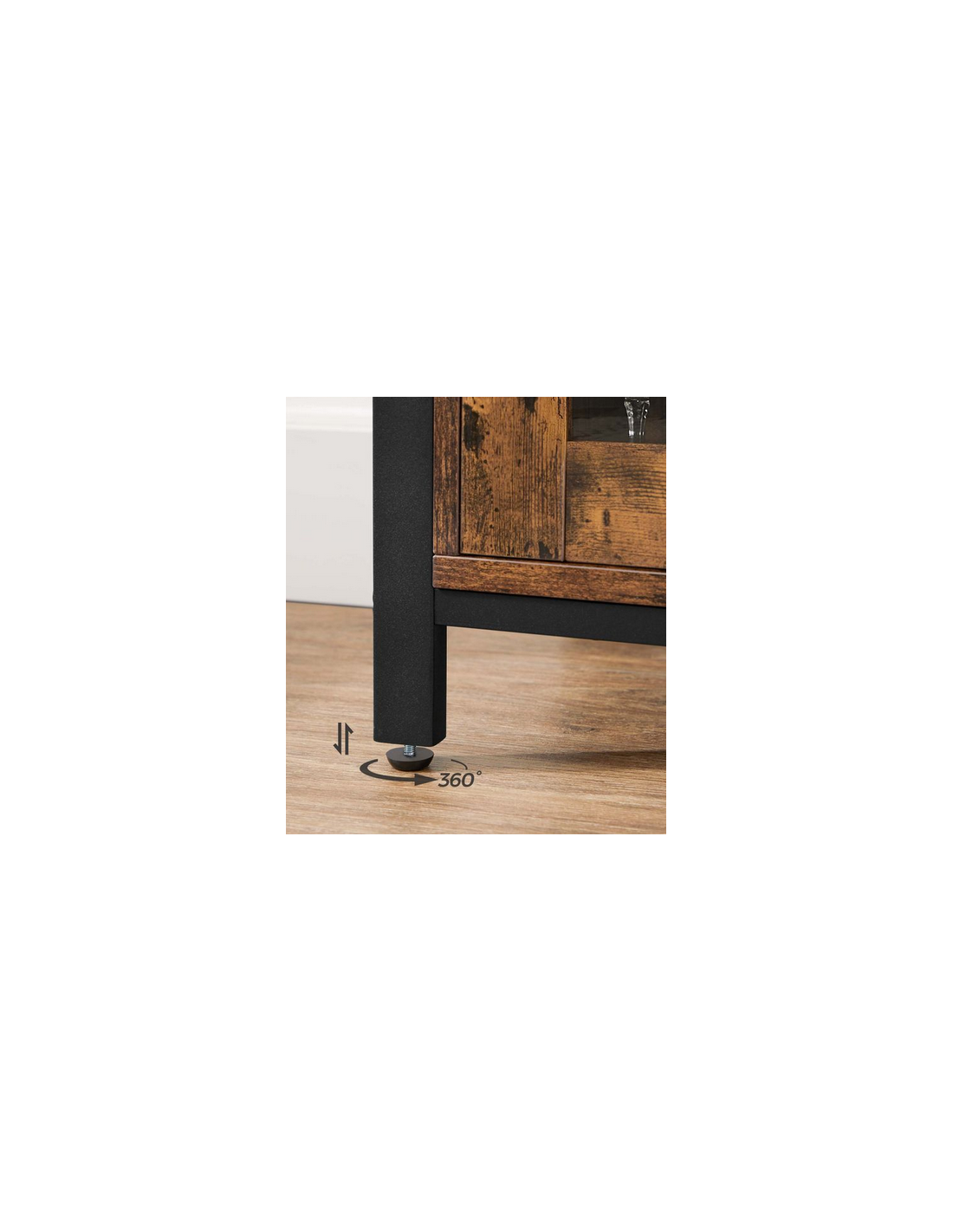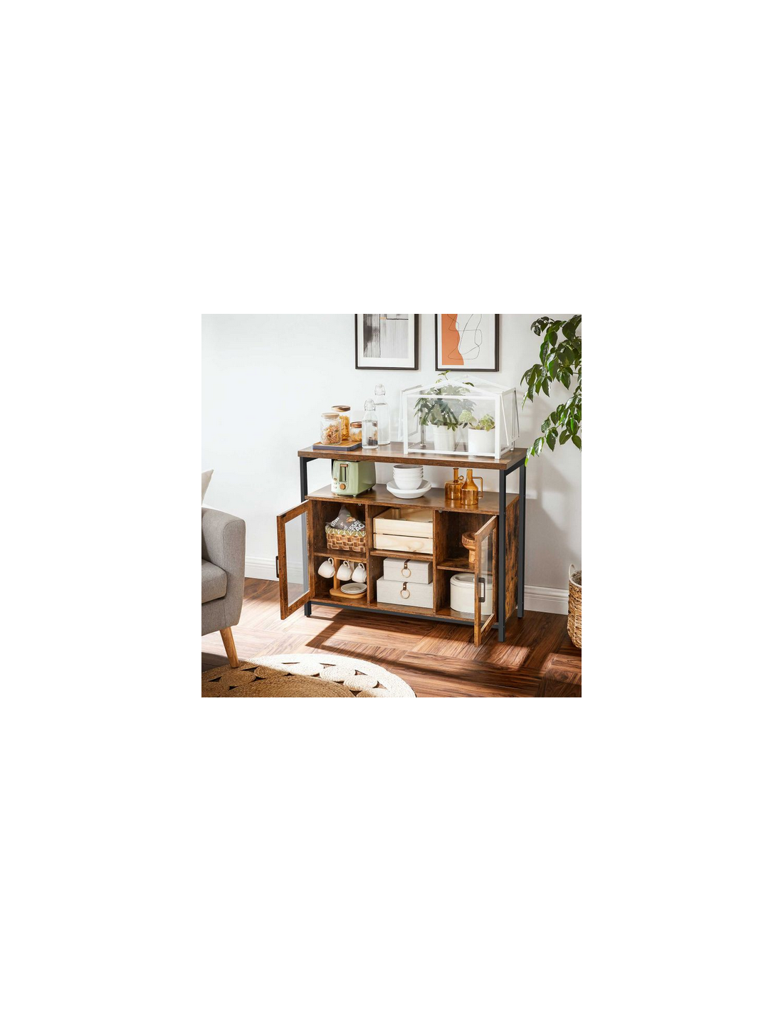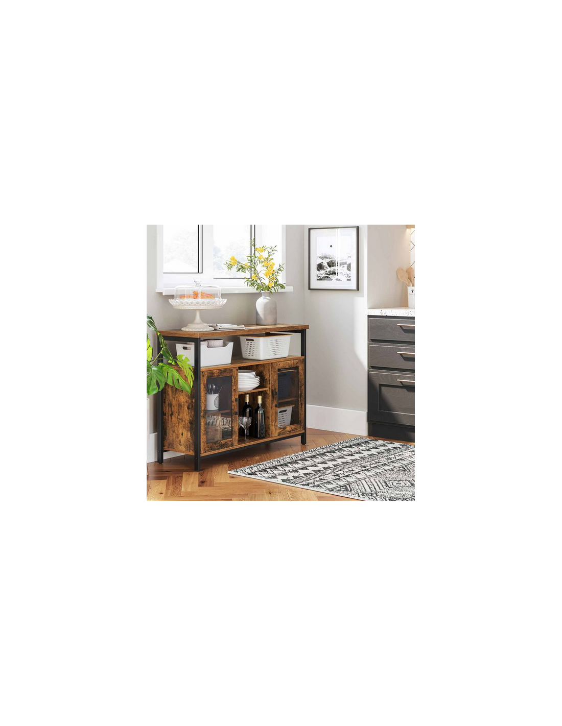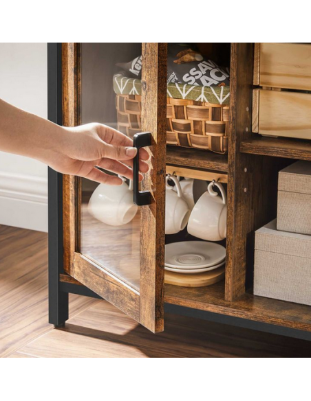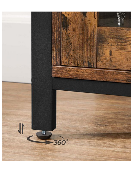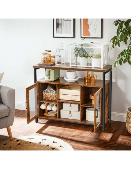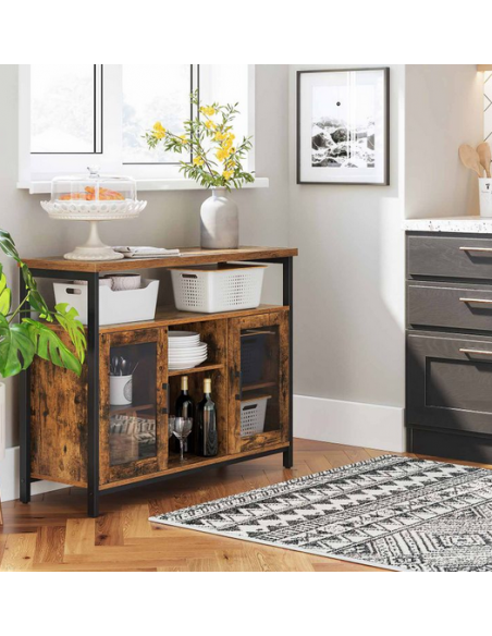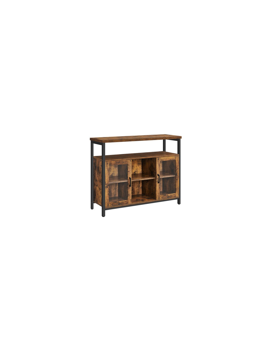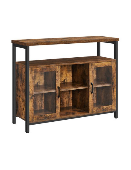 Sideboard udført i et design af sortlakeret metal og brun møbelplade. Sideboardet måler 80 cm i højden og 100 x 35 cm i bredde og dybde.