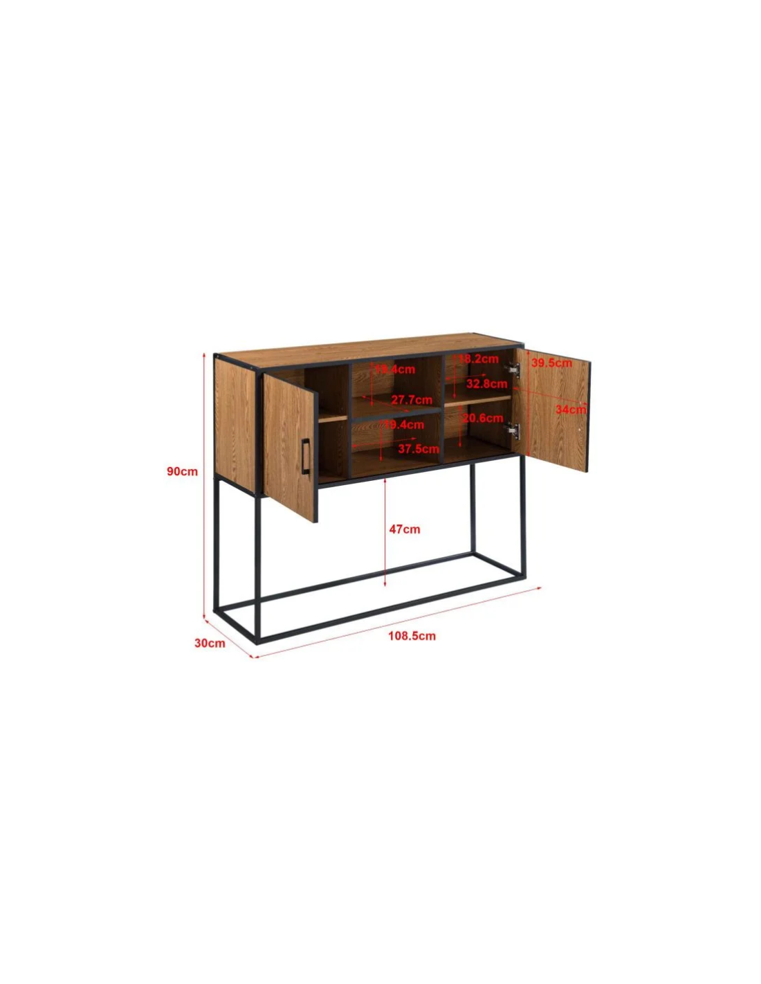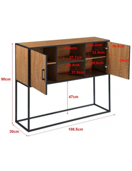 Sideboard udført i et design af metal og møbelplade. Sideboardet måler 90 cm i højden og 108,5 x 30 cm i bredde og dybde.