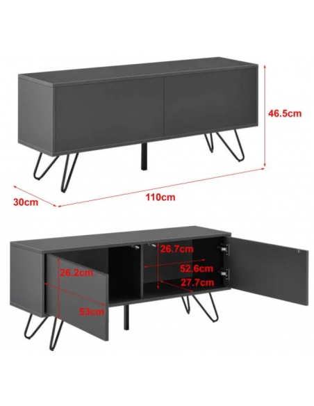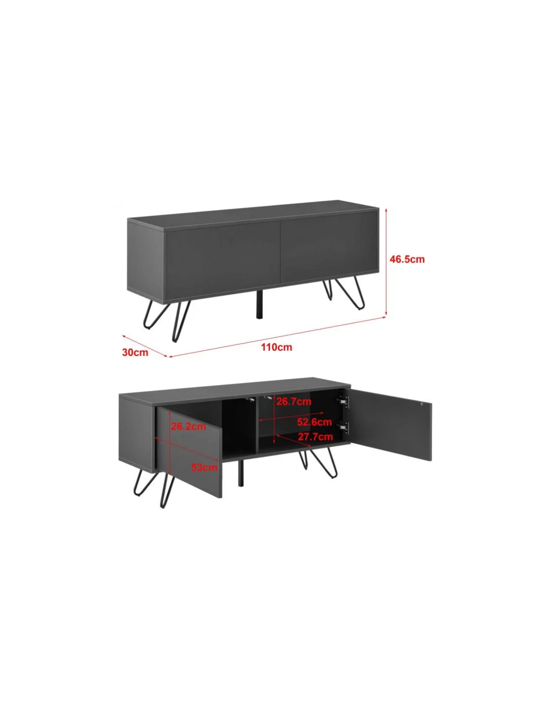 Sideboard udført i et design af metal og møbelplade. Sideboardet måler 46,5 cm i højden og 110 x 30 cm i bredde og dybde.