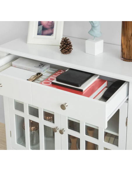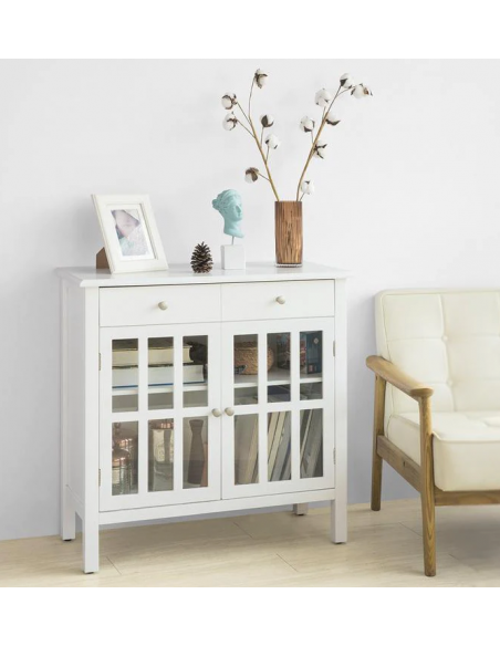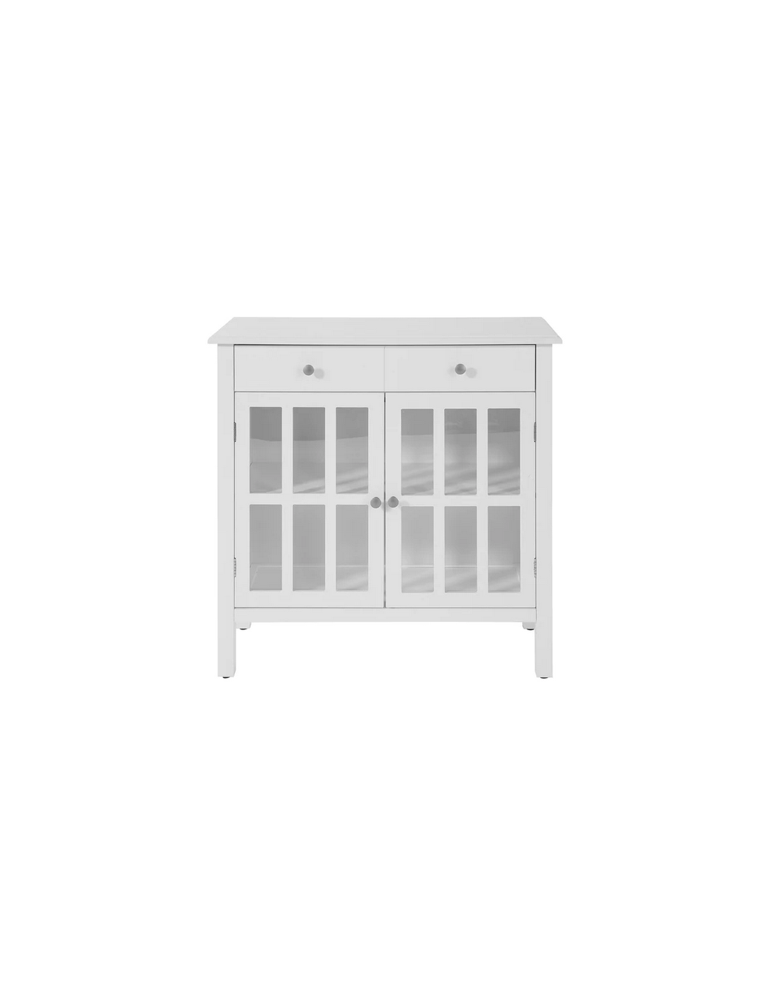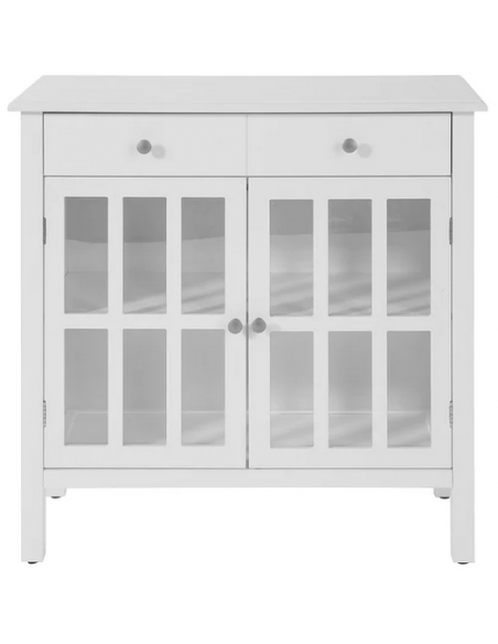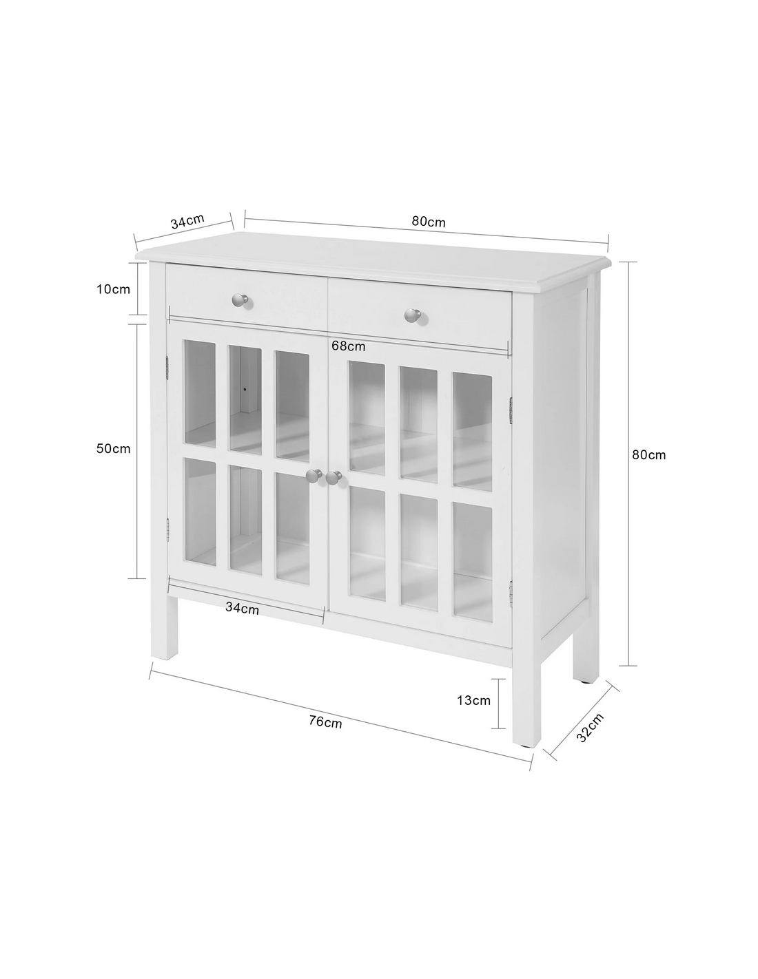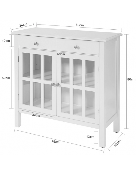 Skænk fremstillet i et design af hvid møbelplade. Skænken måler 80 cm i højden og 80 x 34 cm i bredde og dybde.