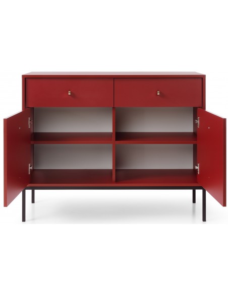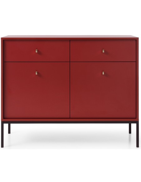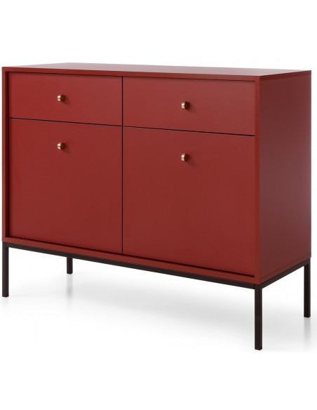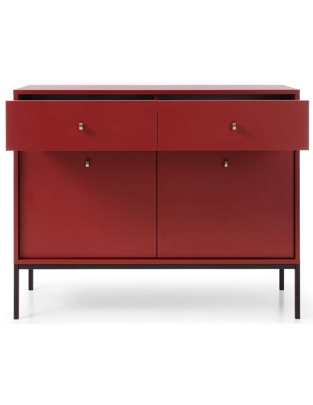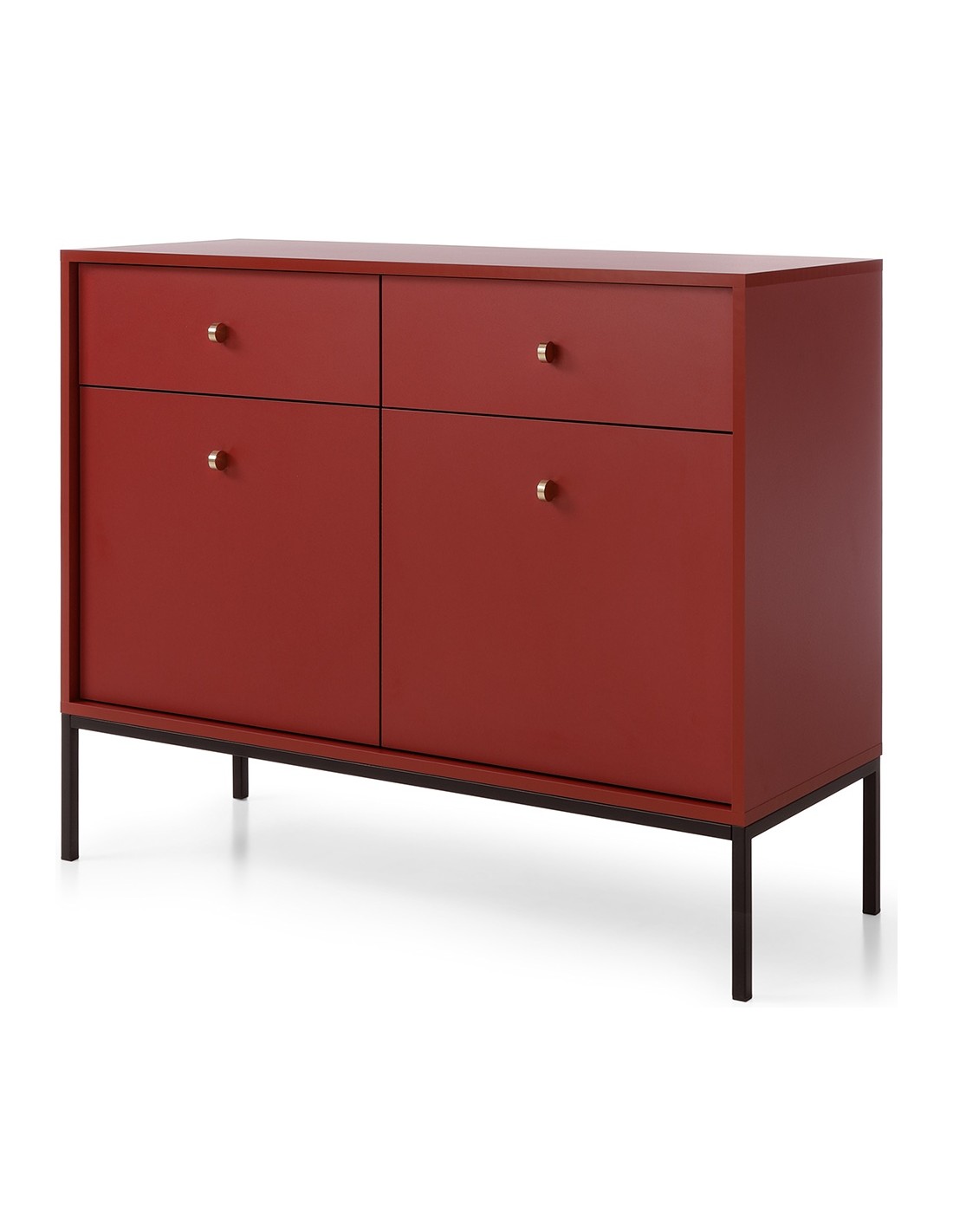 Mono sideboard udført i et design af sortlakeret metal og bordeaux farvet møbelplade. Møblet måler 83 cm i højden og 103 x 39 cm i bredde og dybde og indeholder 2 skuffer og 2 skabsrum med 1 hylde i hvert.