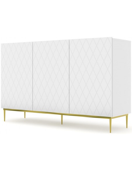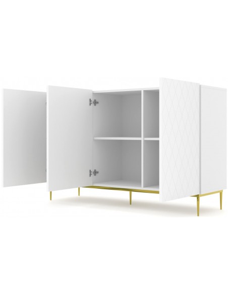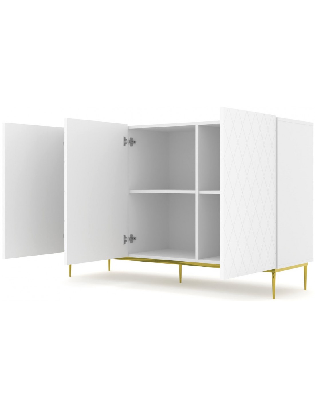 Diuna sideboard udført i et design af guldfarvet metal og mat hvid møbelplade. Møblet måler 90 cm i højden og 145 x 40 cm i bredde og dybde og indeholder 3 skabe, hvert med 1 hylde.