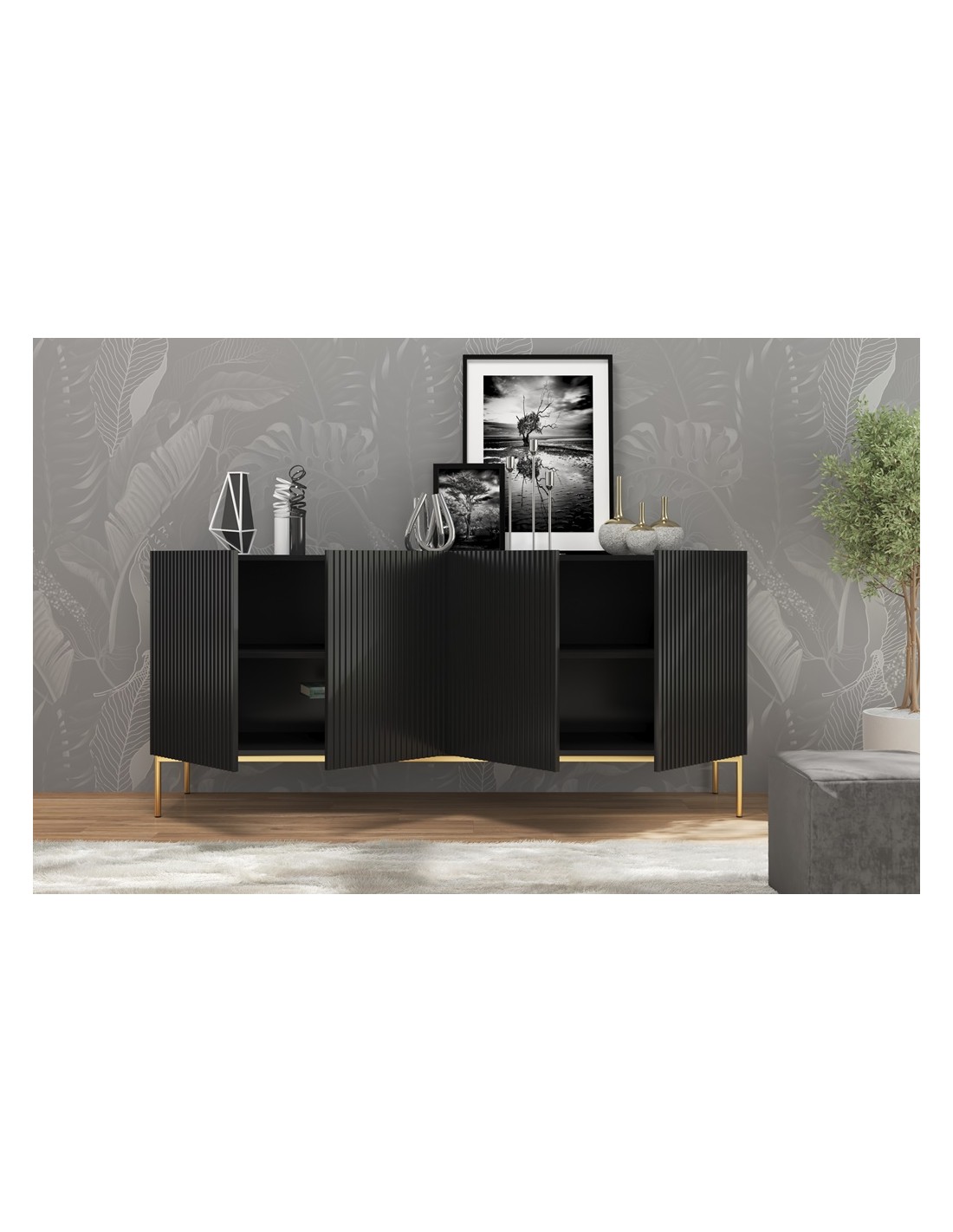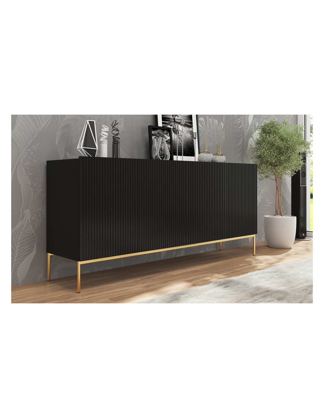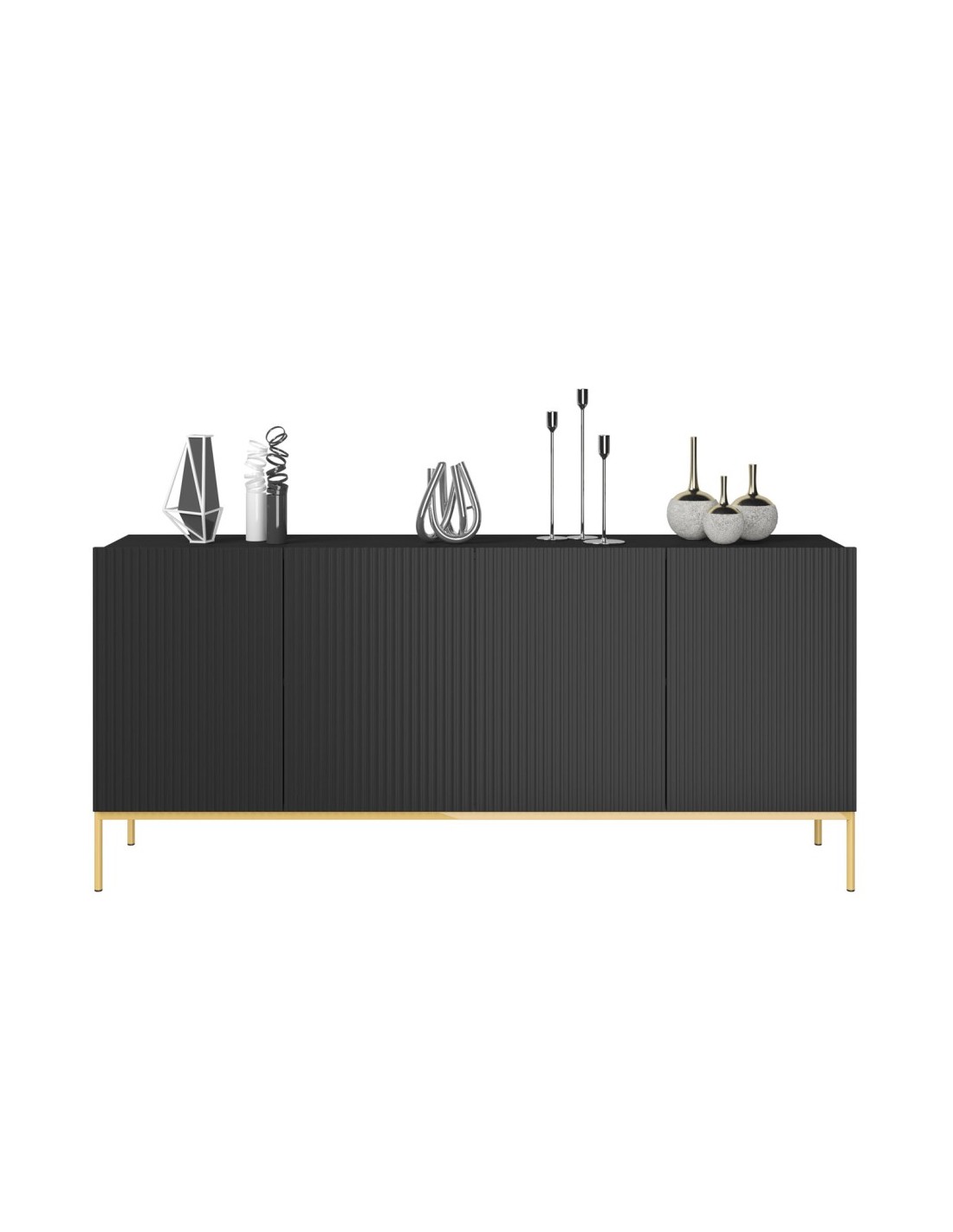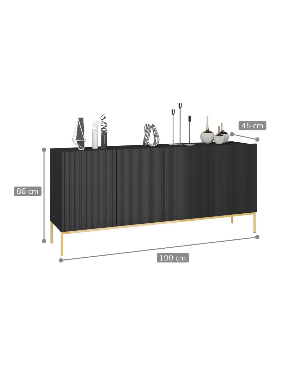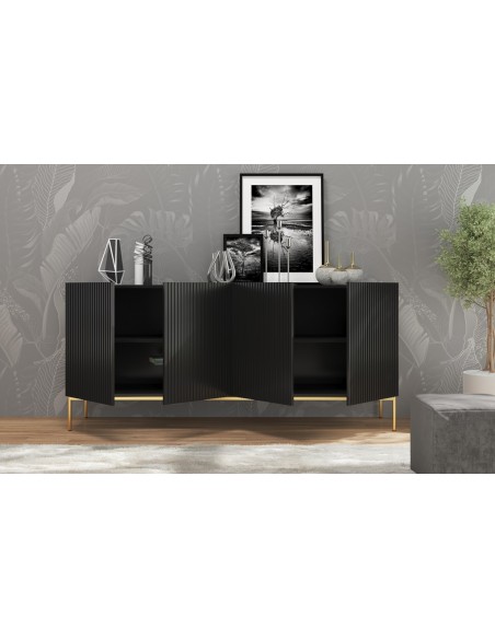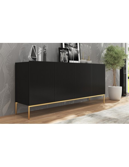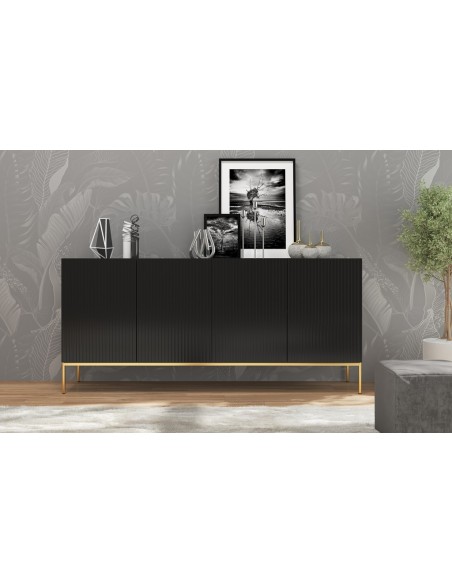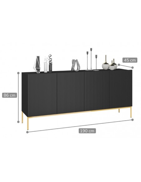 Nicole sideboard udført i et design af guldfarvet metal og mat sort møbelplade. Møblet måler 86 cm i højden og 190 x 45 cm i bredde og dybde og indeholder 2 dobbeltskabe, hvert med 1 tværgående hylde.