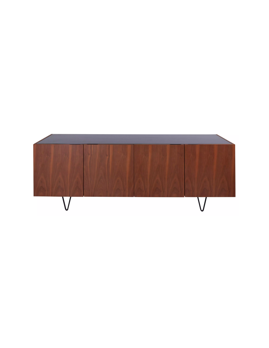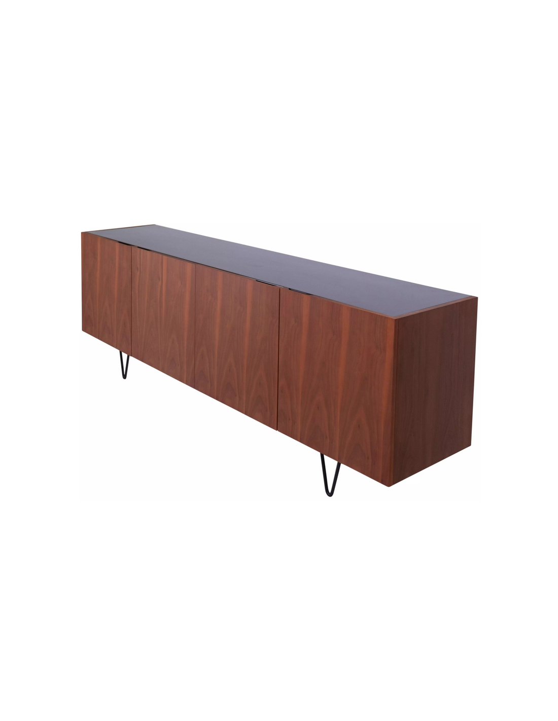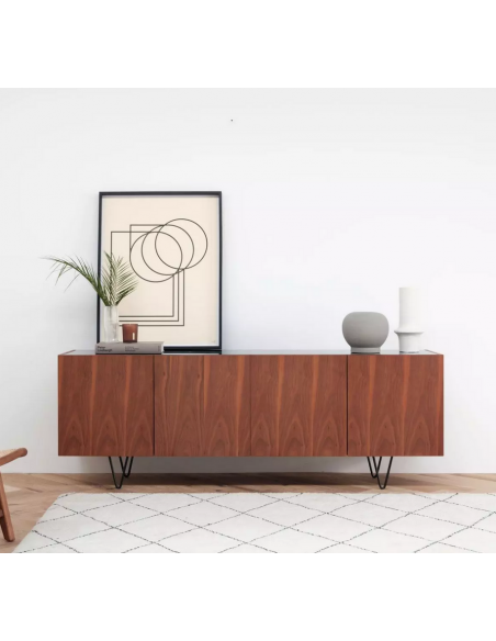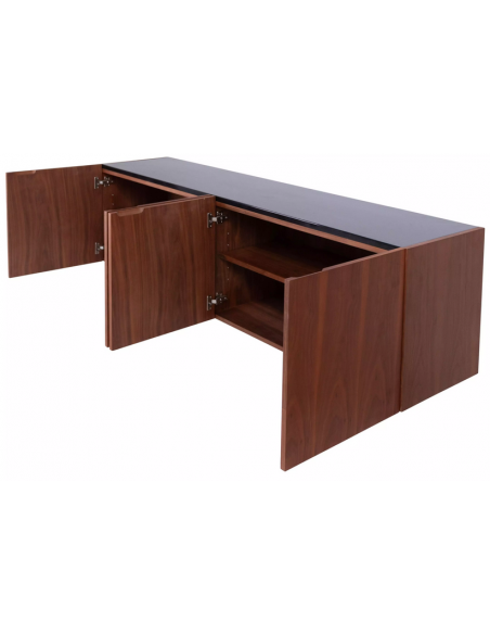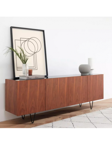 Sideboard udført i et design af sortlakeret metal, sort marmor og valnøddefinér. Sideboardet har justérbare hylder i hvert af de 2 dobbeltrum. Møblet måler 71 cm i højden og 200 x 45 cm i bredde og dybde.