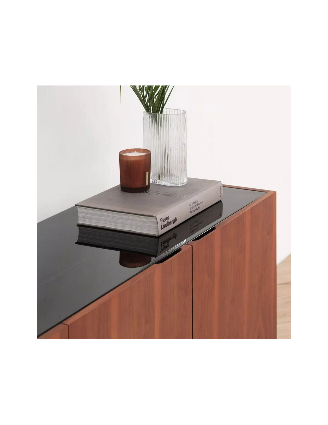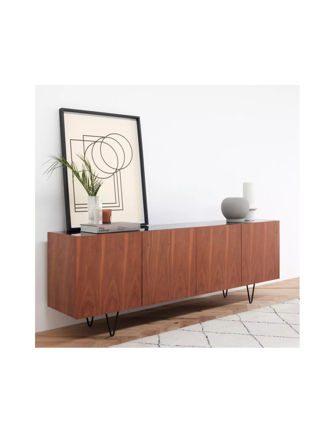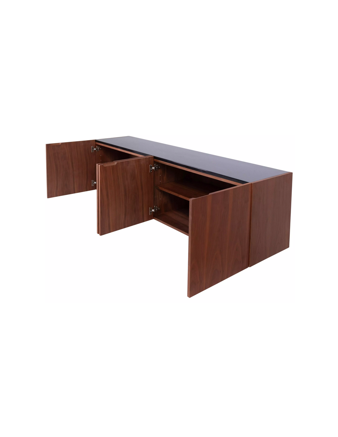 Sideboard udført i et design af sortlakeret metal, sort marmor og valnøddefinér. Sideboardet har justérbare hylder i hvert af de 2 dobbeltrum. Møblet måler 71 cm i højden og 200 x 45 cm i bredde og dybde.