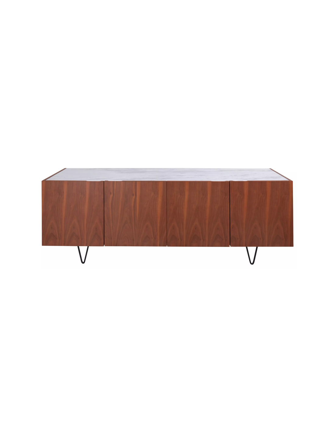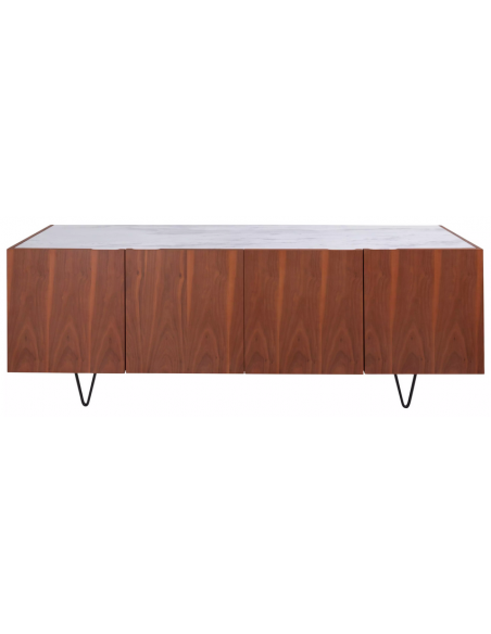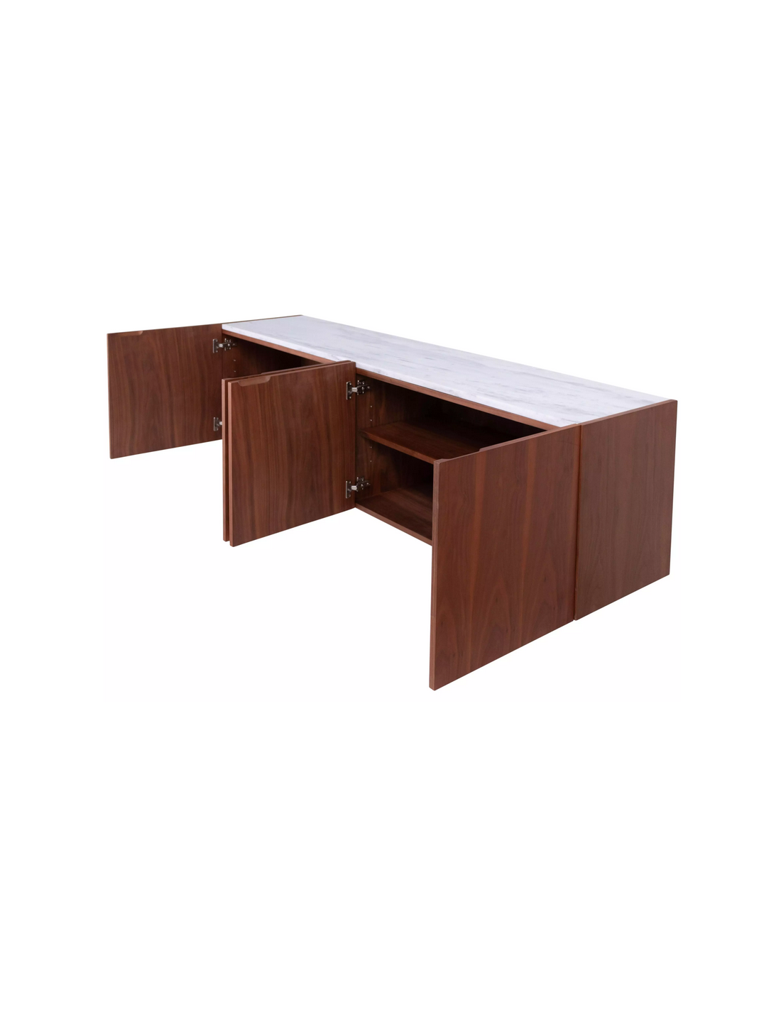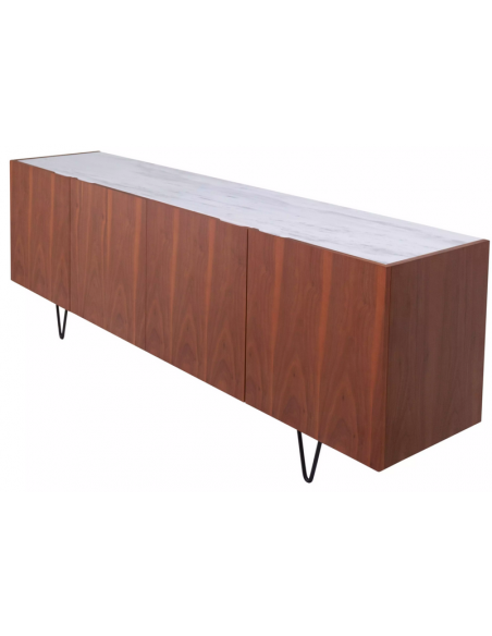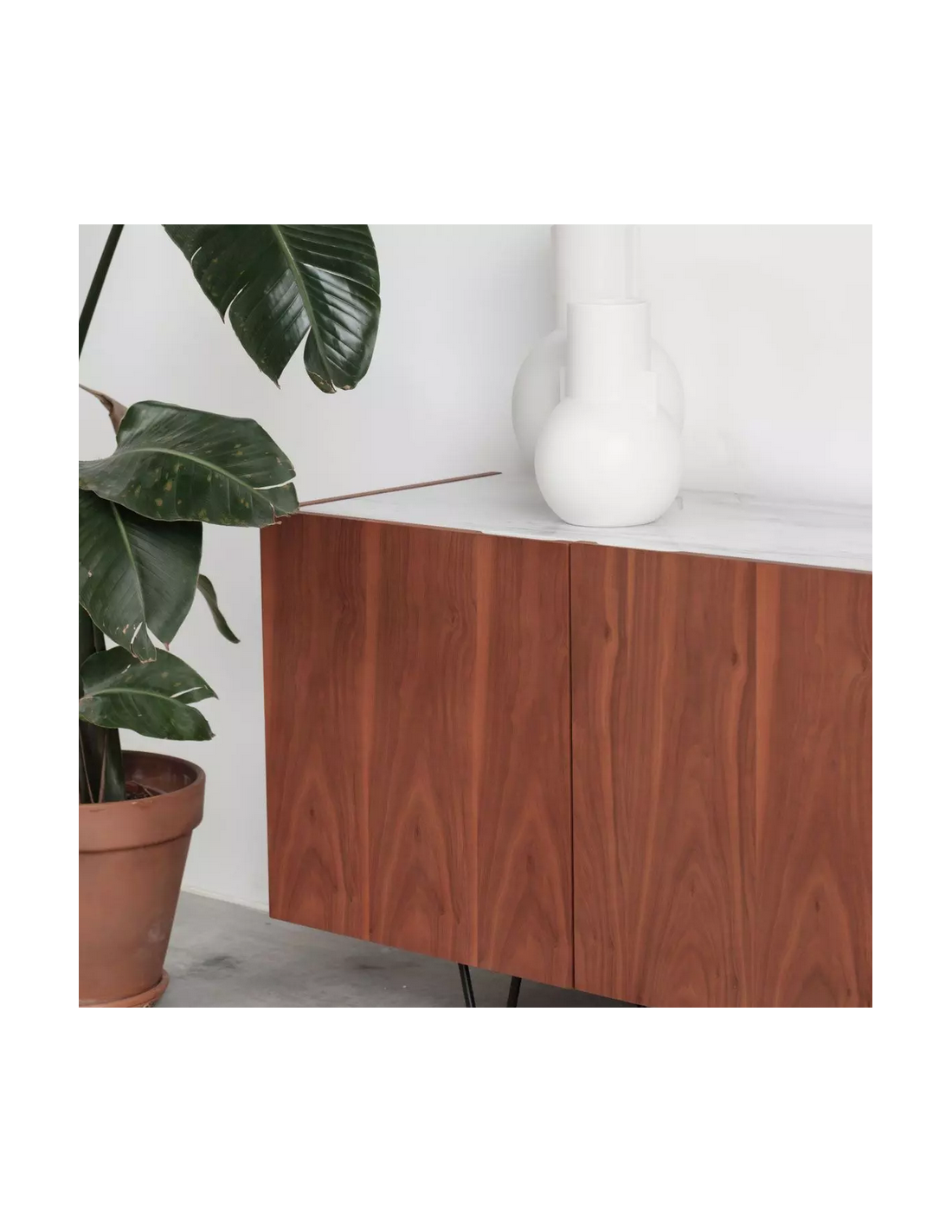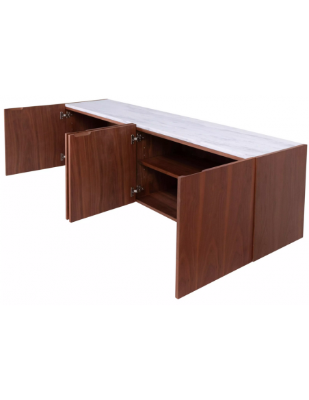 Sideboard udført i et design af sortlakeret metal, hvid marmor og valnøddefinér. Sideboardet har justérbare hylder i hvert af de 2 dobbeltrum. Møblet måler 71 cm i højden og 200 x 45 cm i bredde og dybde.