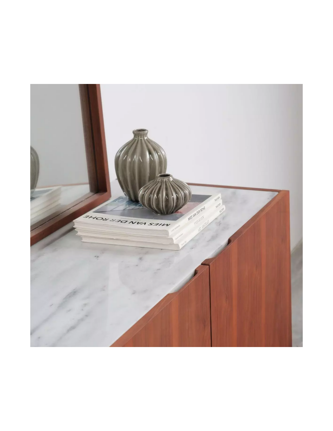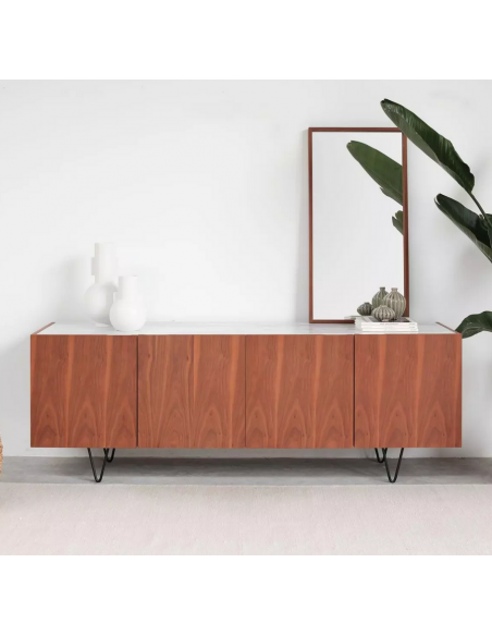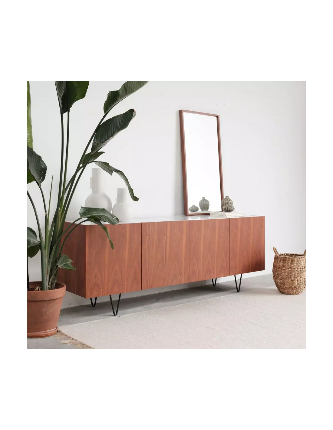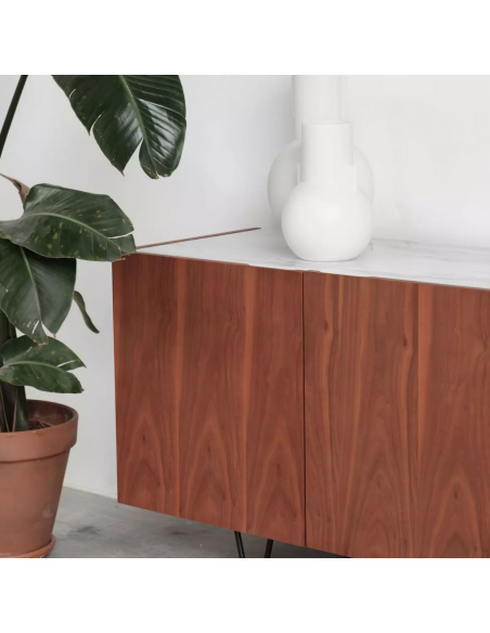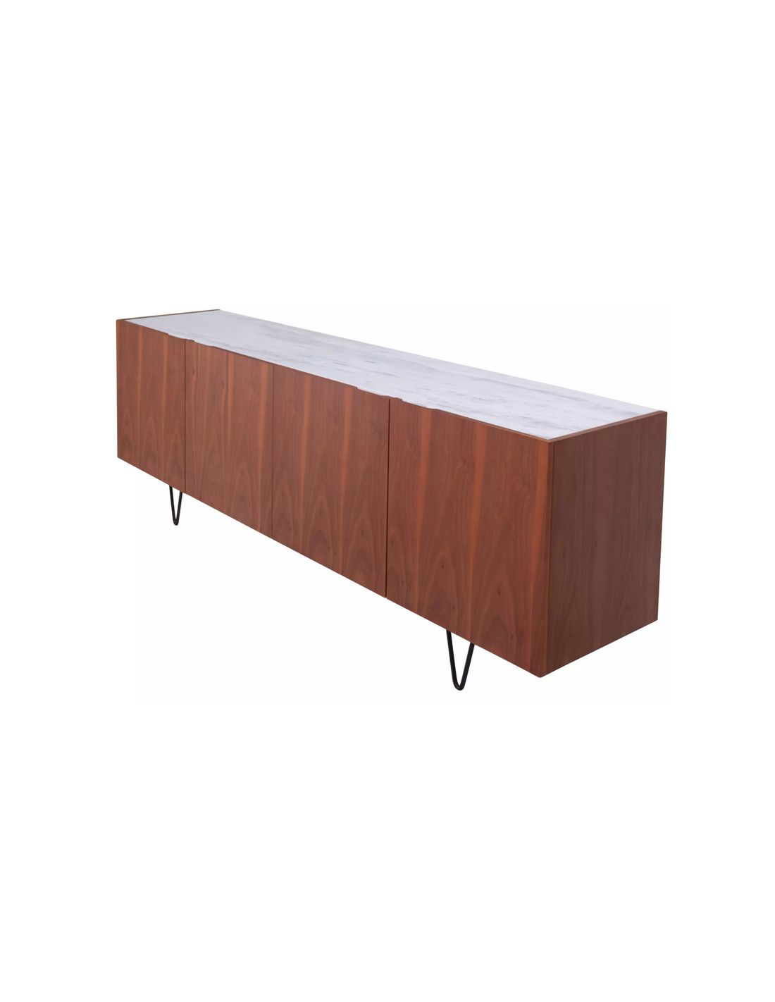 Sideboard udført i et design af sortlakeret metal, hvid marmor og valnøddefinér. Sideboardet har justérbare hylder i hvert af de 2 dobbeltrum. Møblet måler 71 cm i højden og 200 x 45 cm i bredde og dybde.