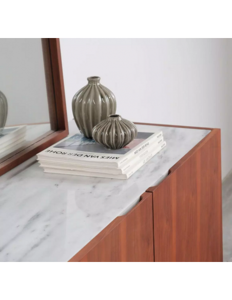 Pisa sideboard i metal, marmor og valnøddefinér H71 x B200 x D45 cm - Sort/Valnød/Hvid marmor