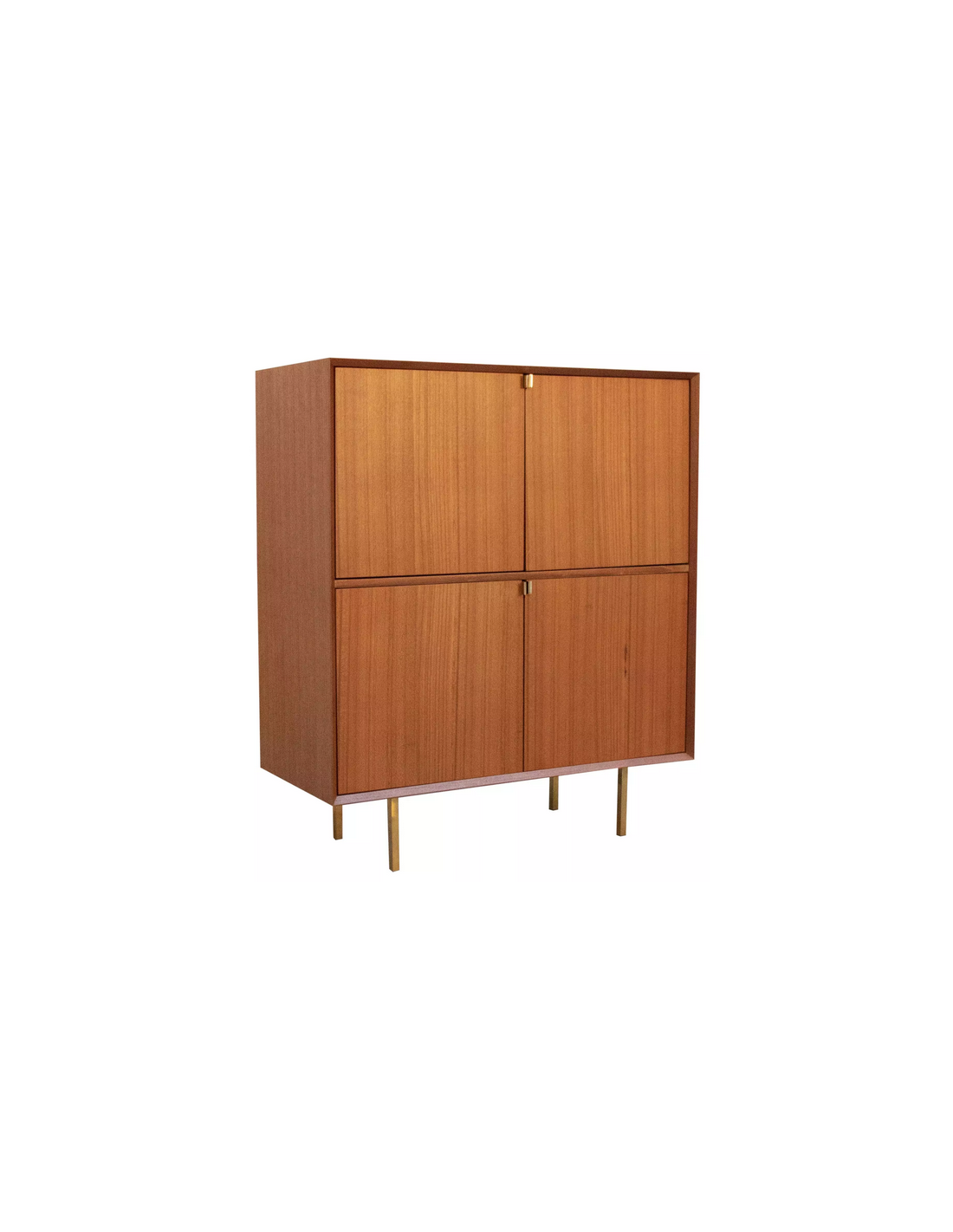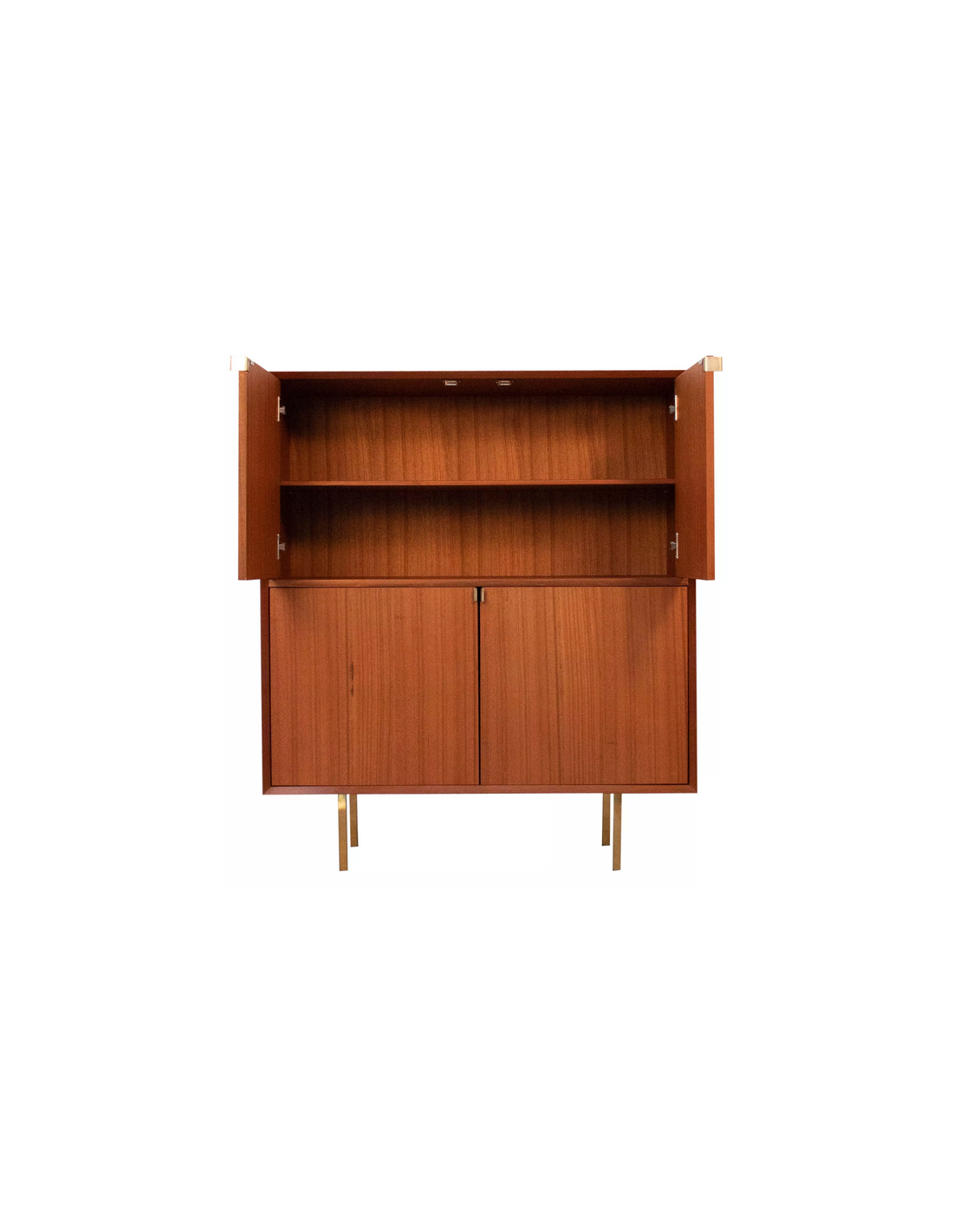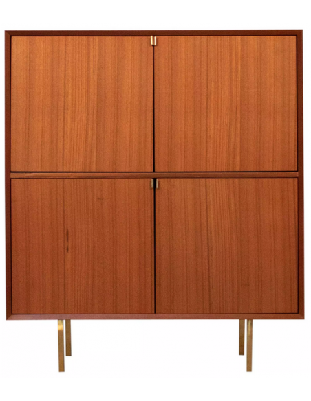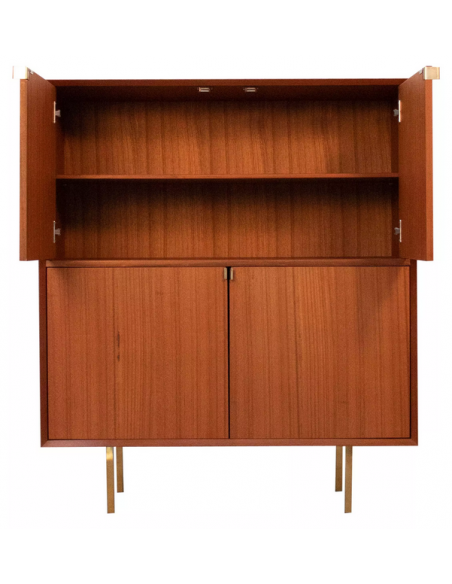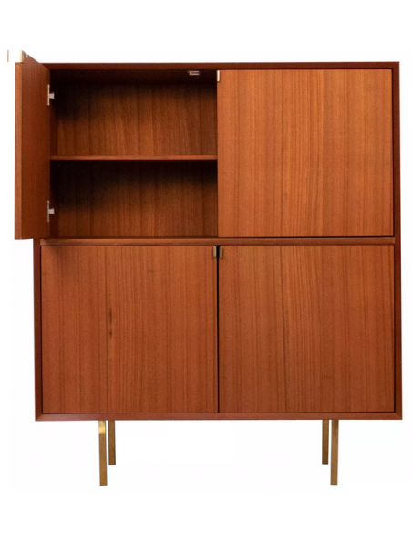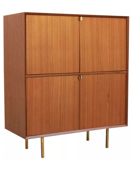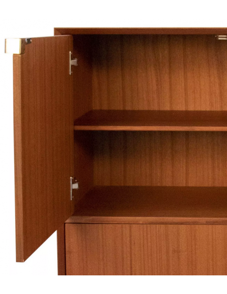 Highboard udført i et design af guldfarvet metal og teaktræsfinér. Møblet har 1 hylde i hvert af de 2 dobbeltrum. Møblet måler 119 cm i højden og 100 x 45 cm i bredde og dybde.