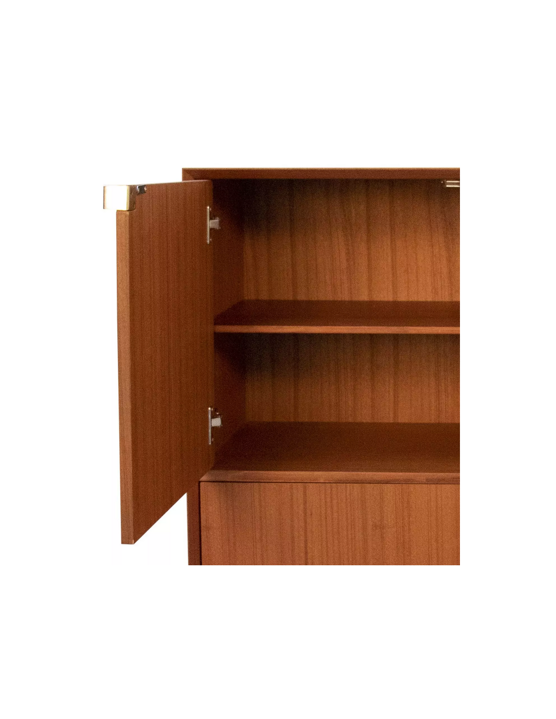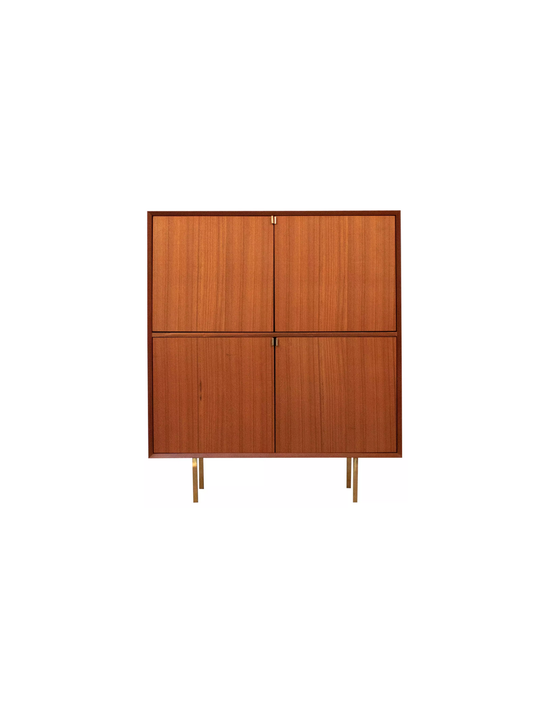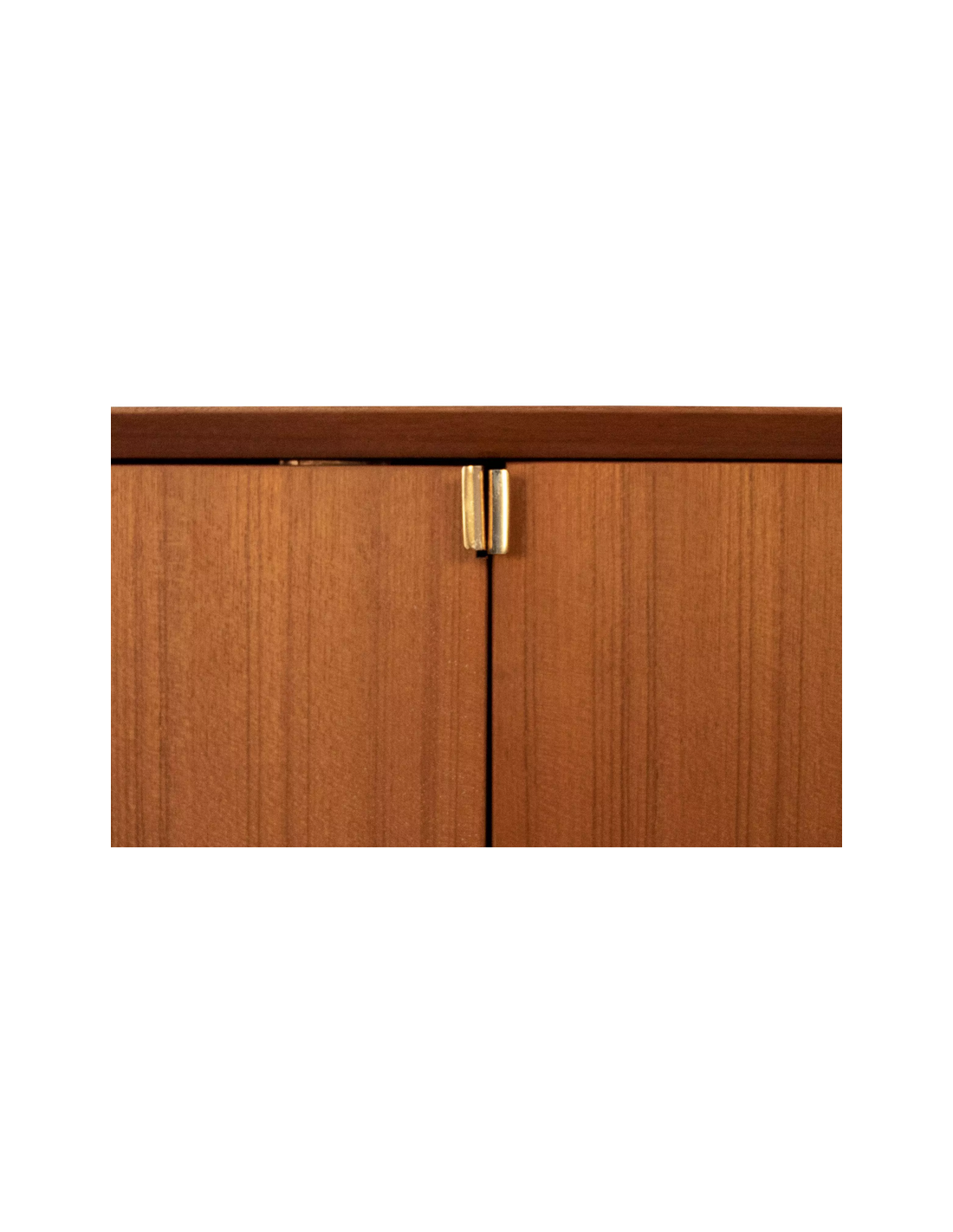 Highboard udført i et design af guldfarvet metal og teaktræsfinér. Møblet har 1 hylde i hvert af de 2 dobbeltrum. Møblet måler 119 cm i højden og 100 x 45 cm i bredde og dybde.