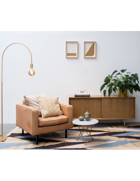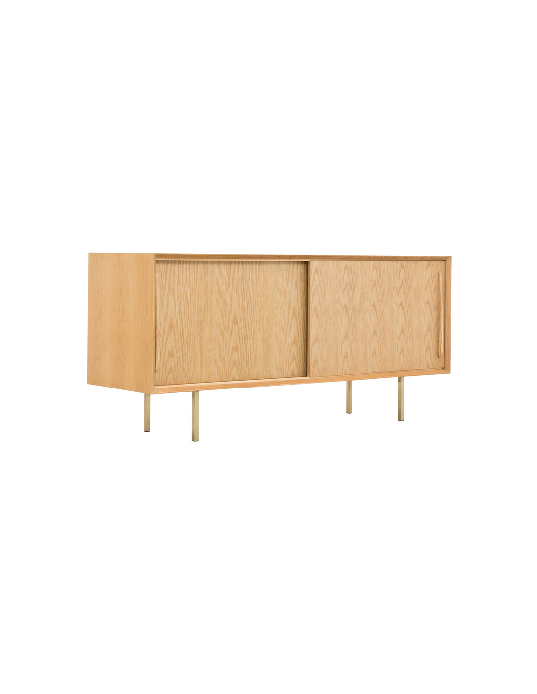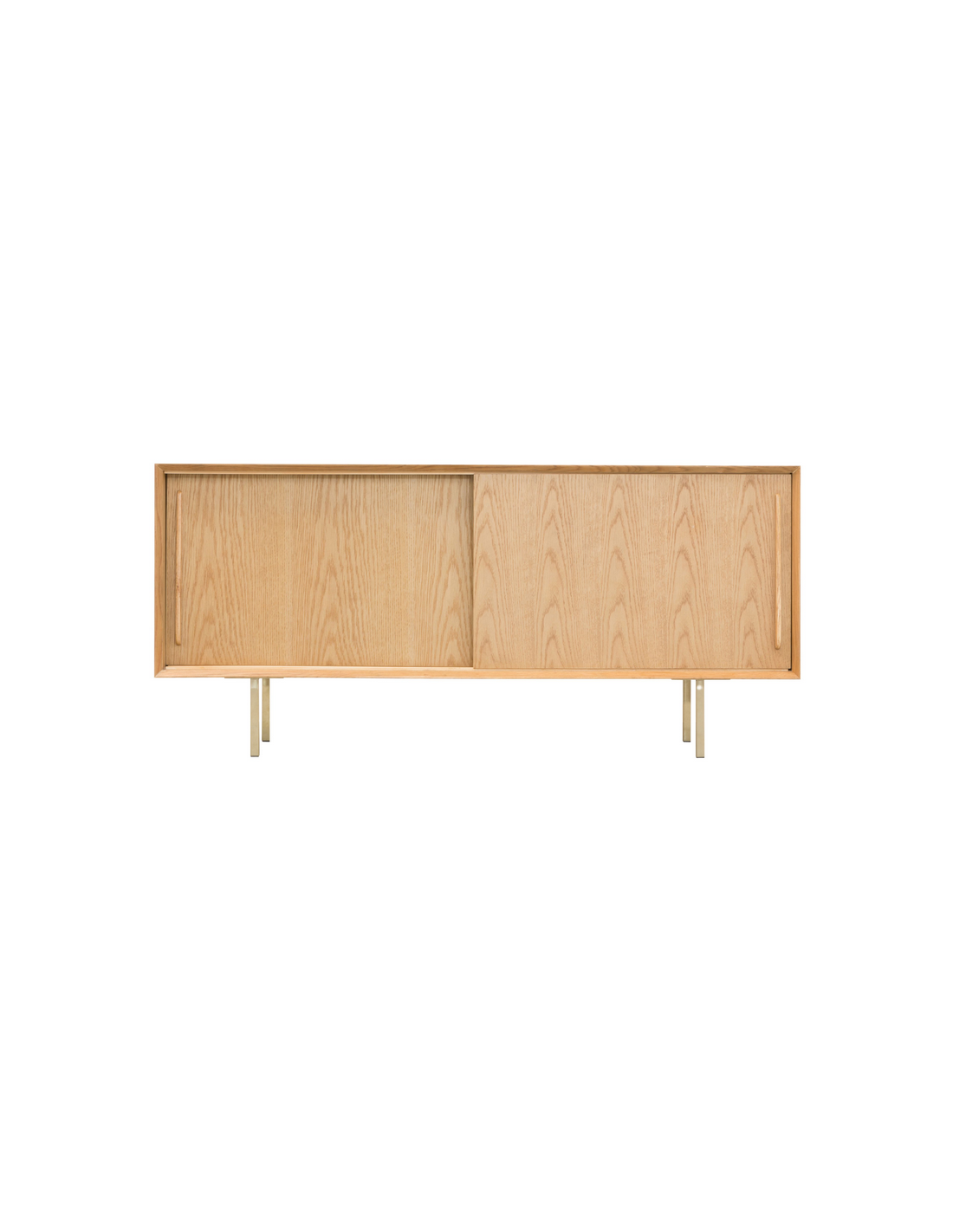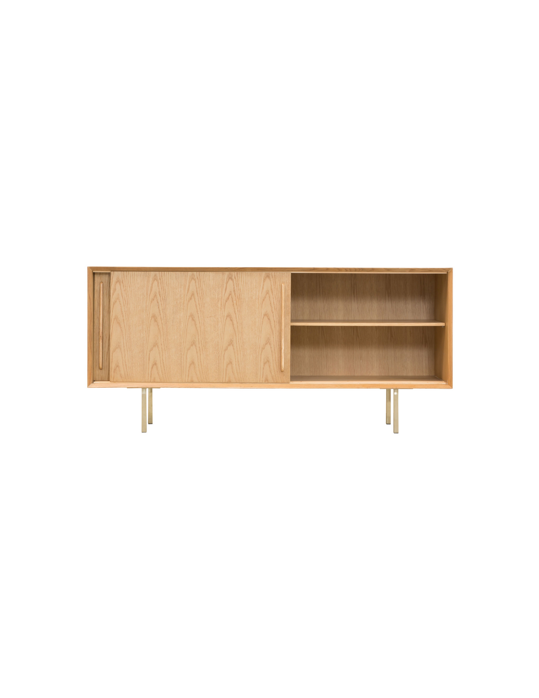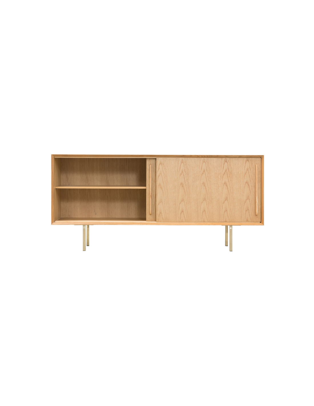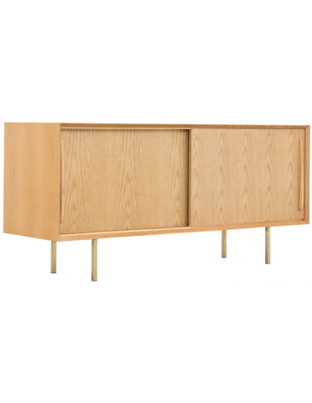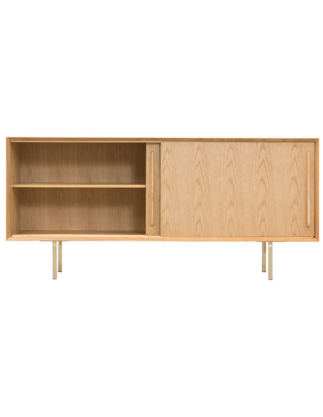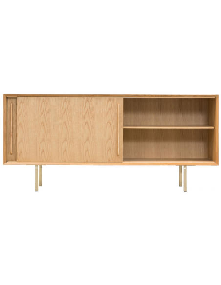 Sideboard udført i et design af guldfarvet metal og egetræsfinér. Sideboardet har justérbar hylde i hvert af de 2 rum, samt skydelåger. Møblet måler 69 cm i højden og 150 x 45 cm i bredde og dybde.