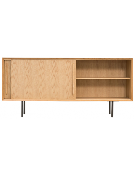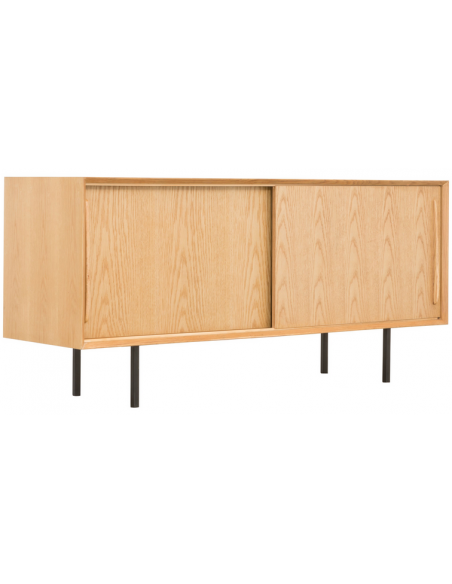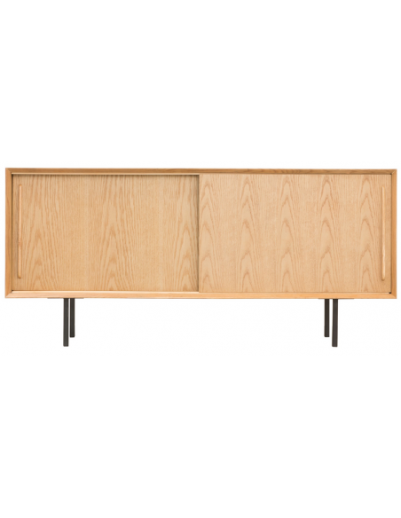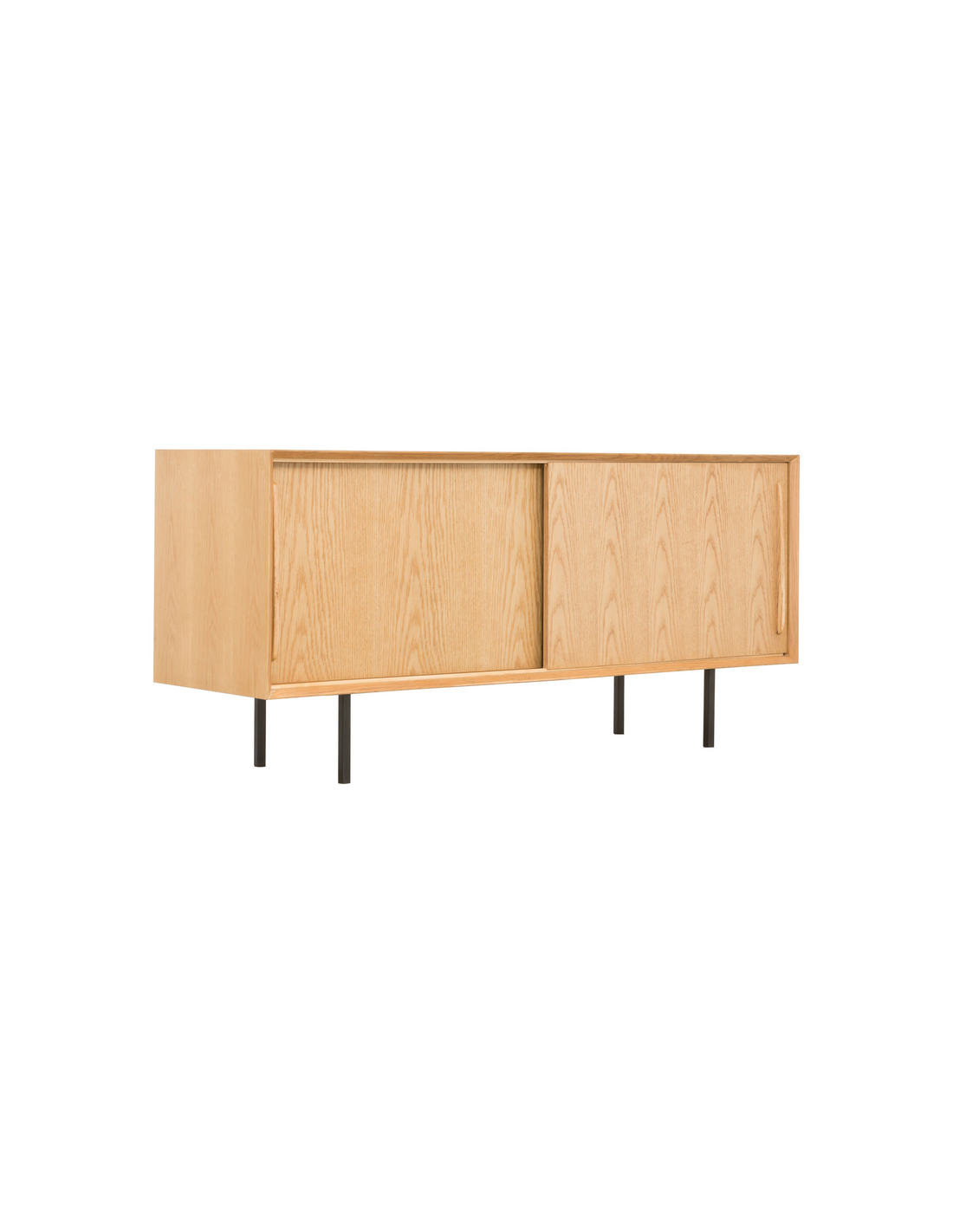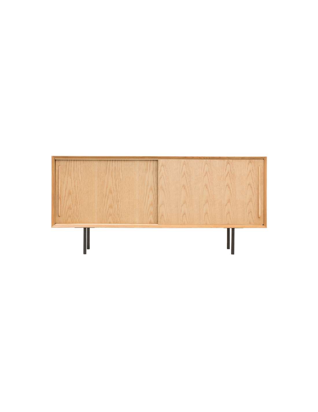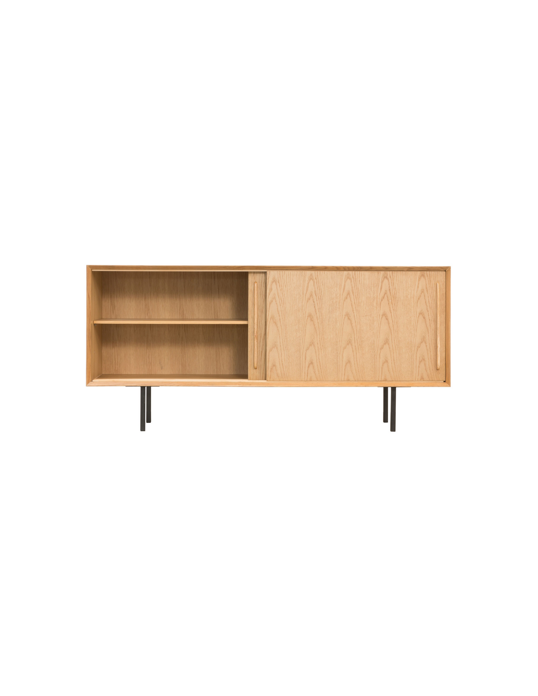 Sideboard udført i et design af sortlakeret metal og egetræsfinér. Sideboardet har justérbar hylde i hvert af de 2 rum, samt skydelåger. Møblet måler 69 cm i højden og 150 x 45 cm i bredde og dybde.