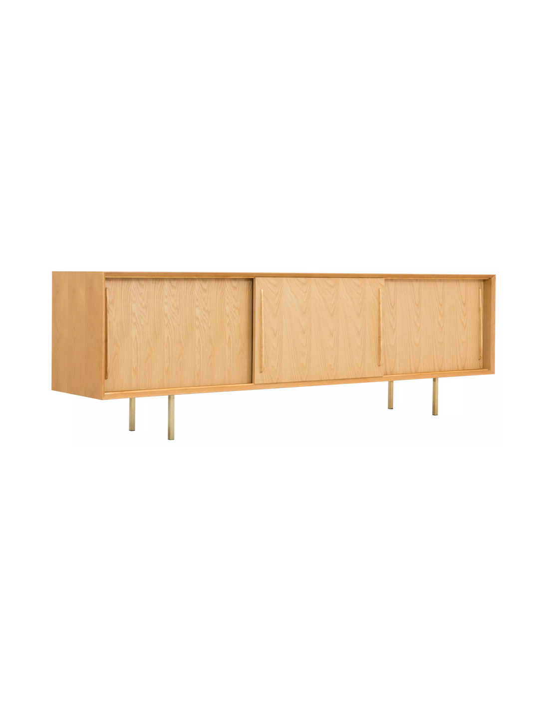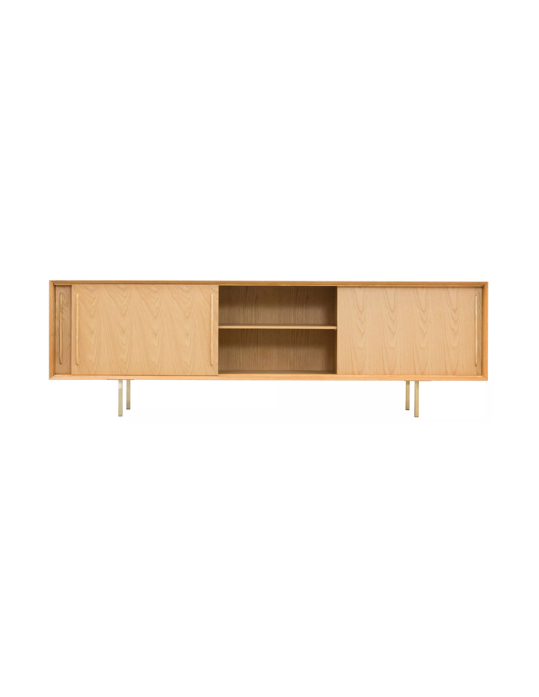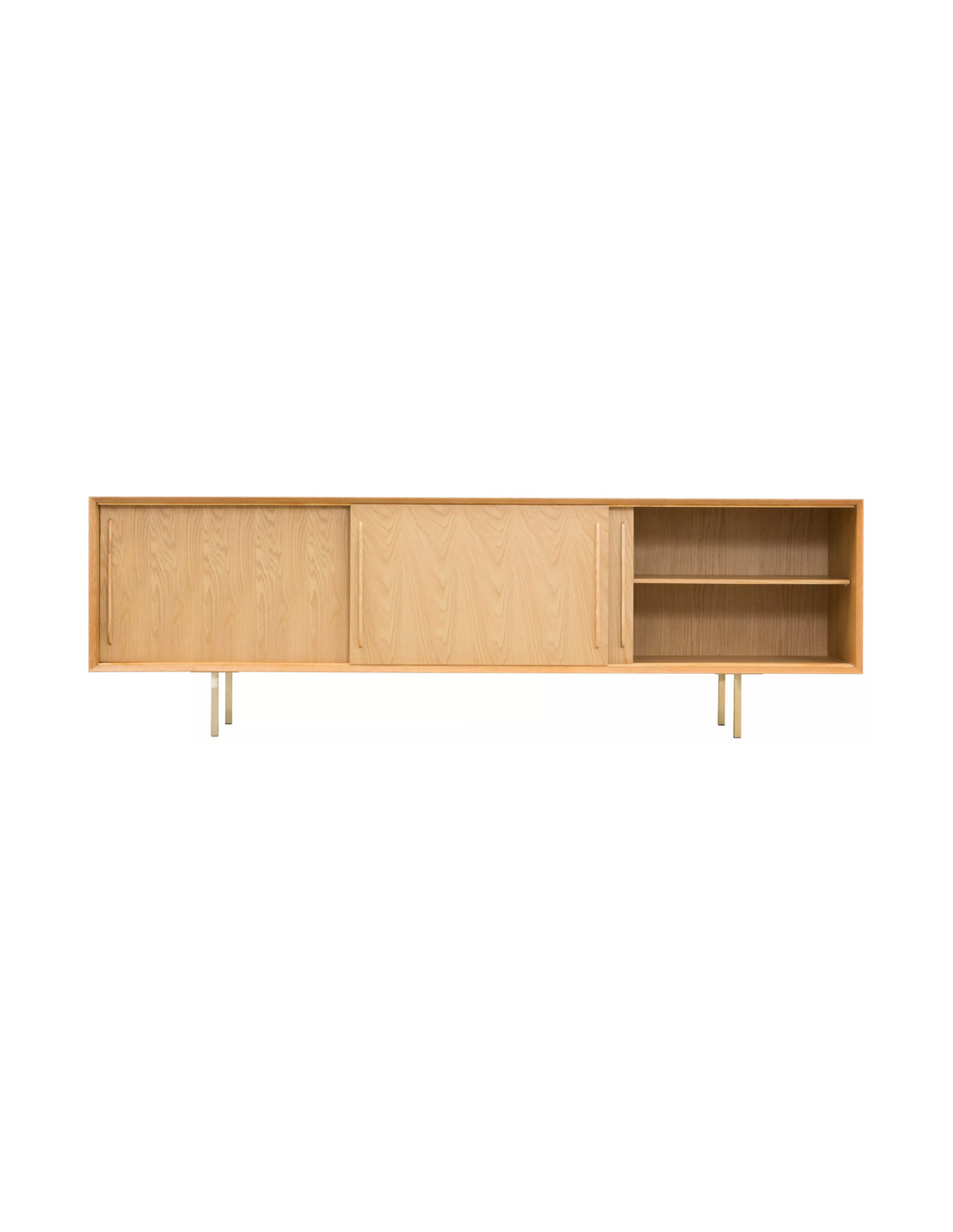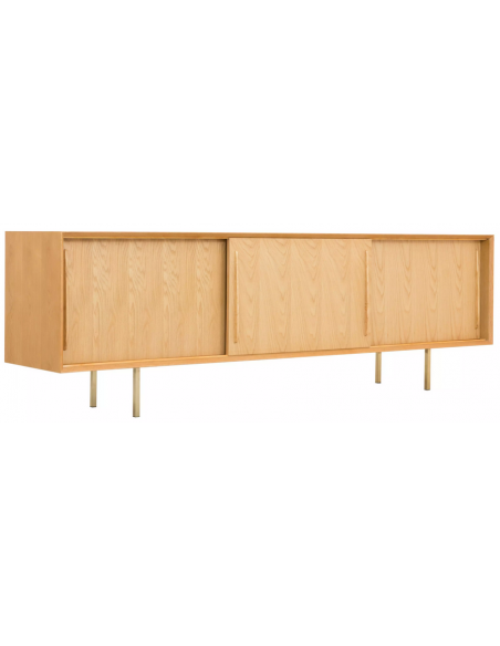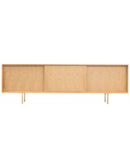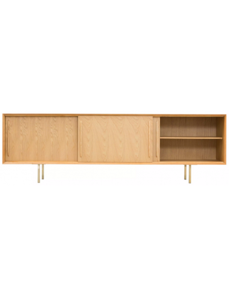 Sideboard udført i et design af guldfarvet metal og egetræsfinér. Sideboardet har justérbar hylde i hvert af de 3 rum, samt skydelåger. Møblet måler 69 cm i højden og 220 x 45 cm i bredde og dybde.