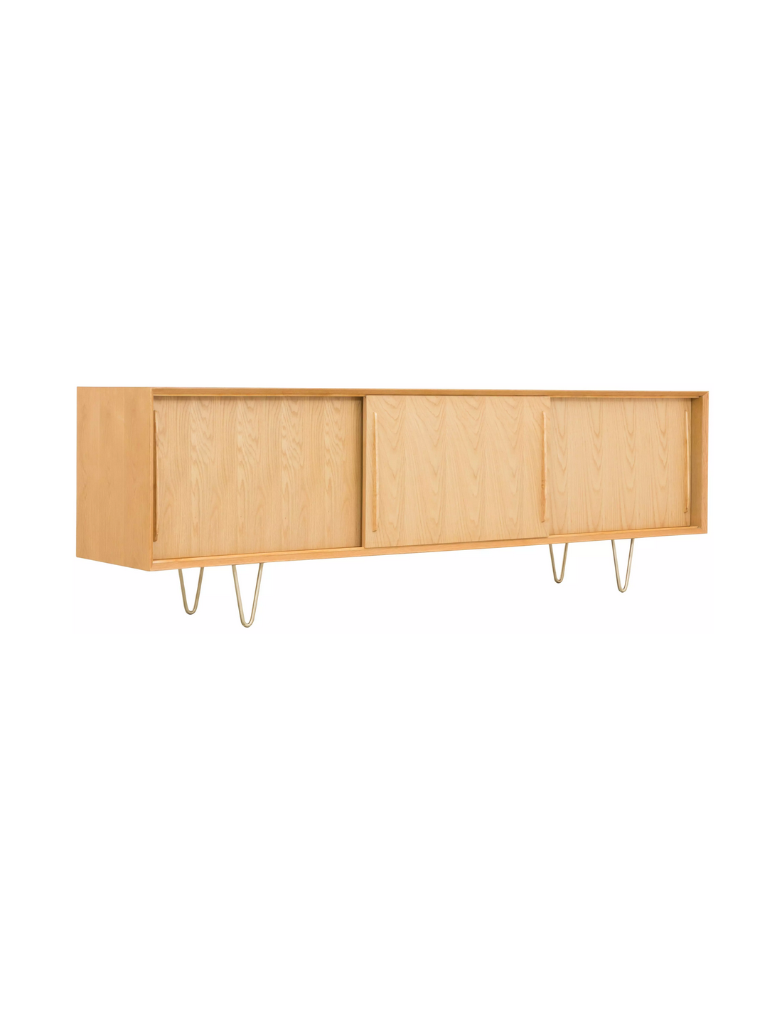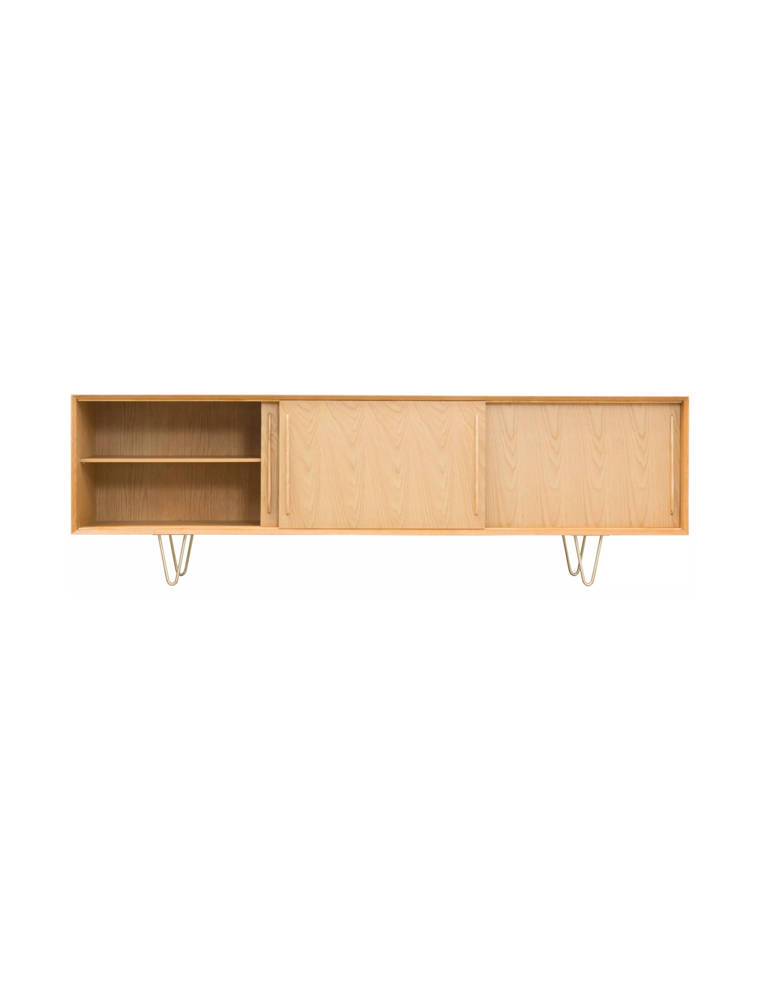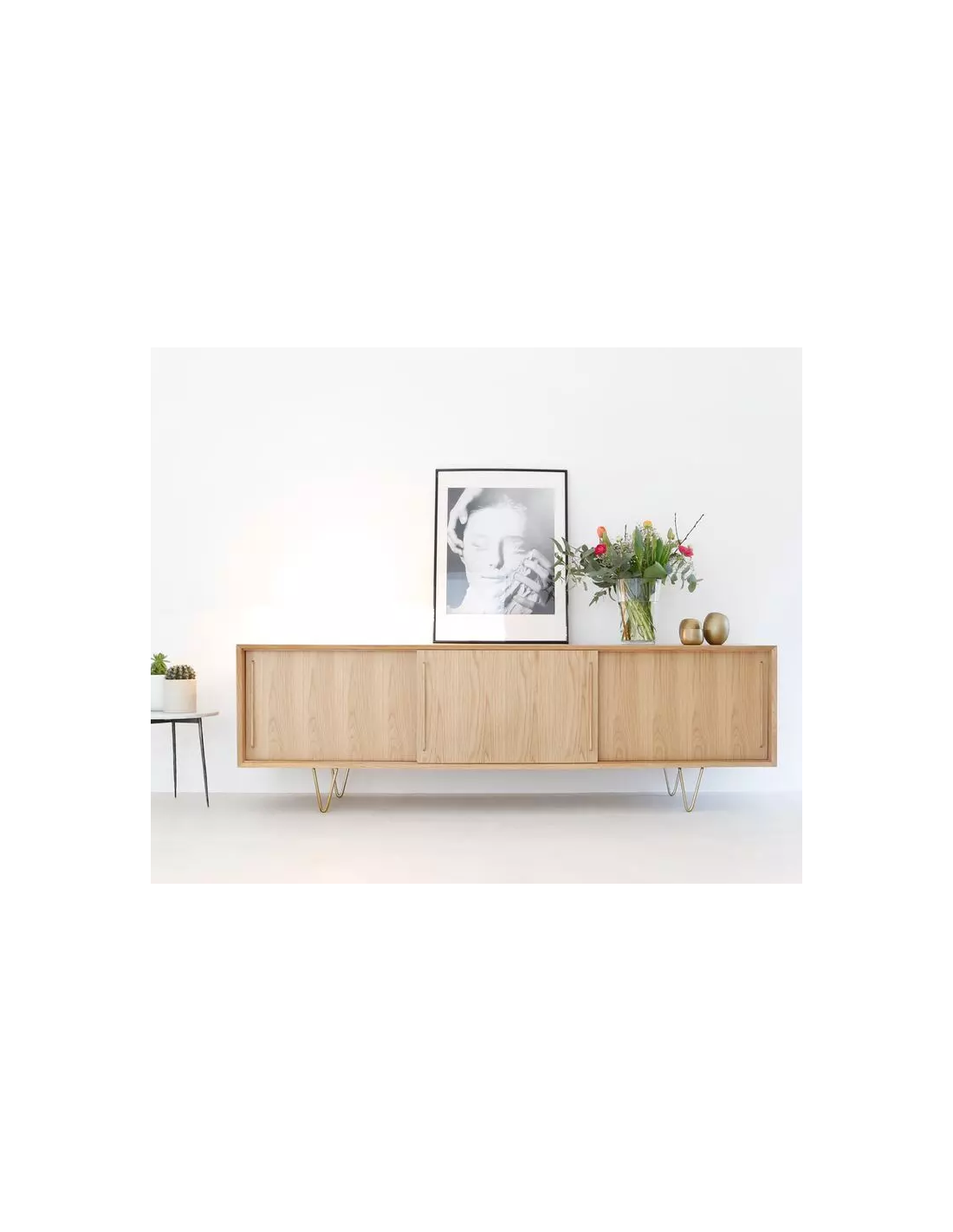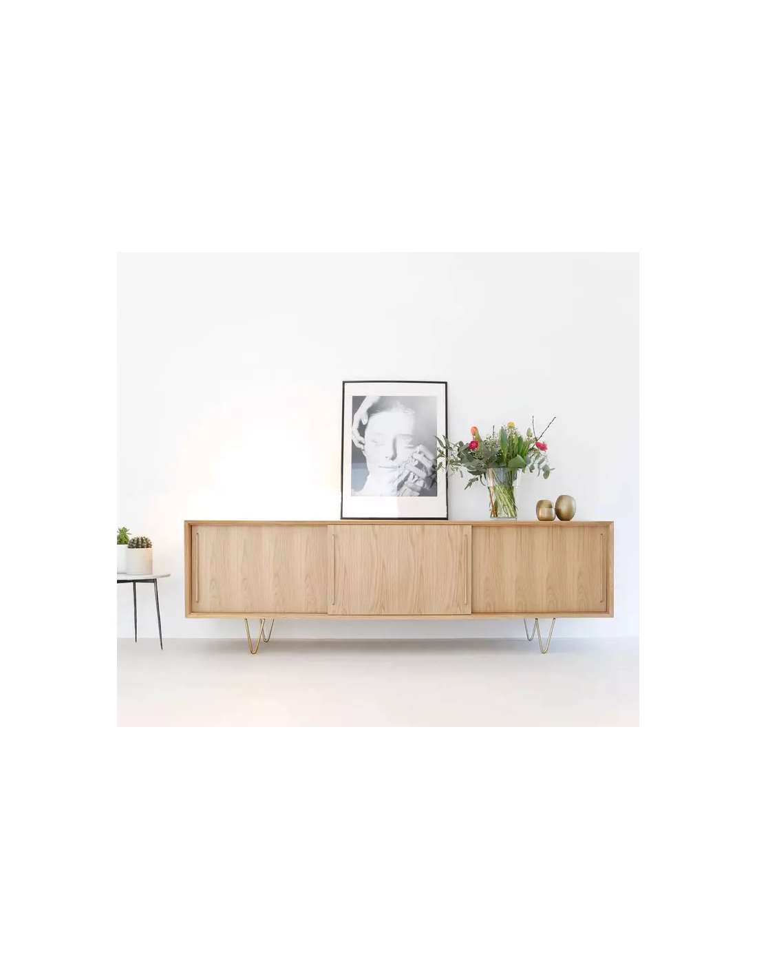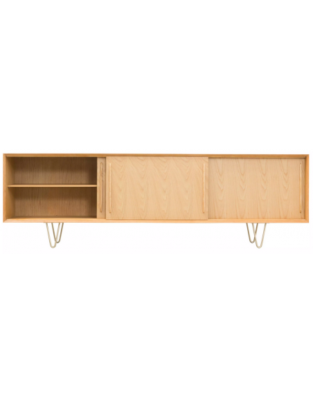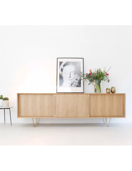 Sideboard udført i et design af guldfarvet metal og egetræsfinér. Sideboardet har justérbar hylde i hvert af de 3 rum, samt skydelåger. Møblet måler 69 cm i højden og 220 x 45 cm i bredde og dybde.