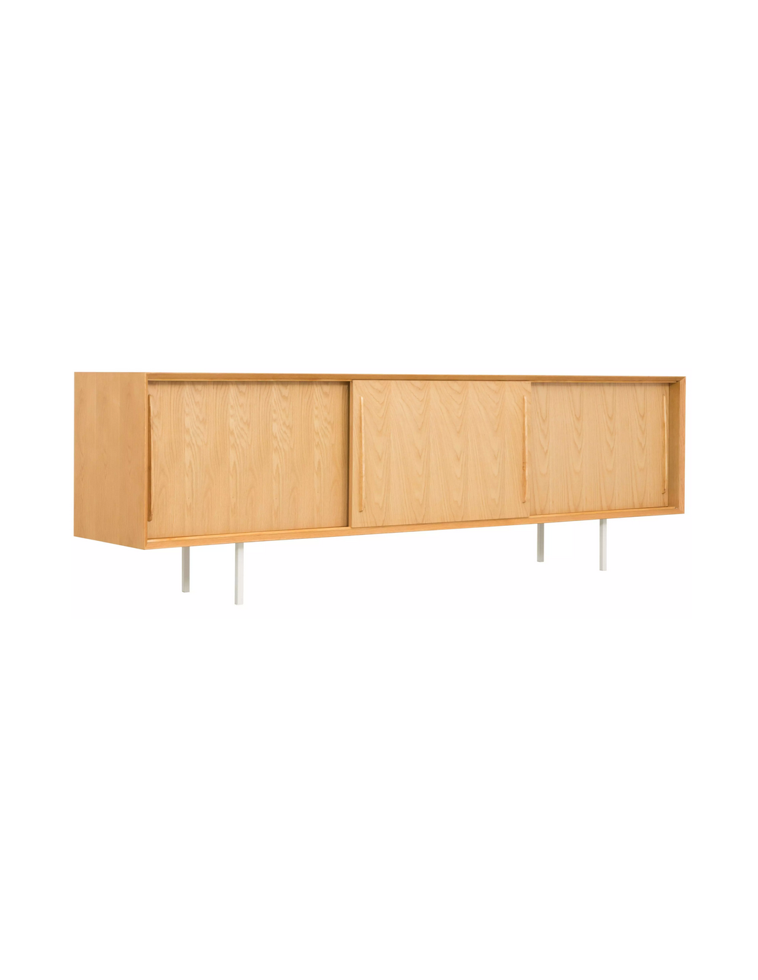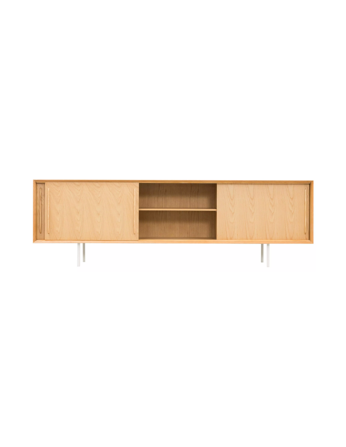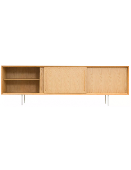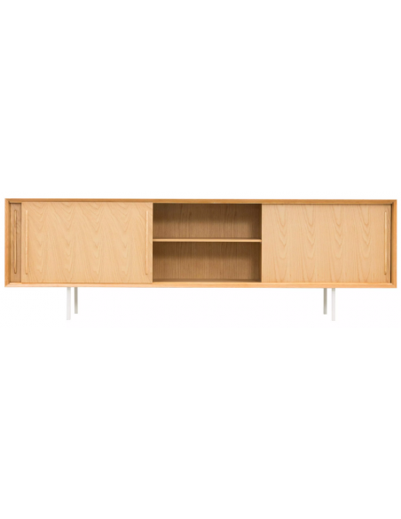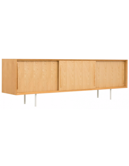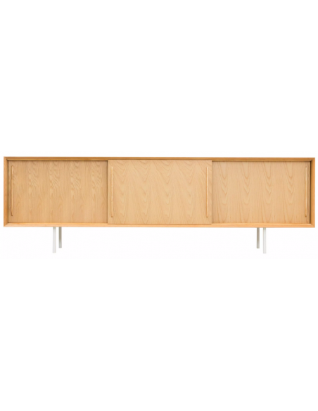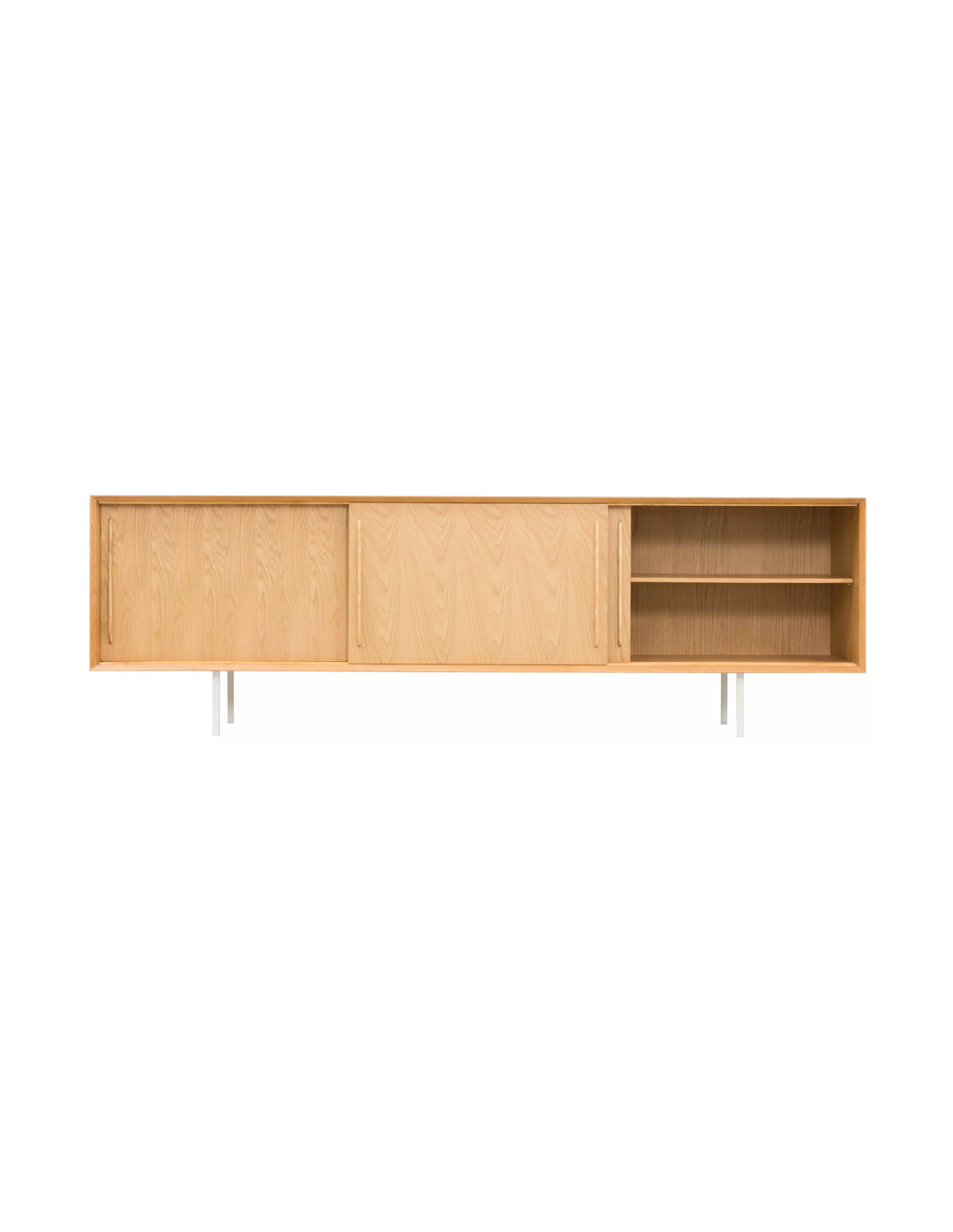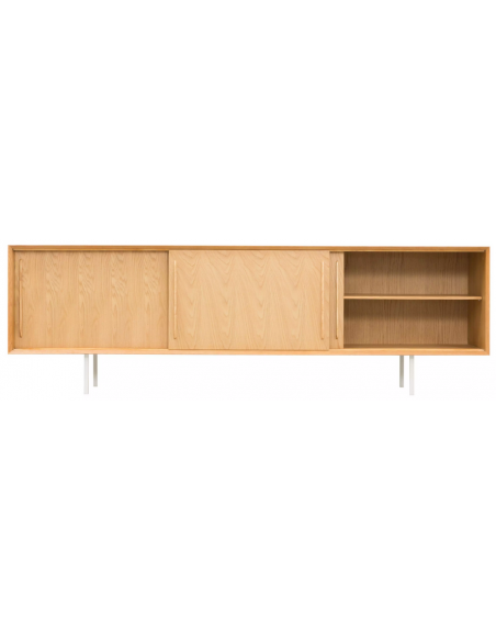 Sideboard udført i et design af hvidlakeret metal og egetræsfinér. Sideboardet har justérbar hylde i hvert af de 3 rum, samt skydelåger. Møblet måler 69 cm i højden og 220 x 45 cm i bredde og dybde.