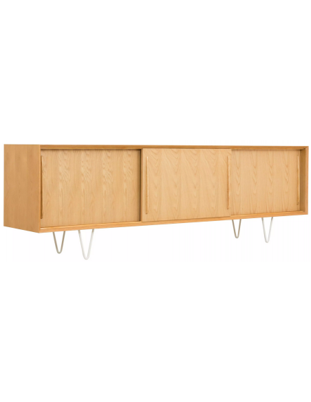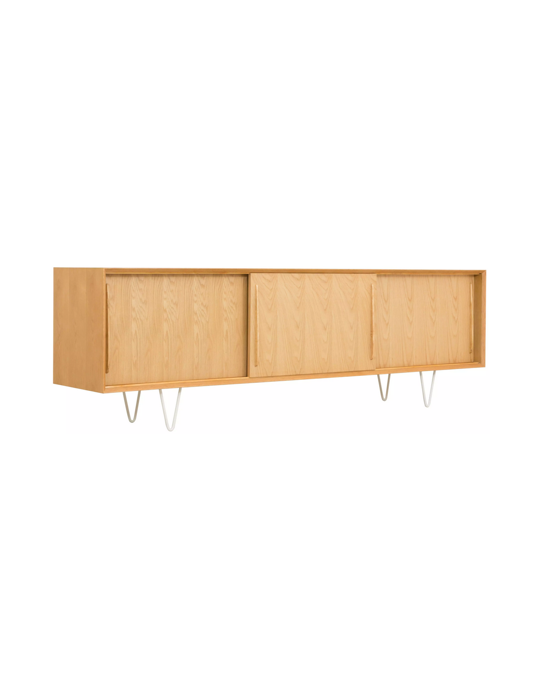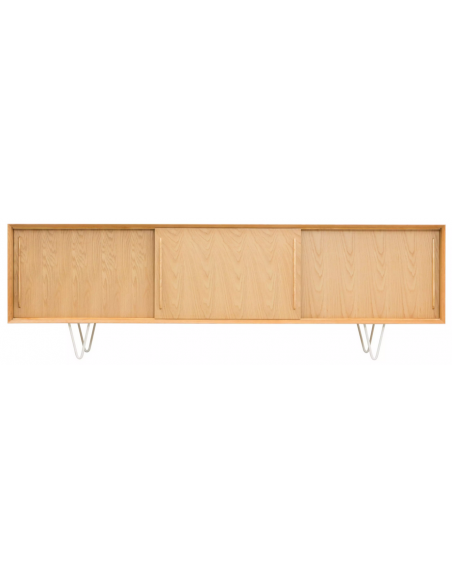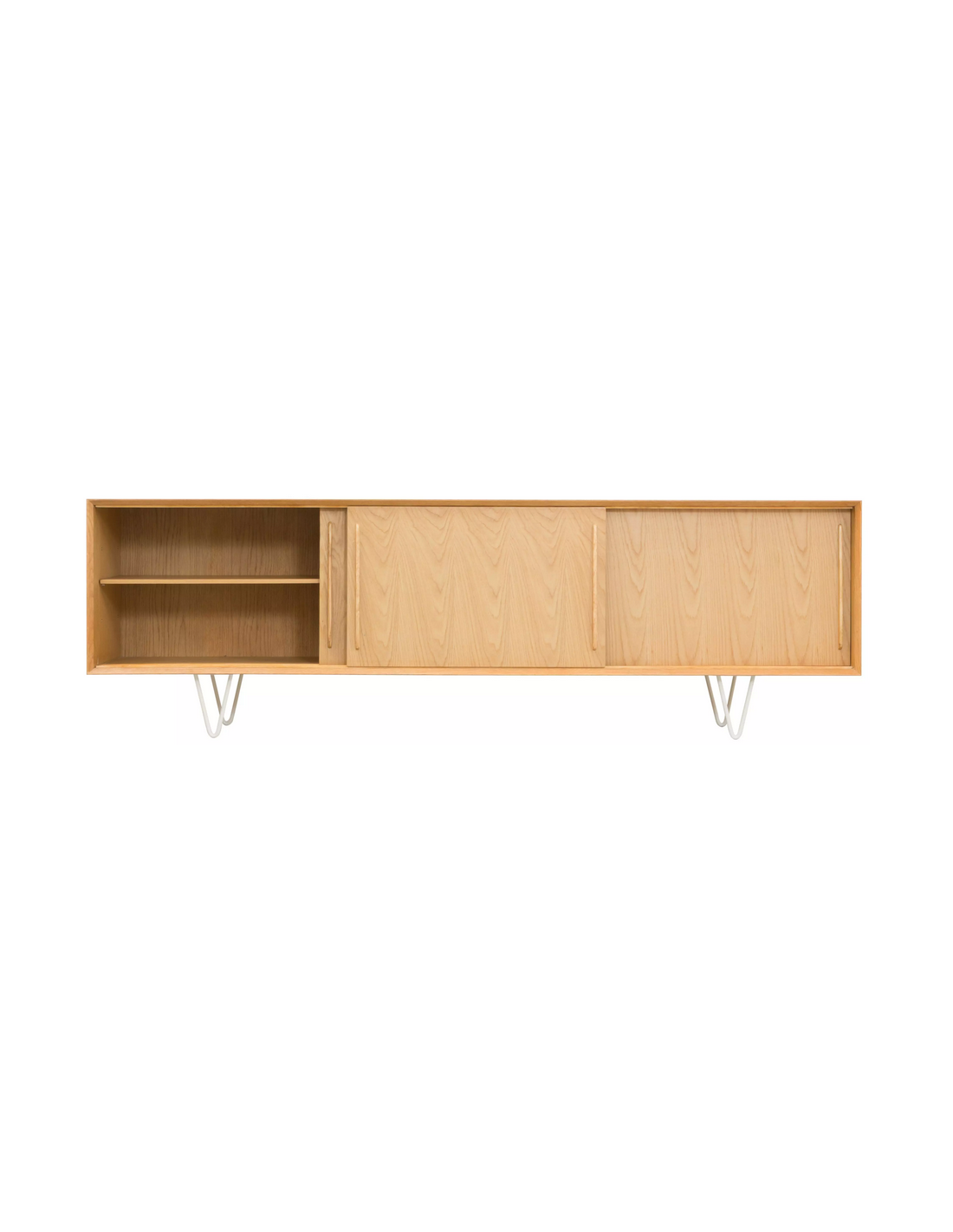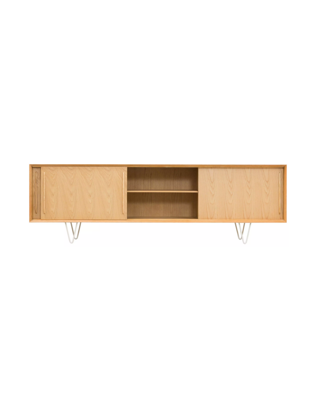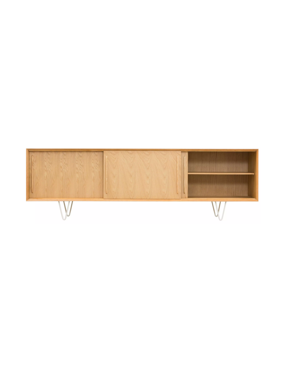 Sideboard udført i et design af hvidlakeret metal og egetræsfinér. Sideboardet har justérbar hylde i hvert af de 3 rum, samt skydelåger. Møblet måler 69 cm i højden og 220 x 45 cm i bredde og dybde.