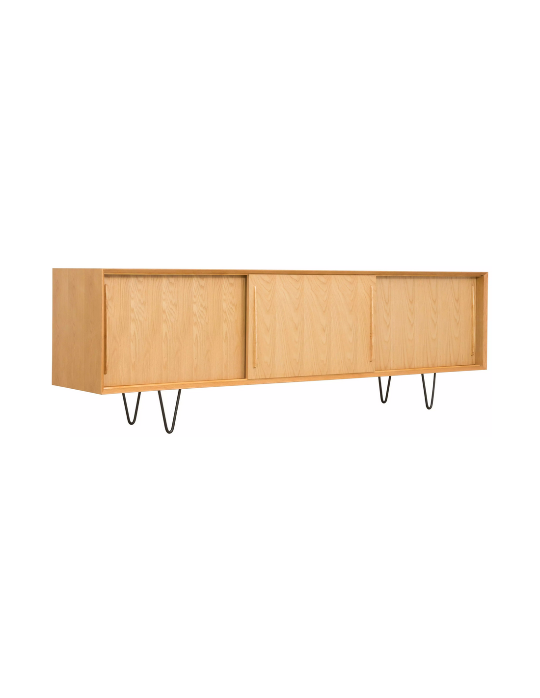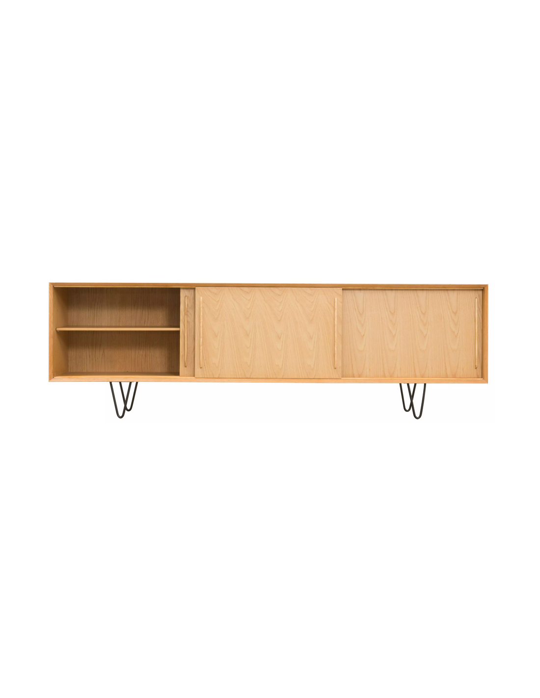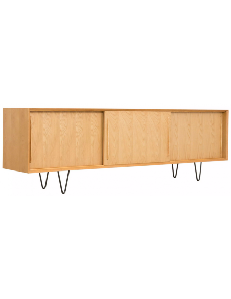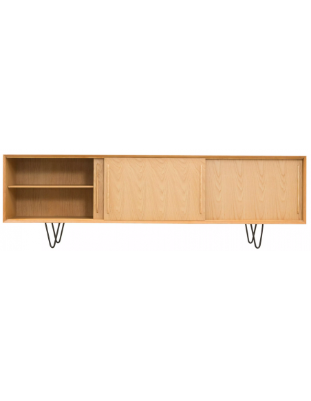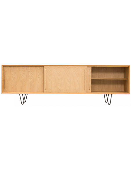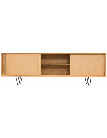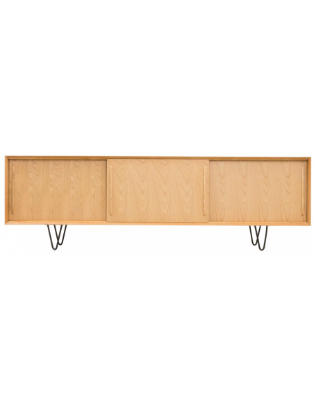 Sideboard udført i et design af sortlakeret metal og egetræsfinér. Sideboardet har justérbar hylde i hvert af de 3 rum, samt skydelåger. Møblet måler 69 cm i højden og 220 x 45 cm i bredde og dybde.