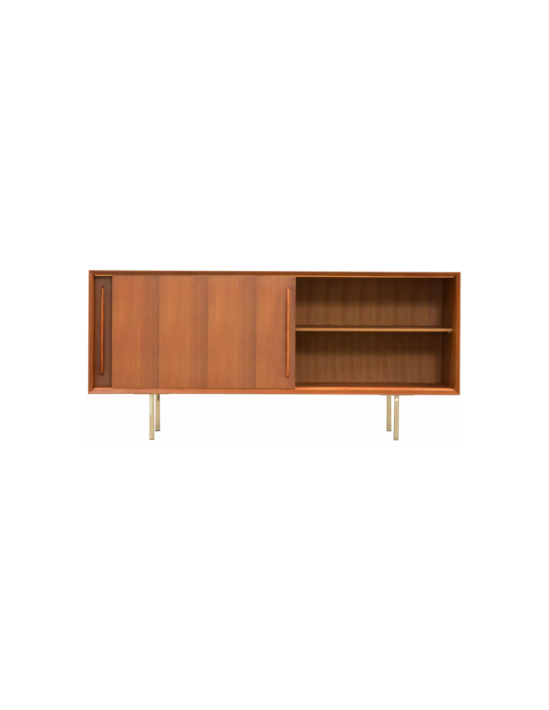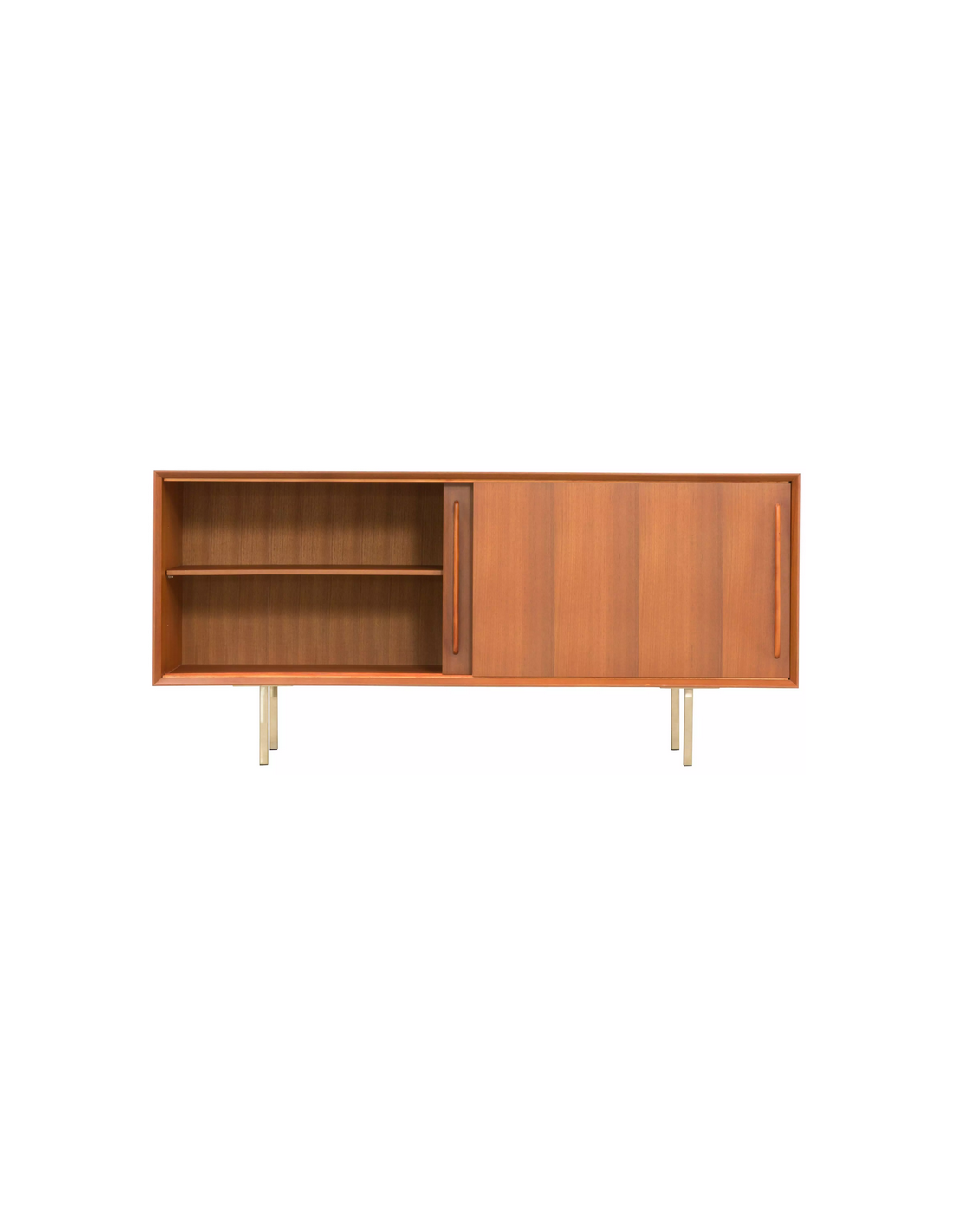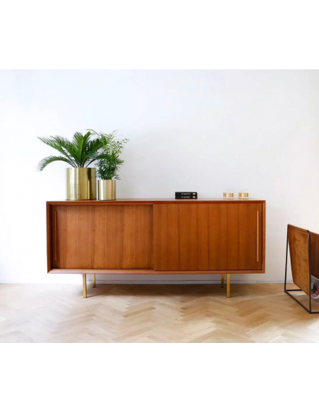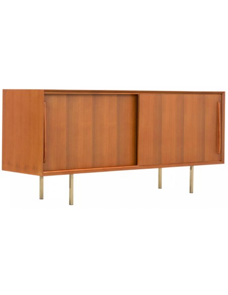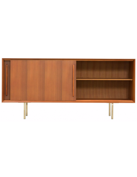 Sideboard udført i et design af guldfarvet metal og teaktræsfinér. Sideboardet har justérbar hylde i hvert af de 2 rum, samt skydelåger. Møblet måler 69 cm i højden og 150 x 45 cm i bredde og dybde.